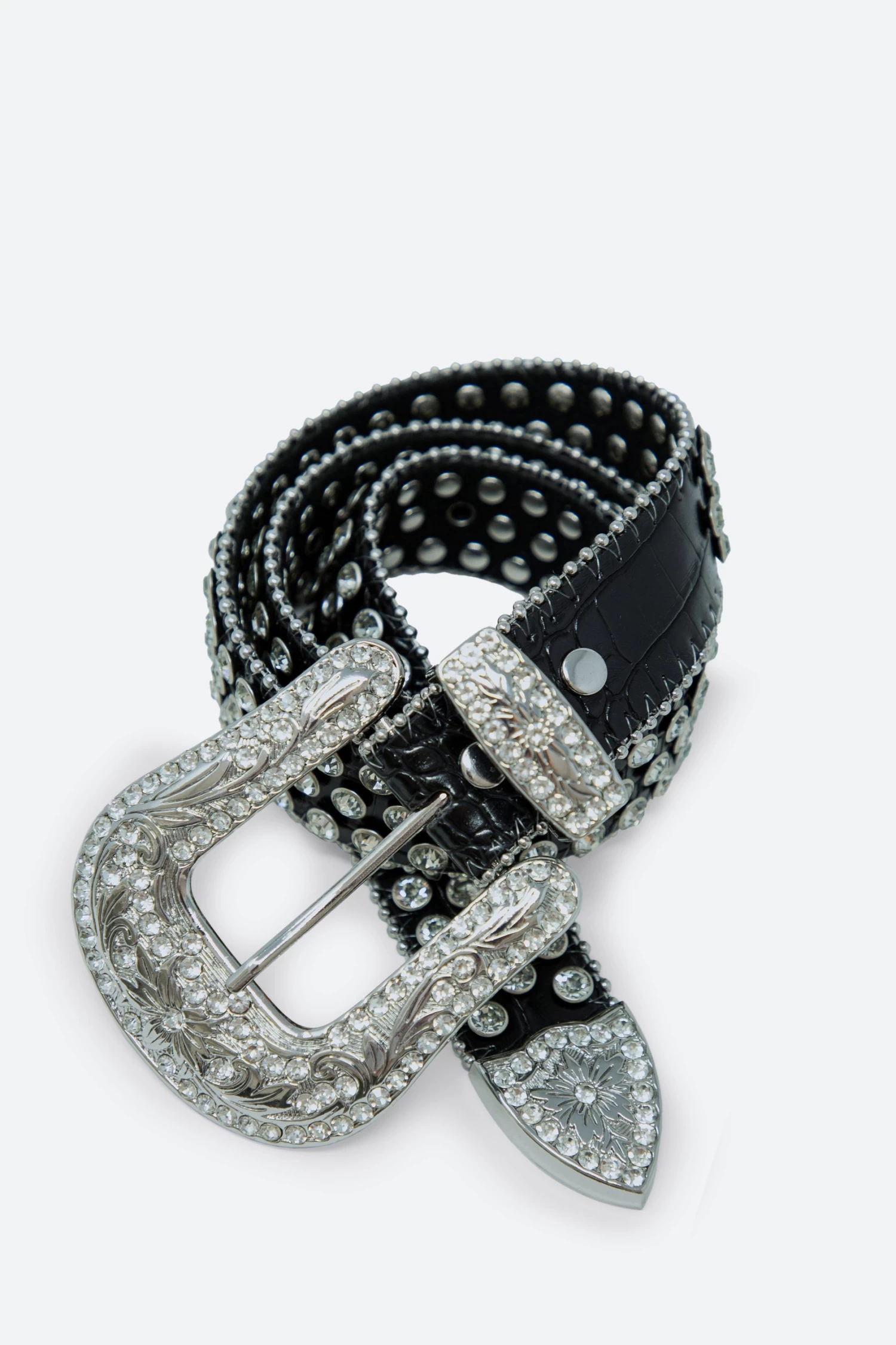 The All Over Rhinestone Studded Belt is made from black vegan leather and features intricate Western design motifs on the metal buckle, end tip and loop, with red rhinestone embellishment throughout.