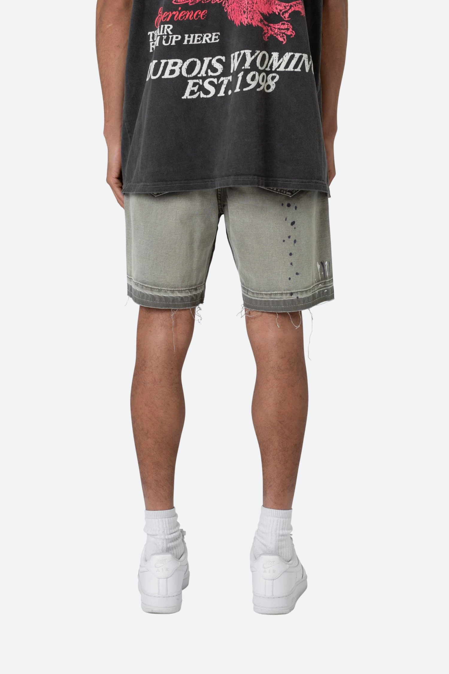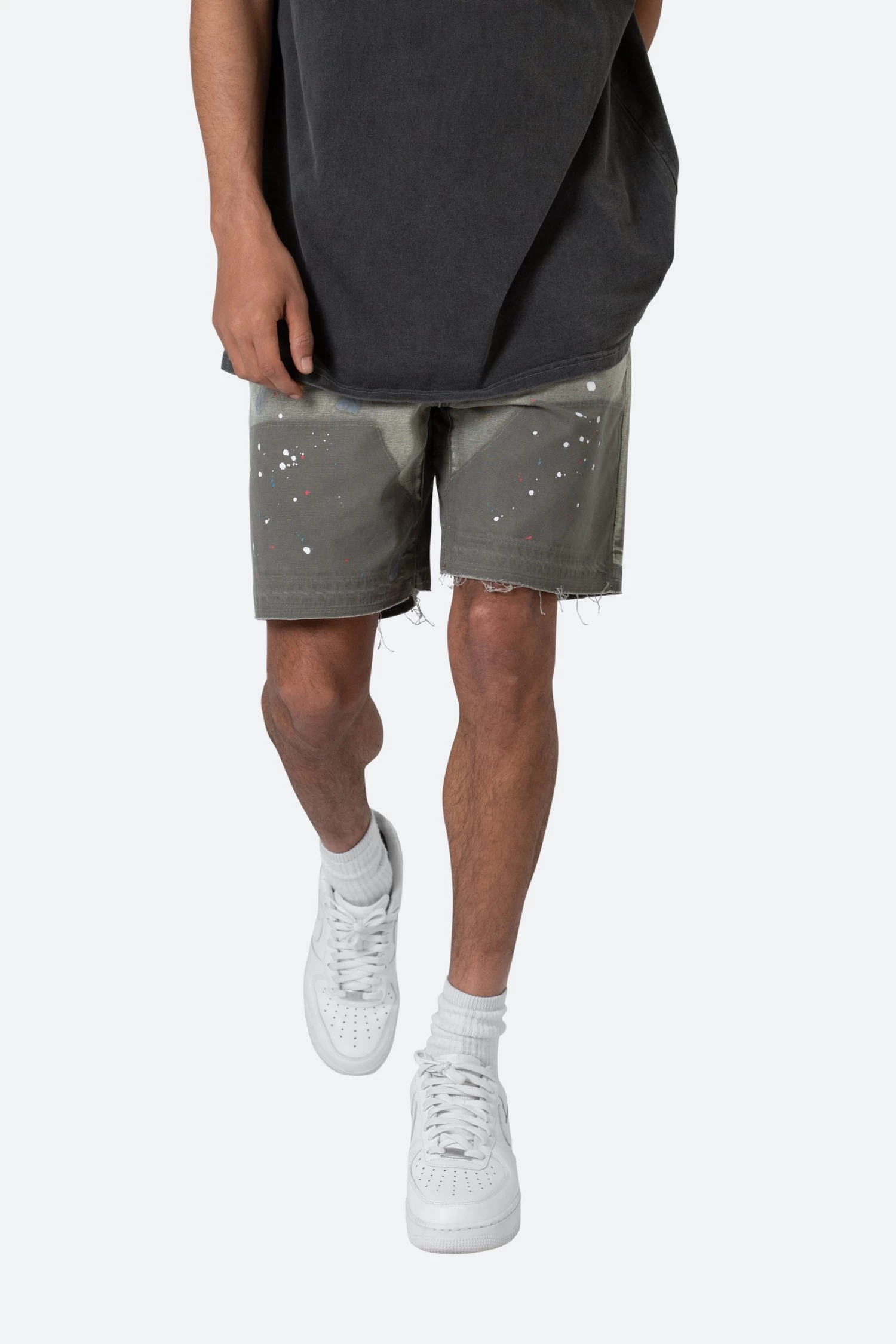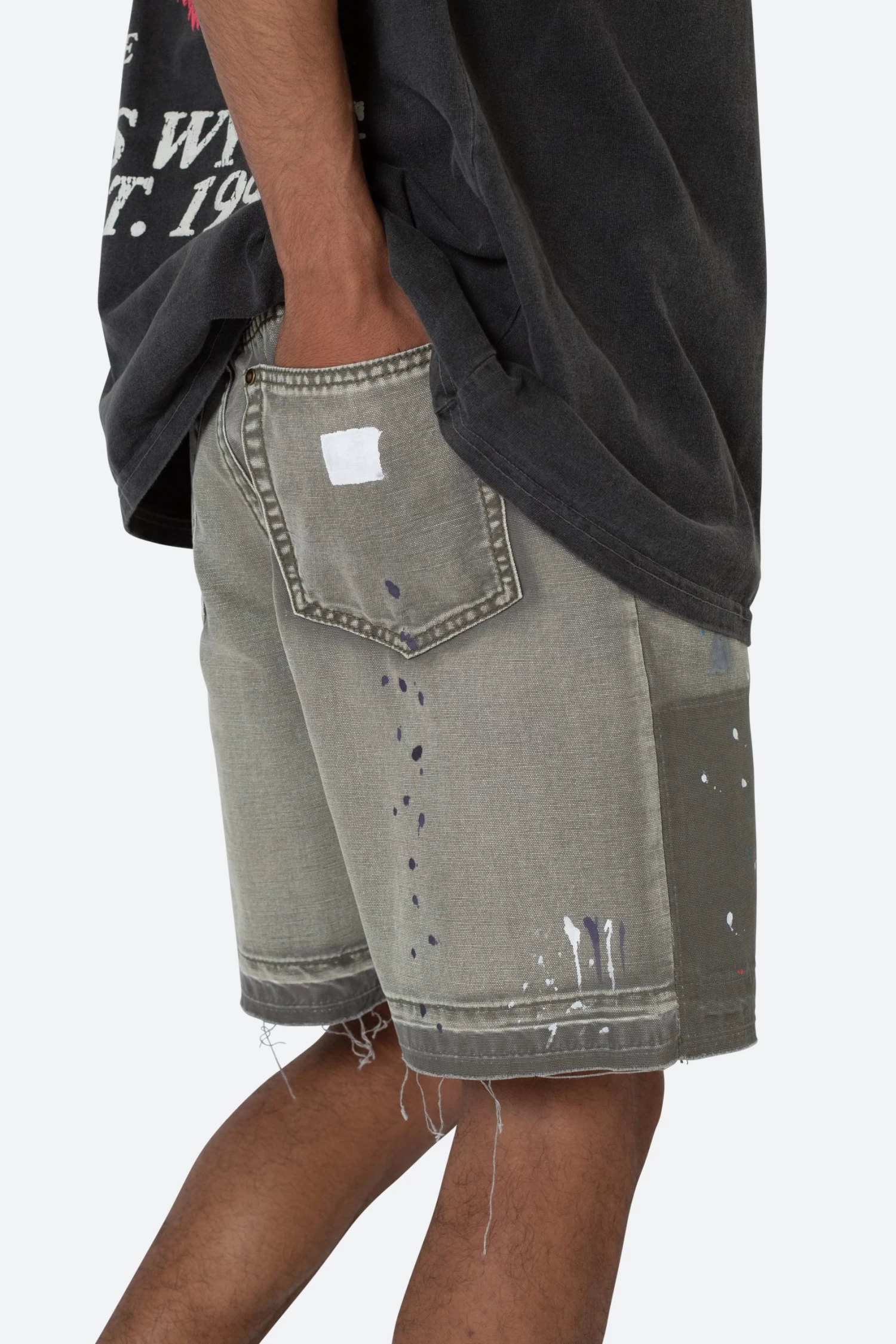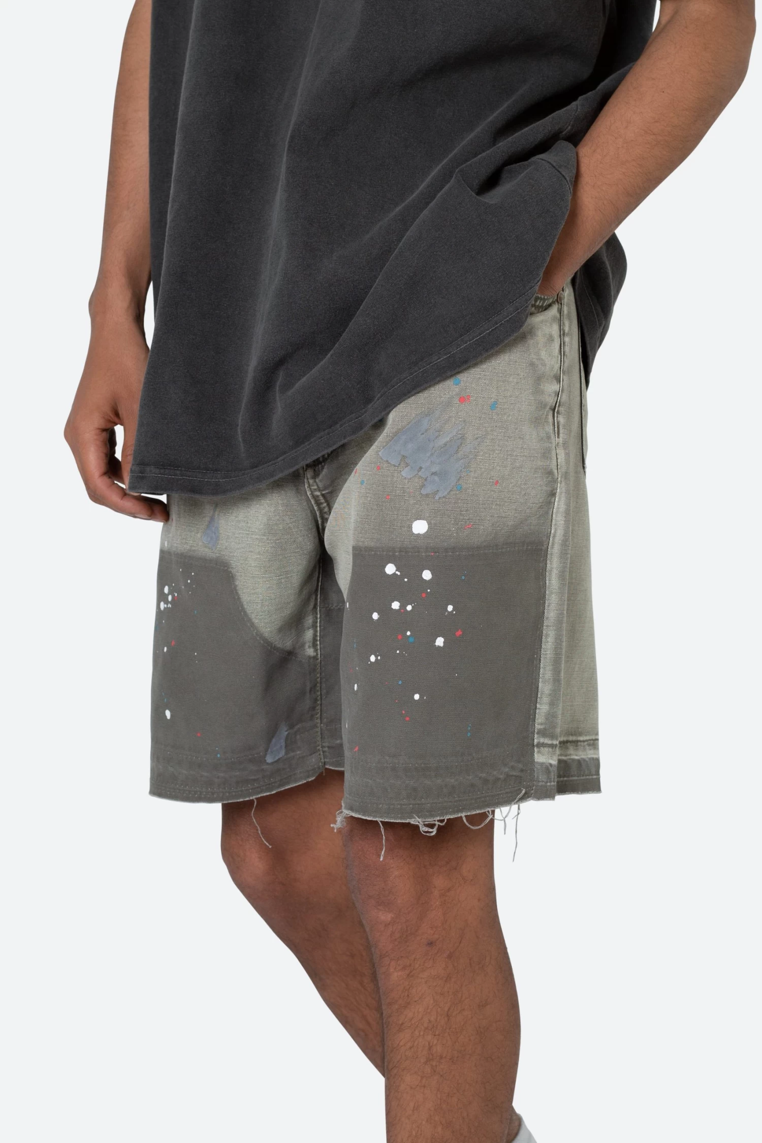 the B243 Denim Shorts are designed with a relaxed fit throughout, is constructed from washed brown duck twill, work pants panelling removed after wash for contrasting wash area, paint splatter throughout, and finished with a deconstructed hem and finished off with raw hem.