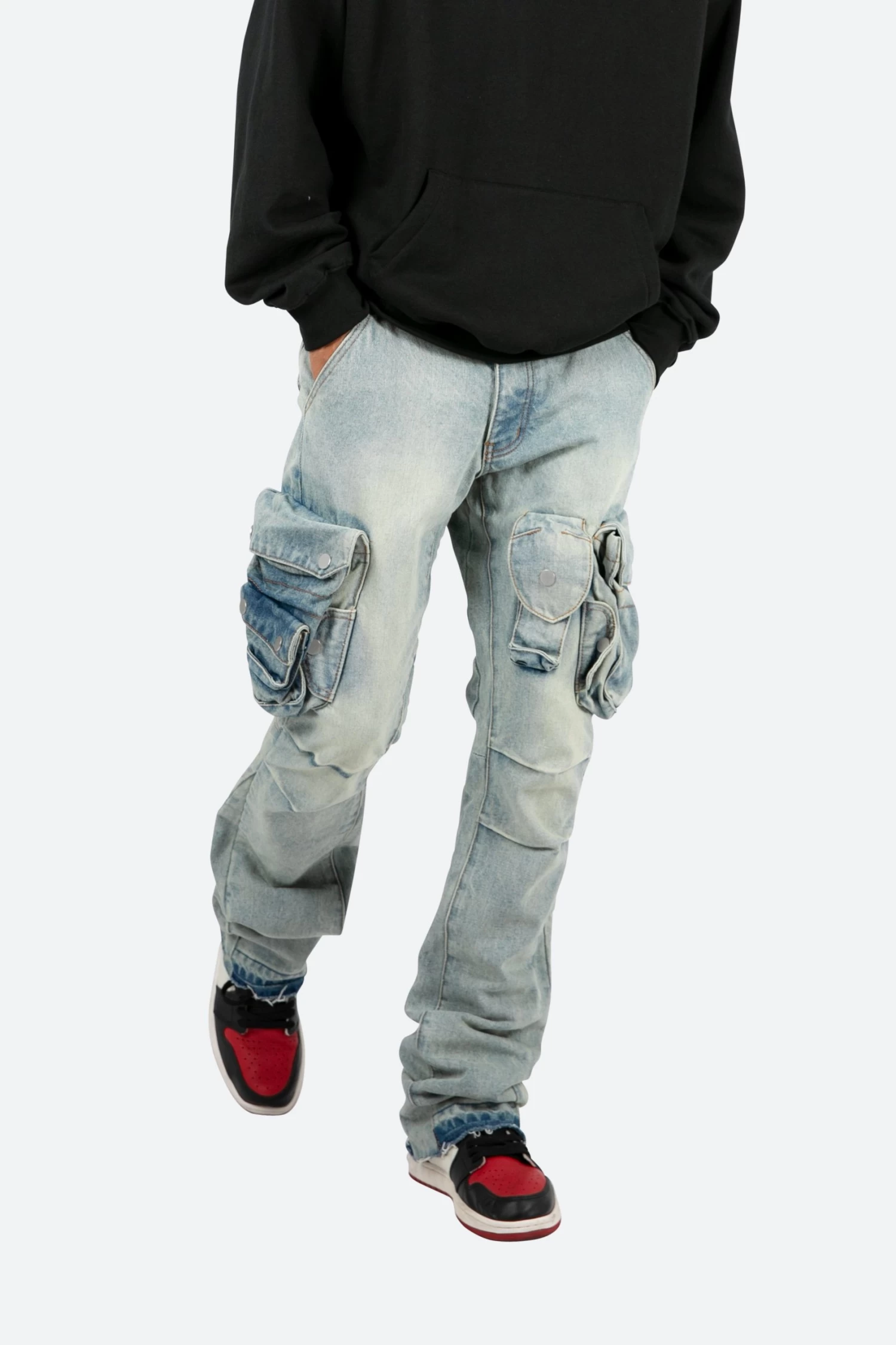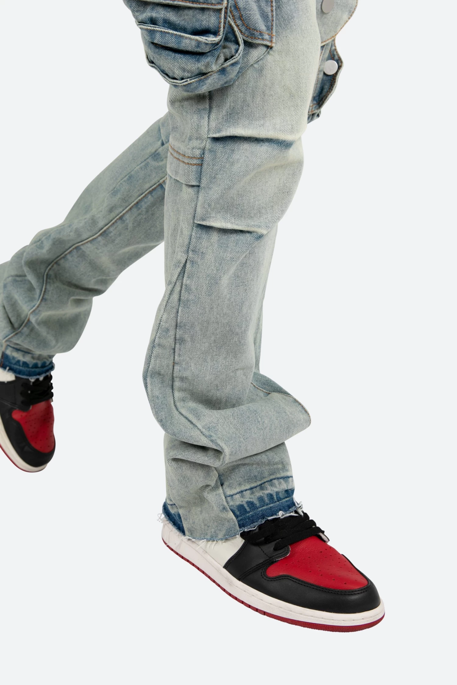 the D480 Cargo Flare Denim are designed with our new B fit, which is slim through the thigh and features a slight flare at the leg opening and is constructed from warm washed denim, with a vintage wash and sanding, cargo pockets at the outseam, and finished with a self fabric panelling for a flare at the leg opening.