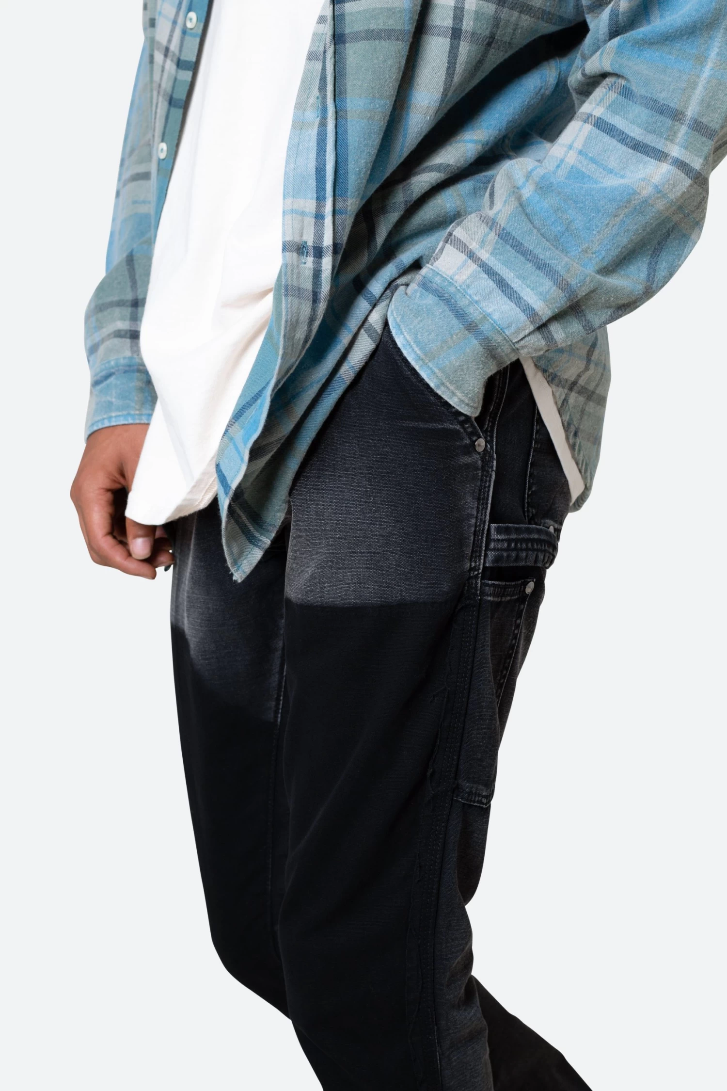 the B501 Flare Denim are designed in our B fit, which is slim through the thigh and features a slight flare at the leg opening and is constructed from washed duck twill, work pants panelling removed after wash for contrasting wash area, panelling at the inseam and outseam for a slight flare, and finished with a deconstructed hem.