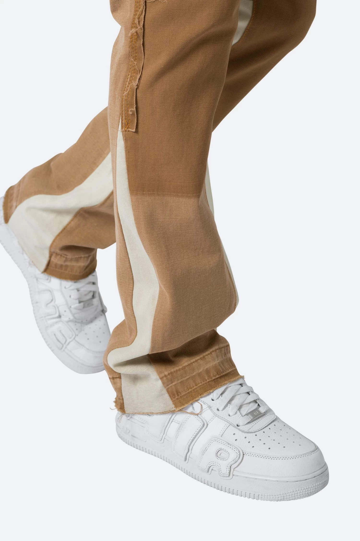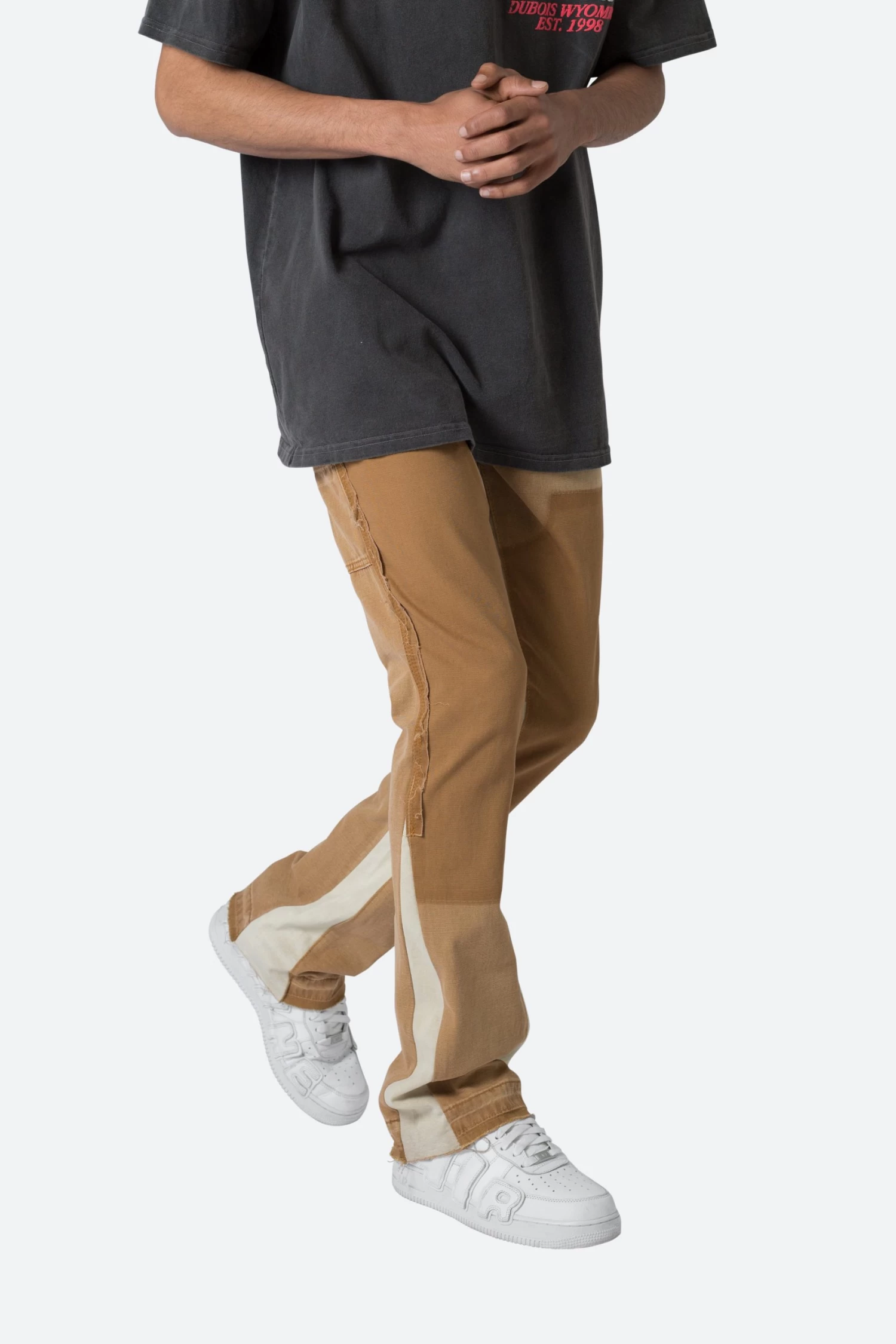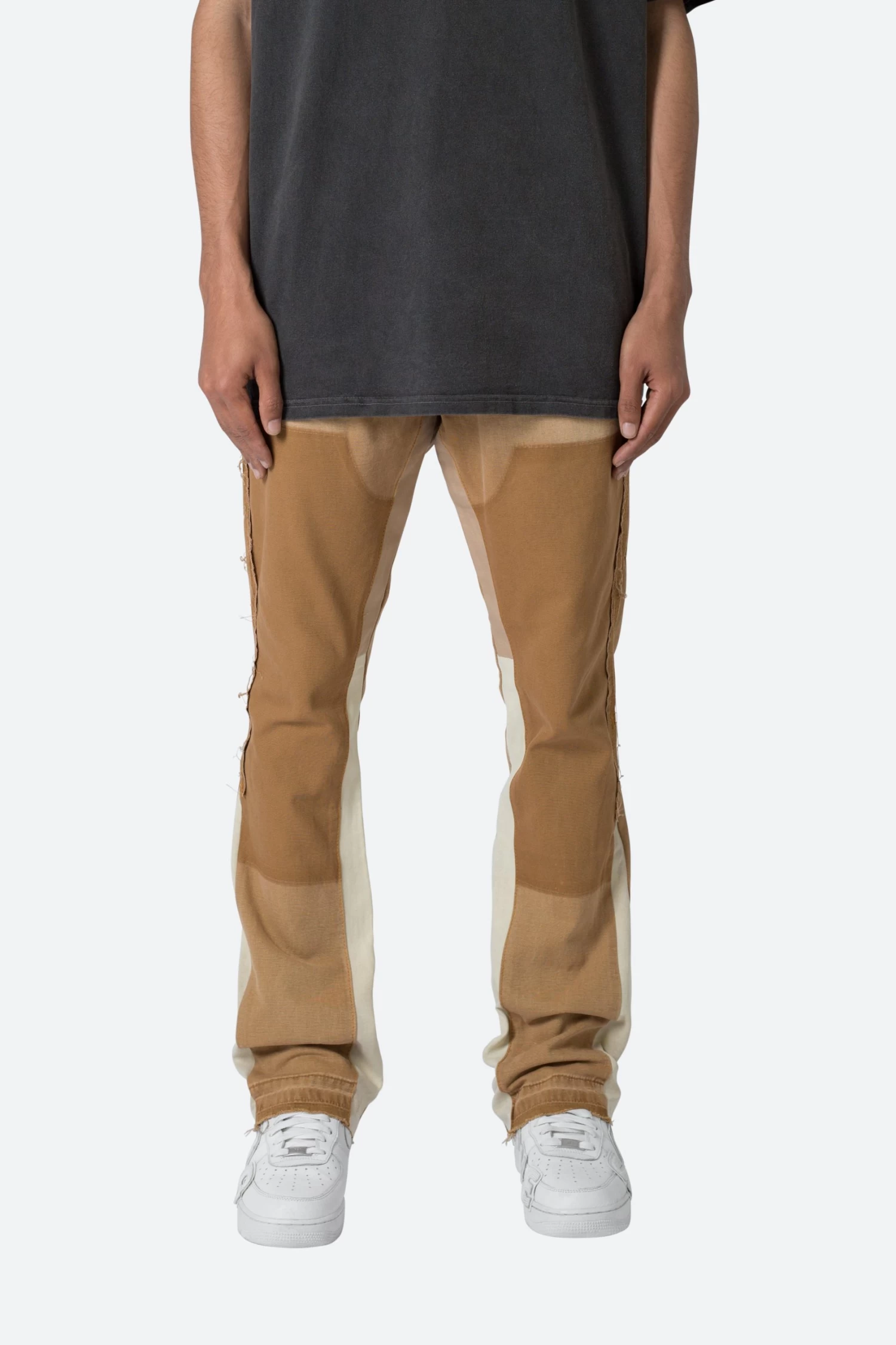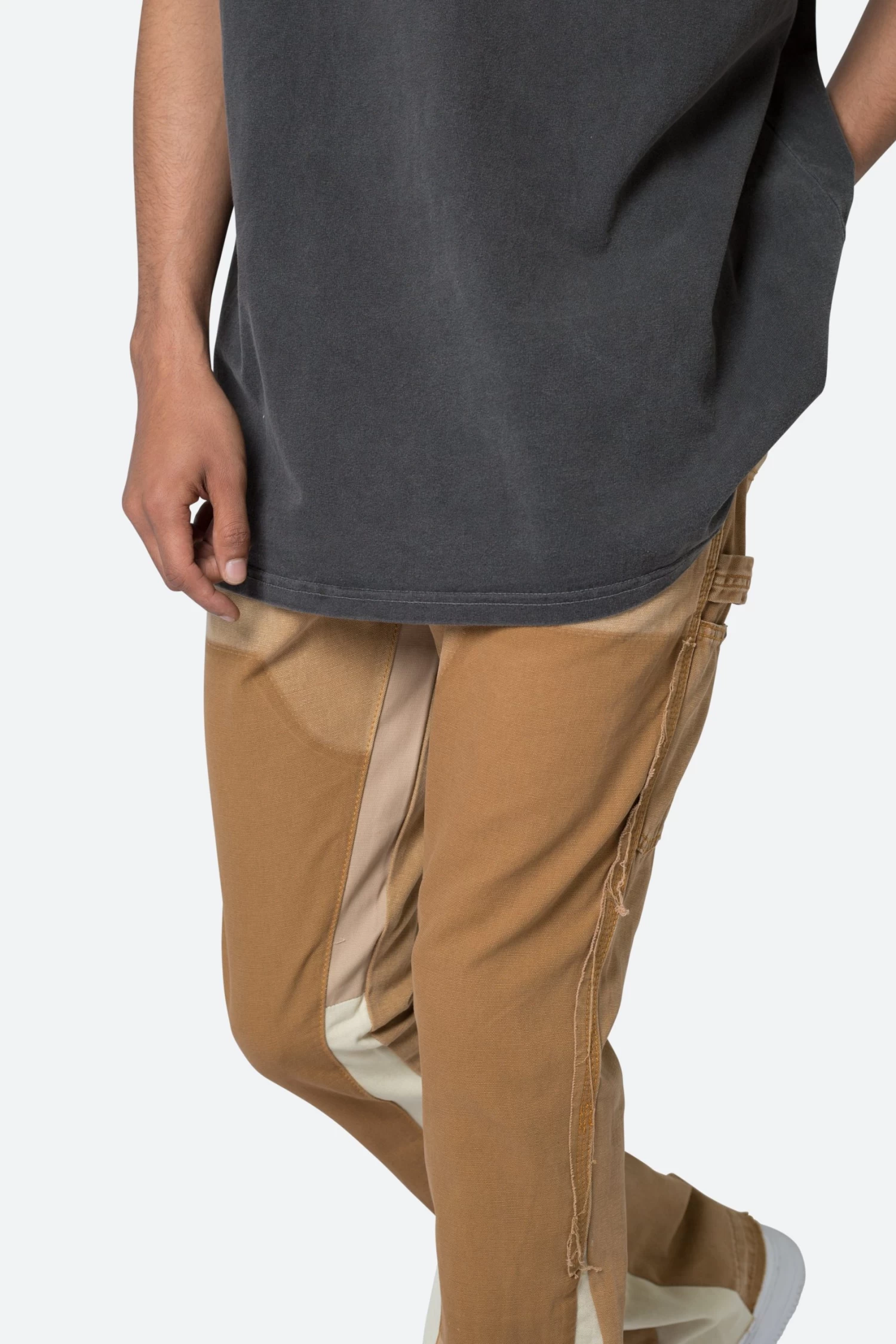 the B501 Flare Denim are designed in our B fit, which is slim through the thigh and features a slight flare at the leg opening and is constructed from washed duck twill, work pants panelling removed after wash for contrasting wash area, panelling at the inseam and outseam for a slight flare, and finished with a deconstructed hem.