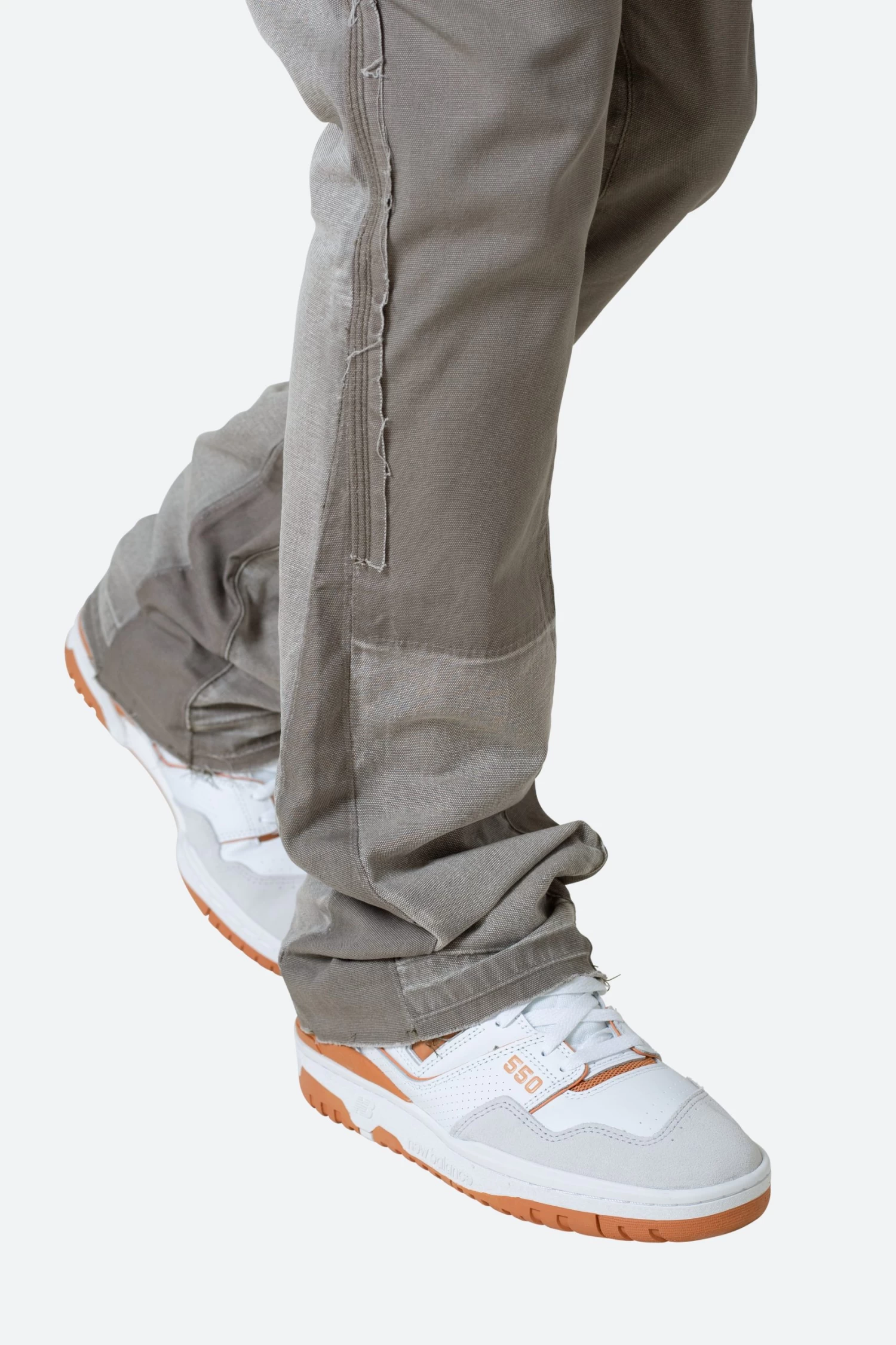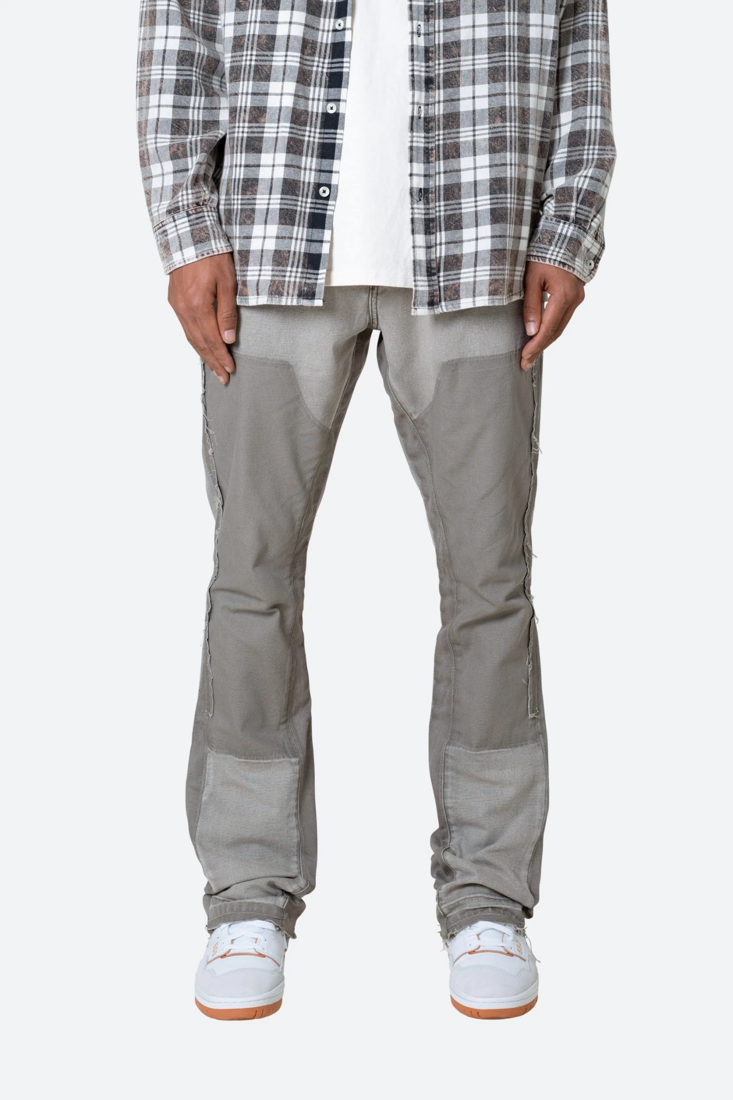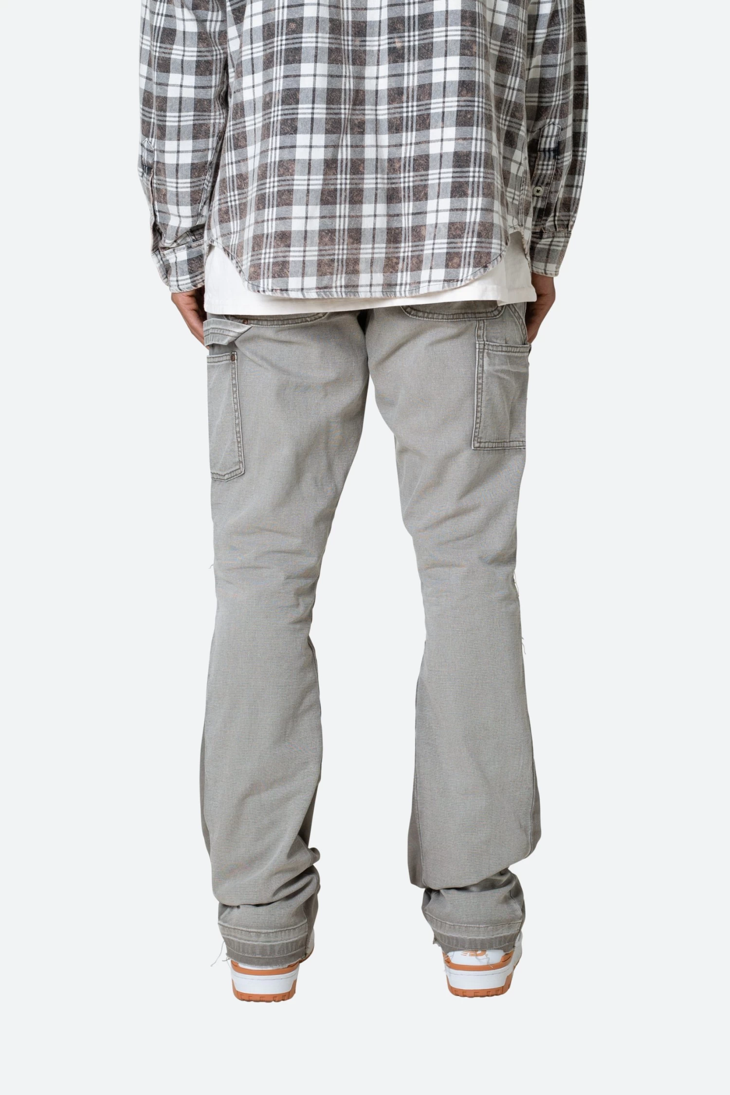 the B501 Flare Denim are designed in our B fit, which is slim through the thigh and features a slight flare at the leg opening and is constructed from washed duck twill, work pants panelling removed after wash for contrasting wash area, panelling at the inseam and outseam for a slight flare, and finished with a deconstructed hem.