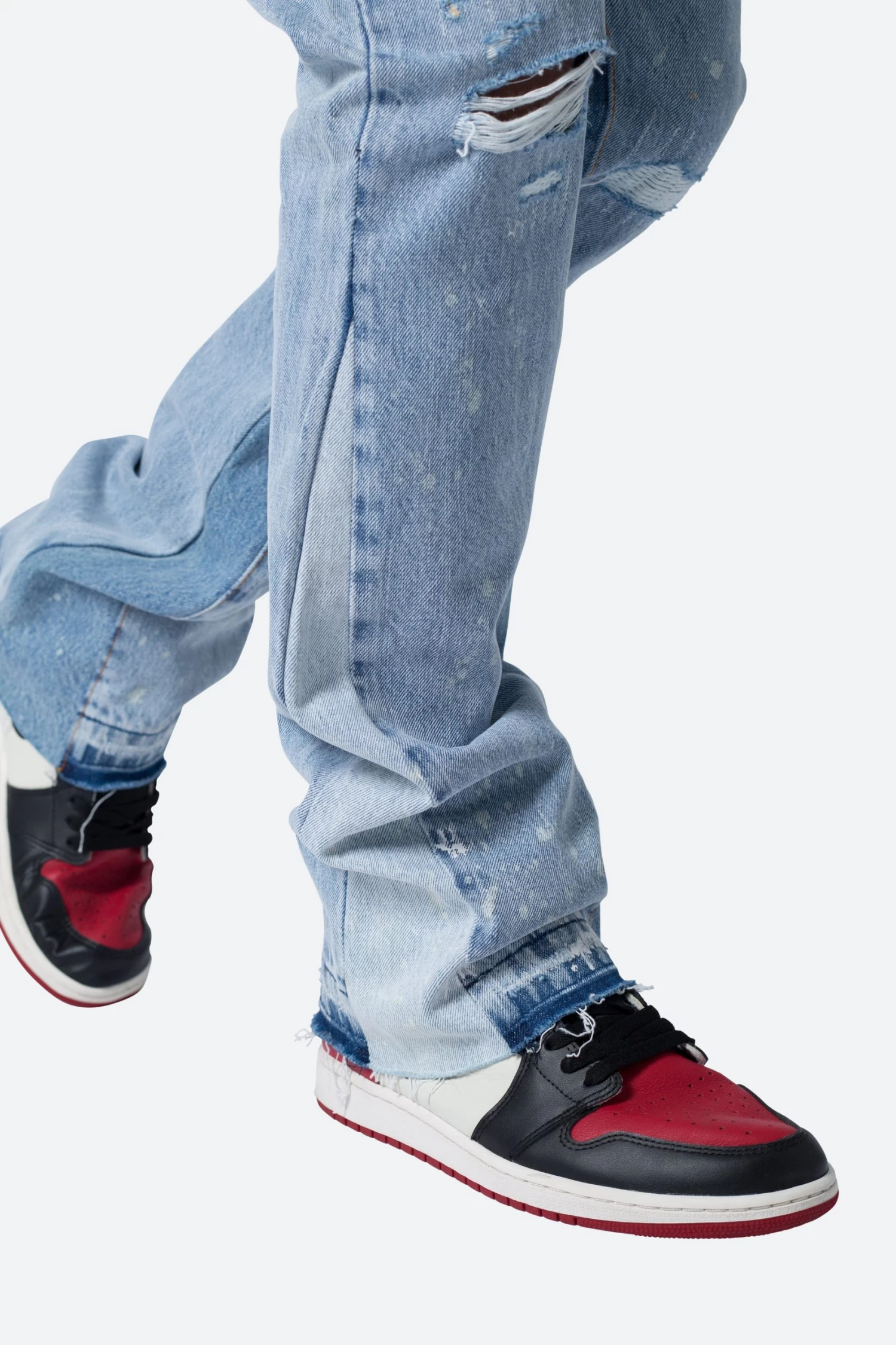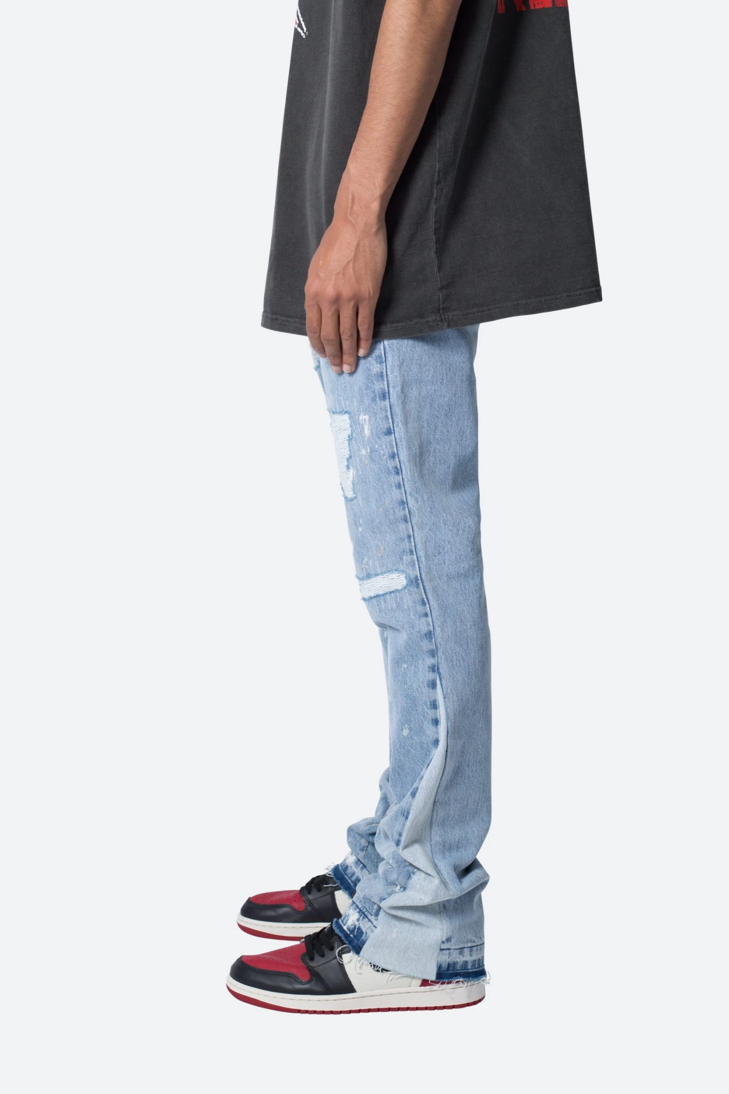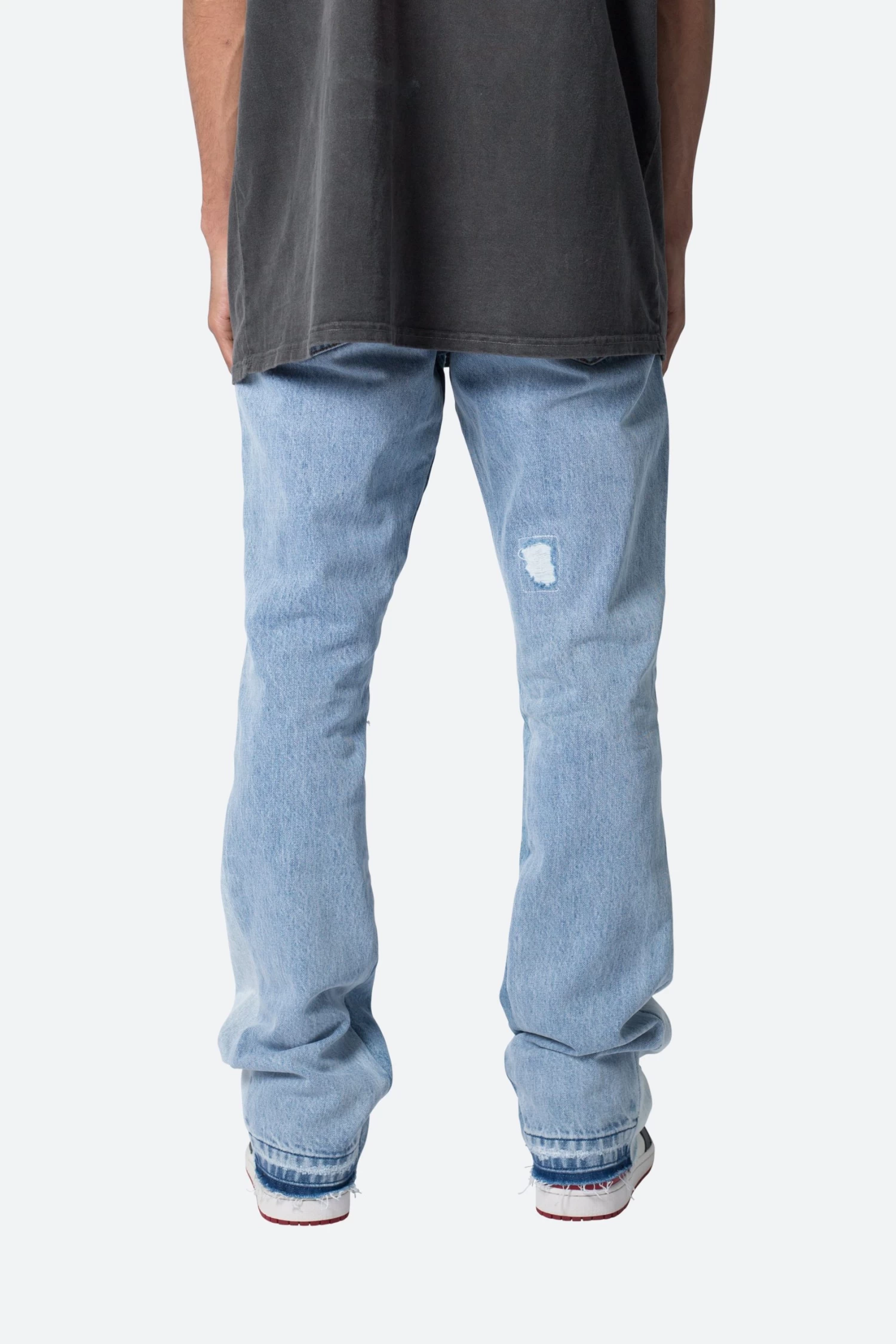 the B508 Flare Denim are designed with our new B fit, which is slim through the thigh and features a slight flare at the leg opening and is constructed from light washed blue denim, panelling at the inseam and outseam from contrasting blue denim for a slight flare, distressing details throughout, and finished with a deconstructed hem.