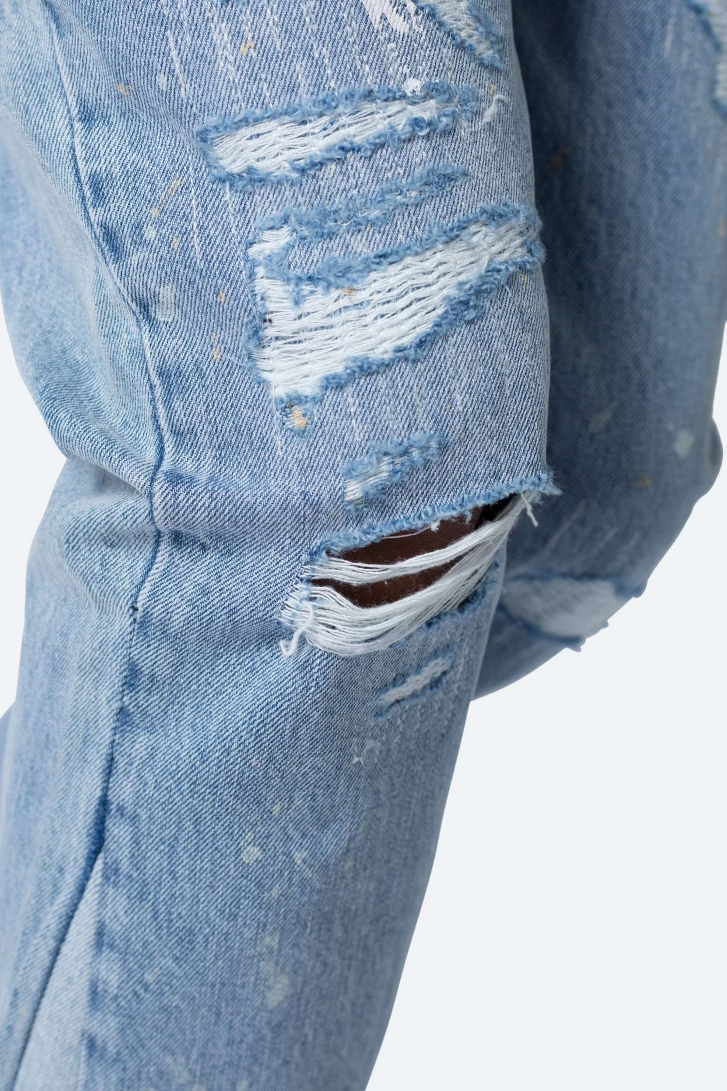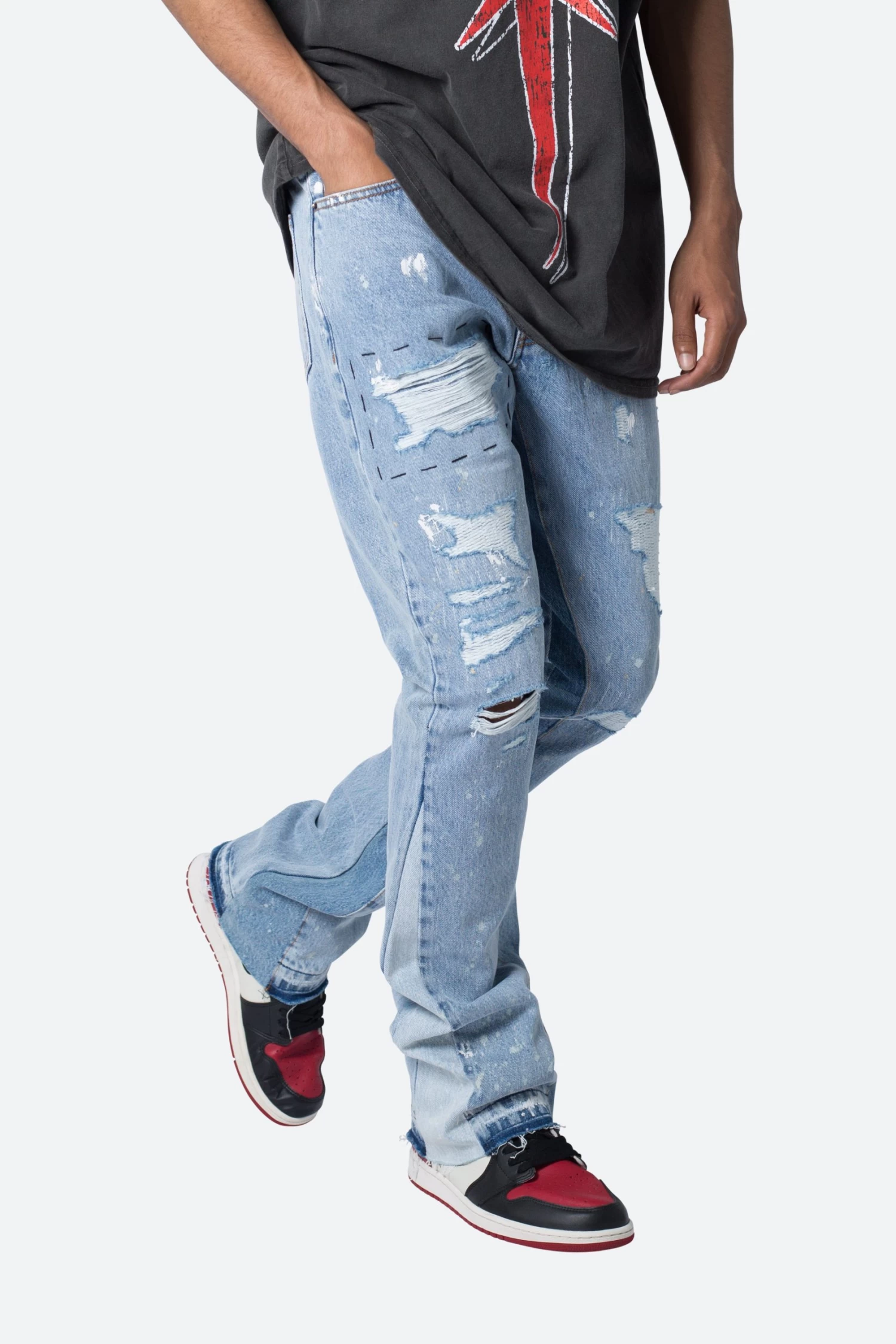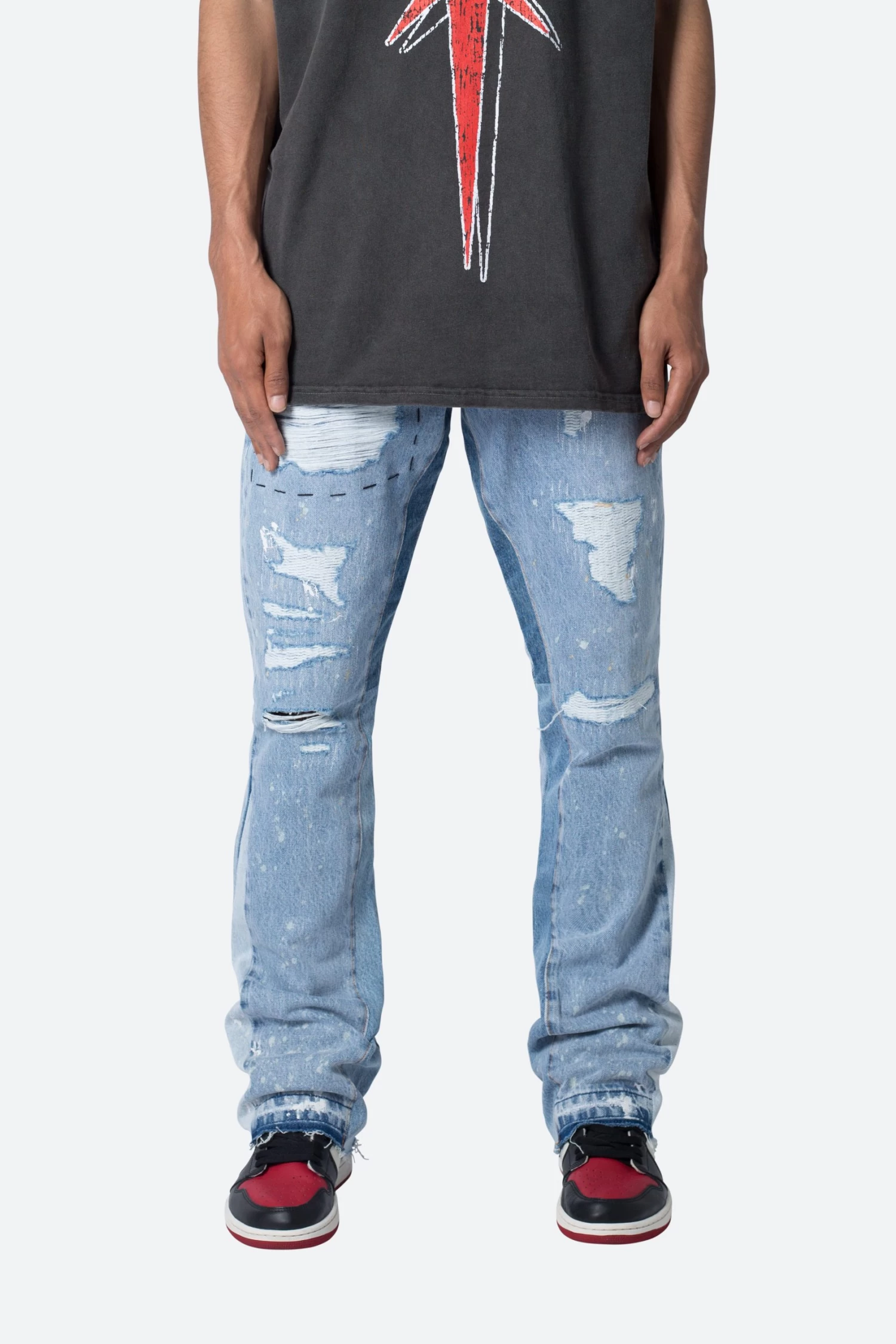 the B508 Flare Denim are designed with our new B fit, which is slim through the thigh and features a slight flare at the leg opening and is constructed from light washed blue denim, panelling at the inseam and outseam from contrasting blue denim for a slight flare, distressing details throughout, and finished with a deconstructed hem.