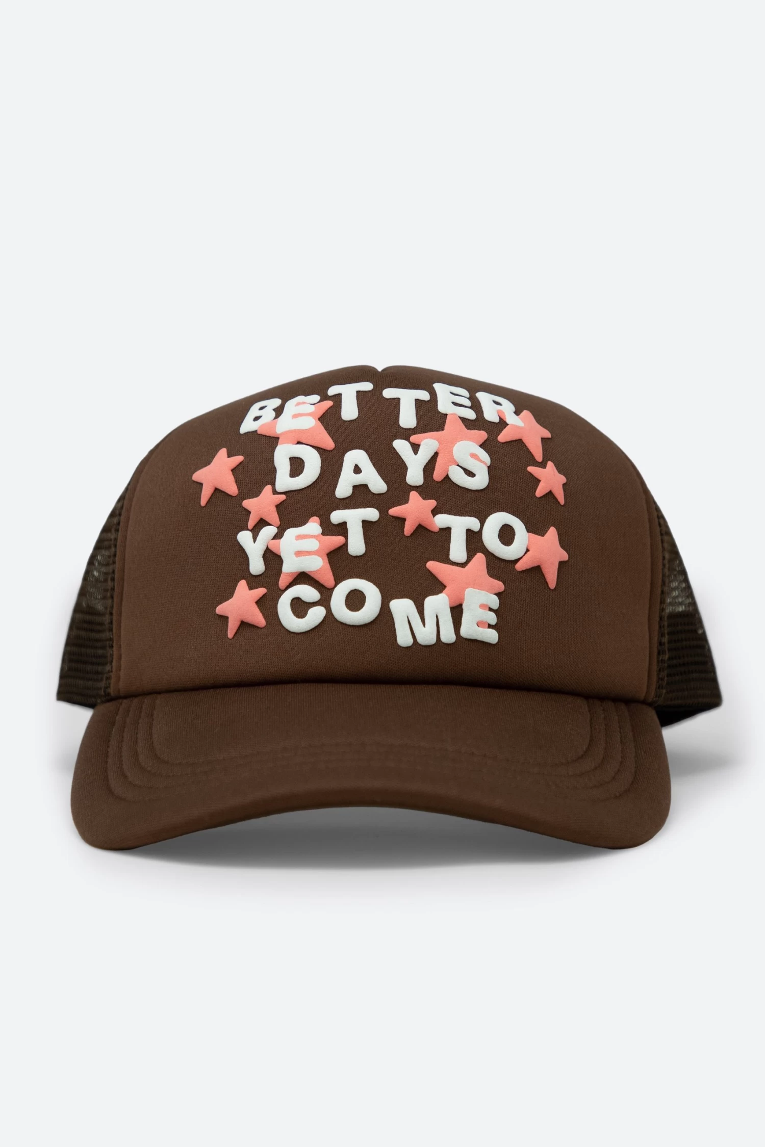 the Better Days Trucker Cap is constructed from a tonal neoprene front panel, tonal neoprene brim, mesh back, and finished with a multi colored screen print at the front.