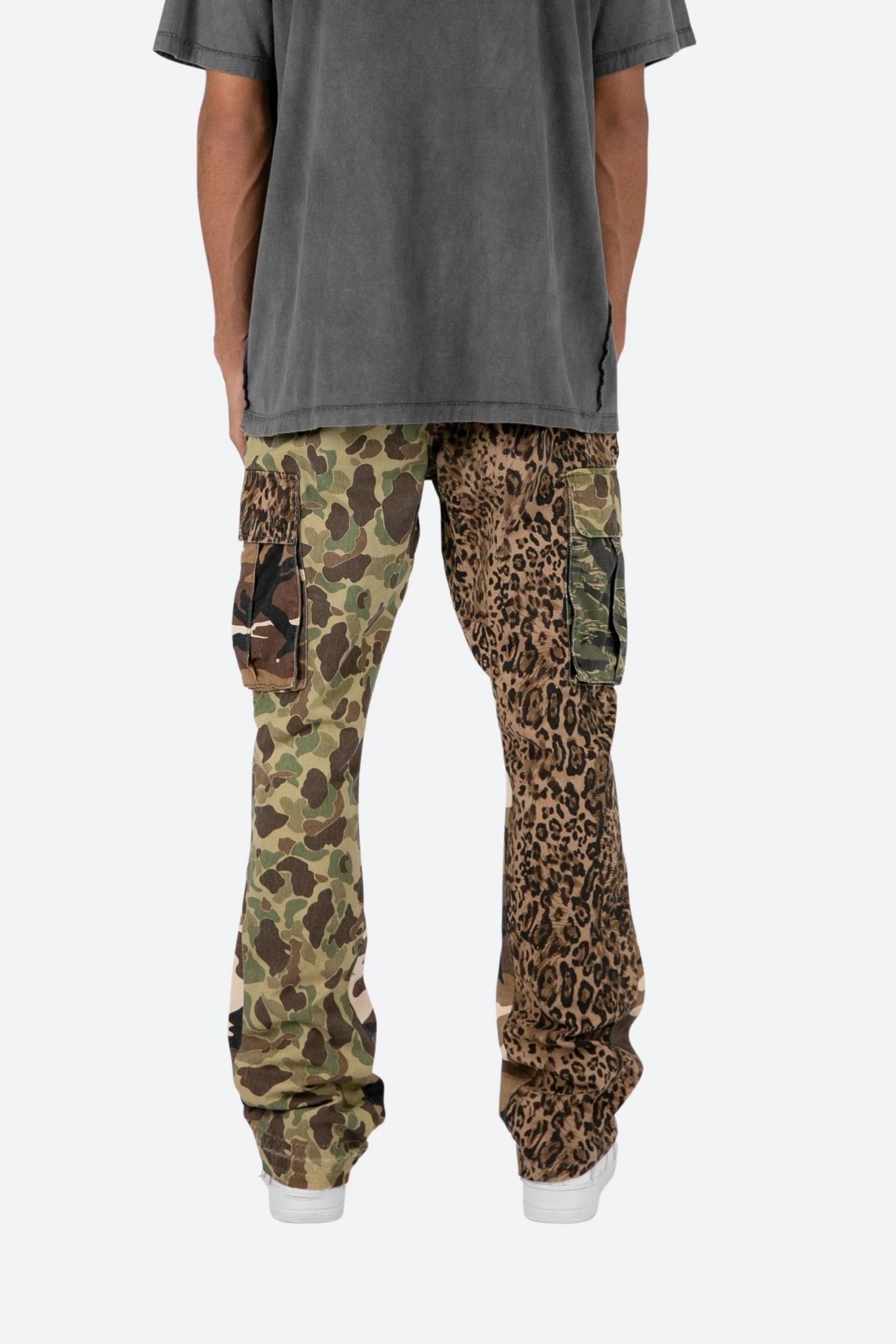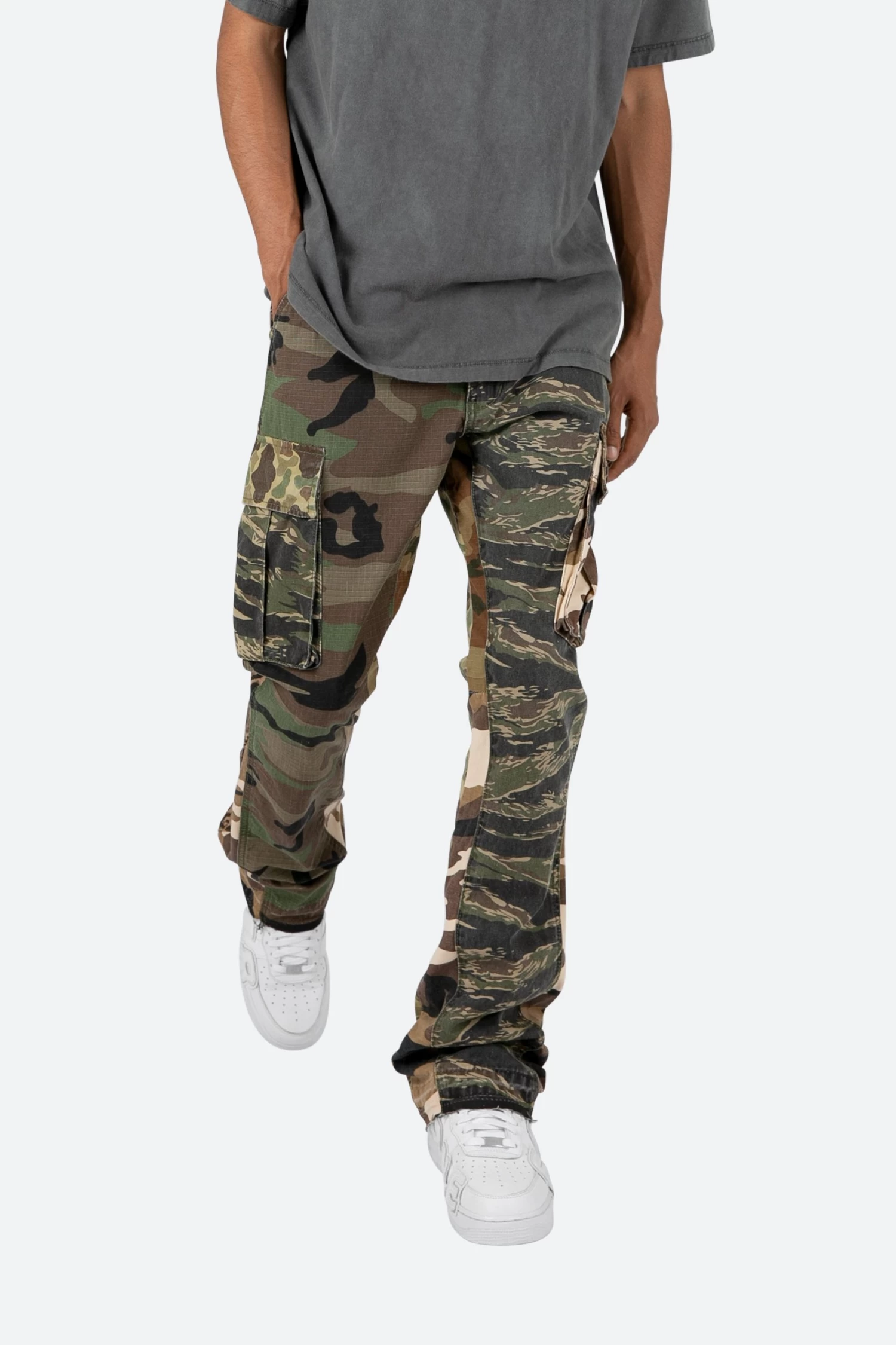 the Bootcut Cargo Pants are designed with our new B fit, which is slim through the thigh and features a slight flare at the leg opening and is constructed from multiple washed camo twills, with a vintage wash , and finished with a contrasting panelling.