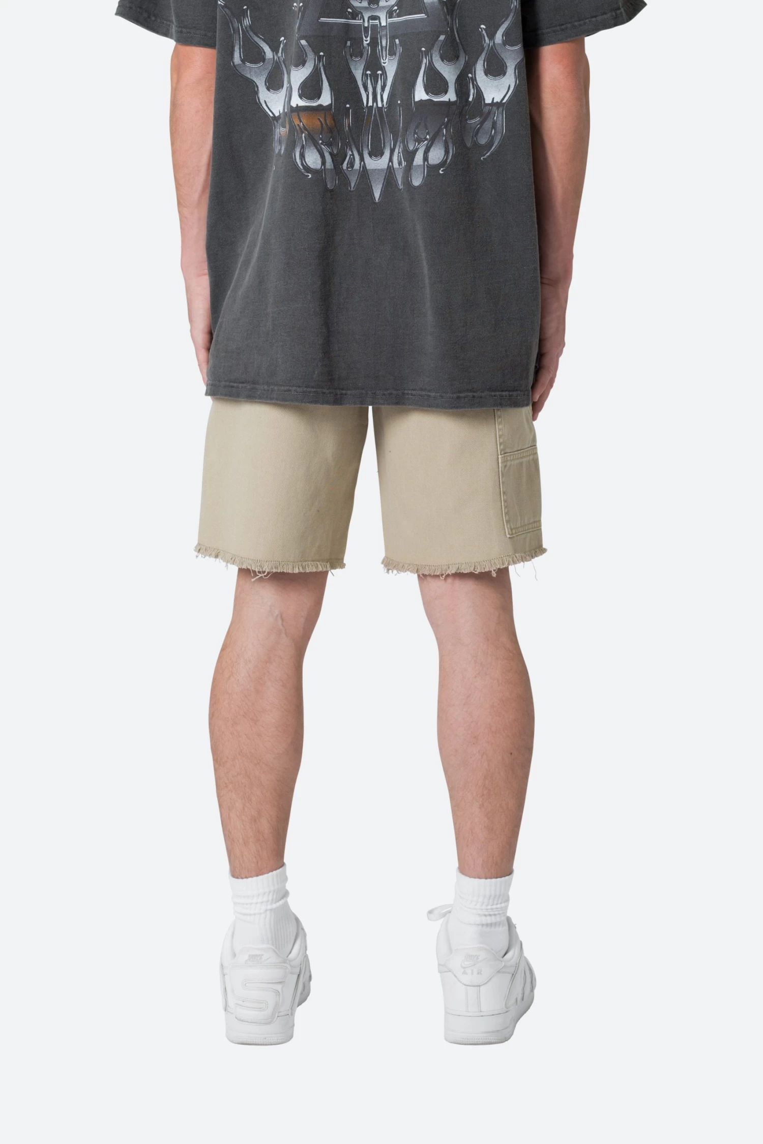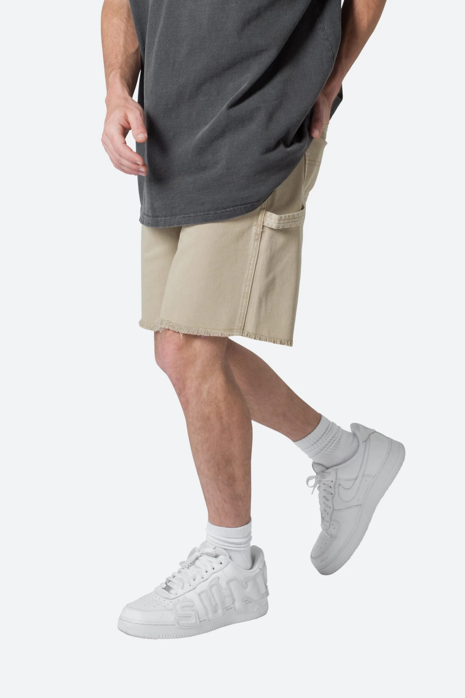 the Carpenter Shorts are designed with a relaxed fit throughout, featuring a vintage wash, carpenter pant details, and finished off with raw hem.