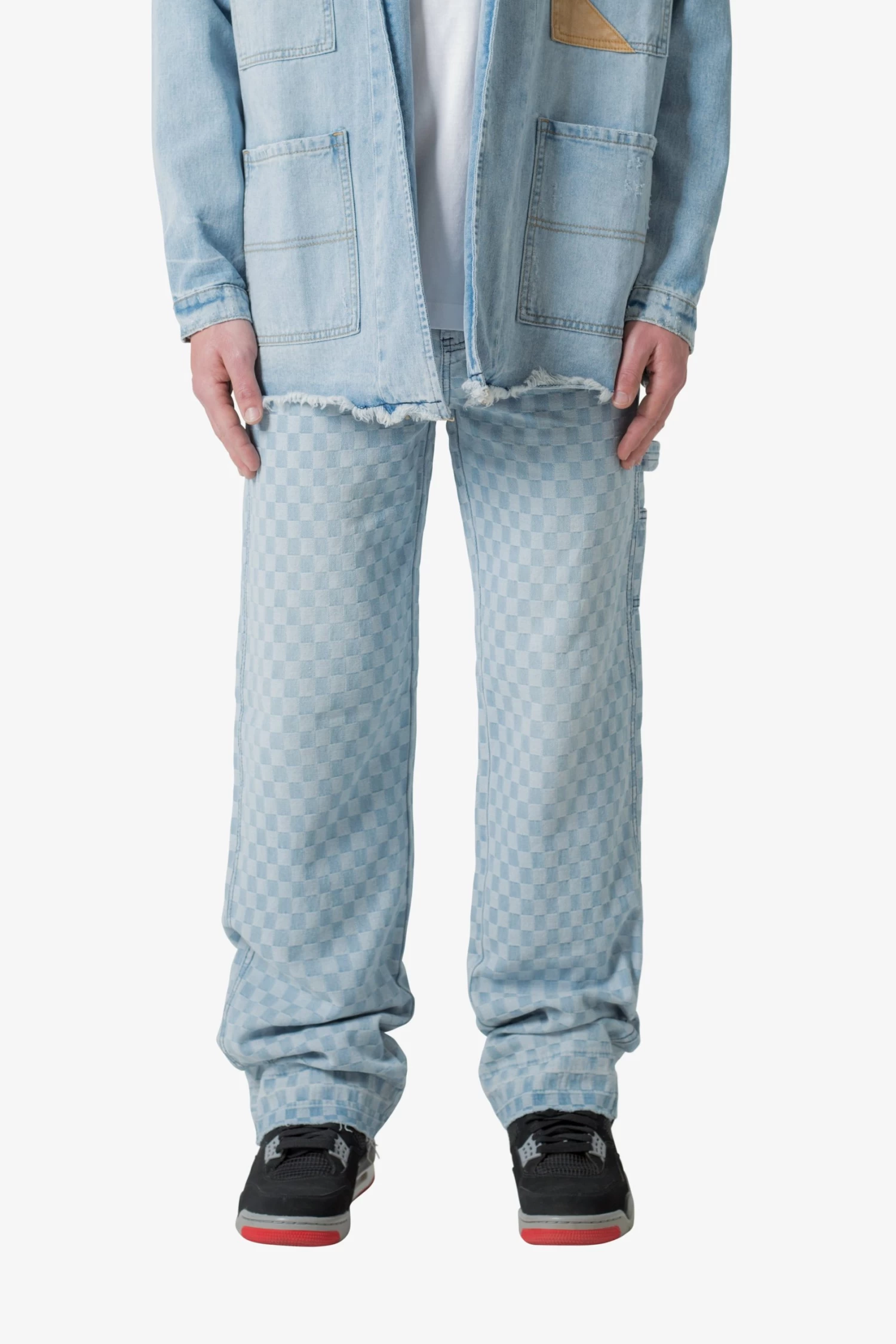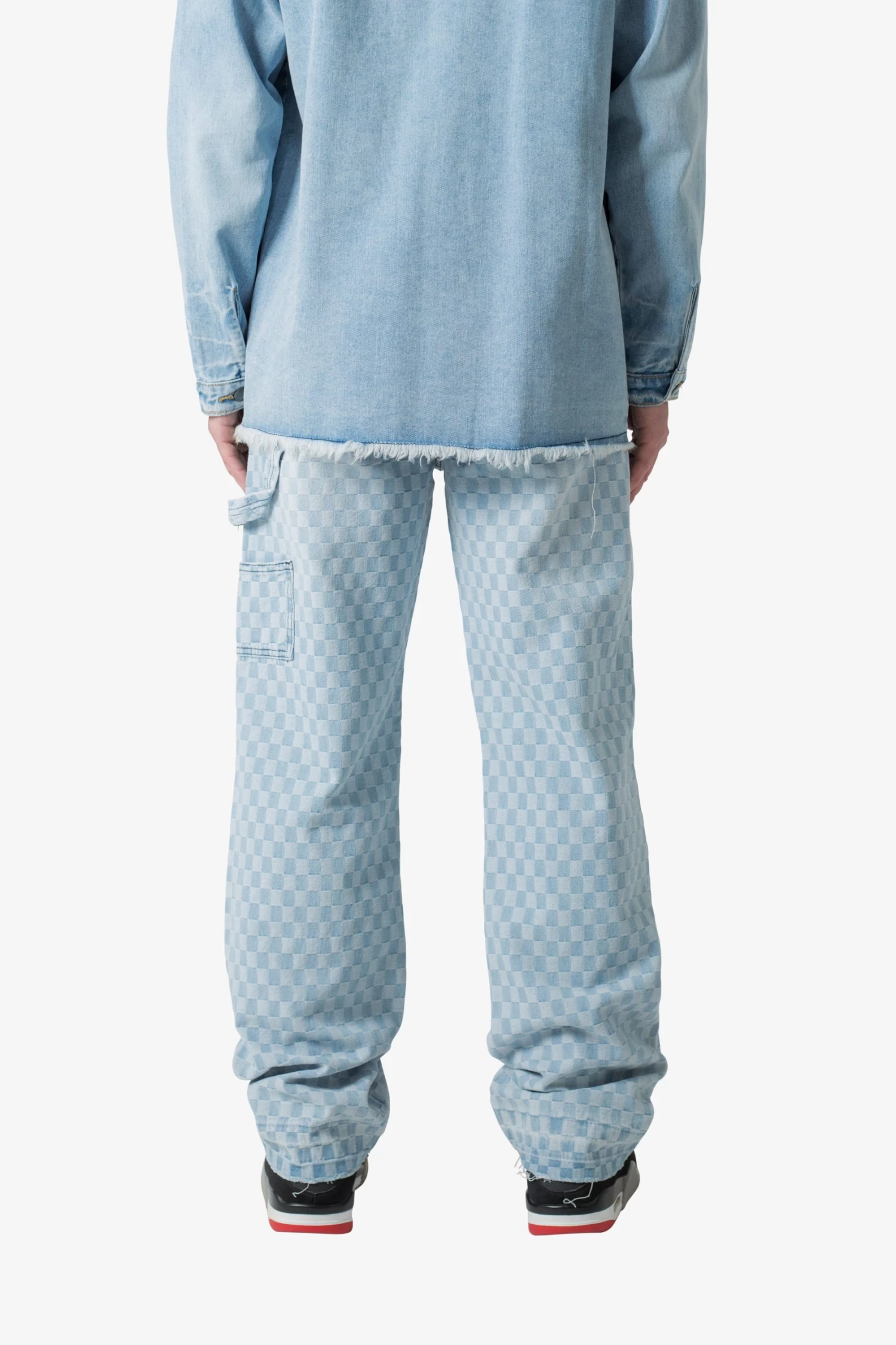 the Checkerboard Work Denim is designed in a relaxed fit with an extended inseam for stacking and features a jacquard checkered print denim, carpenter pant details, and a raw hem.
