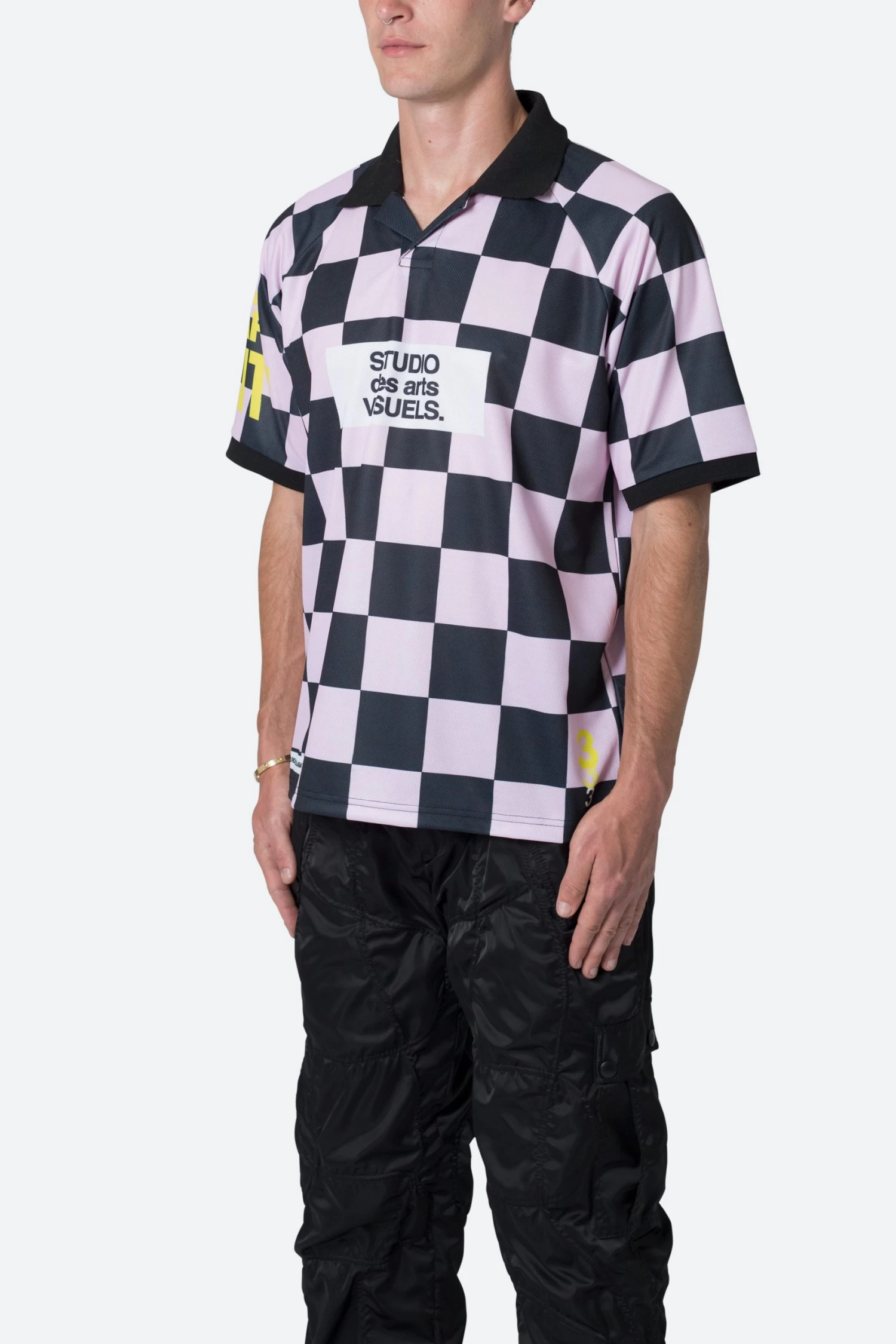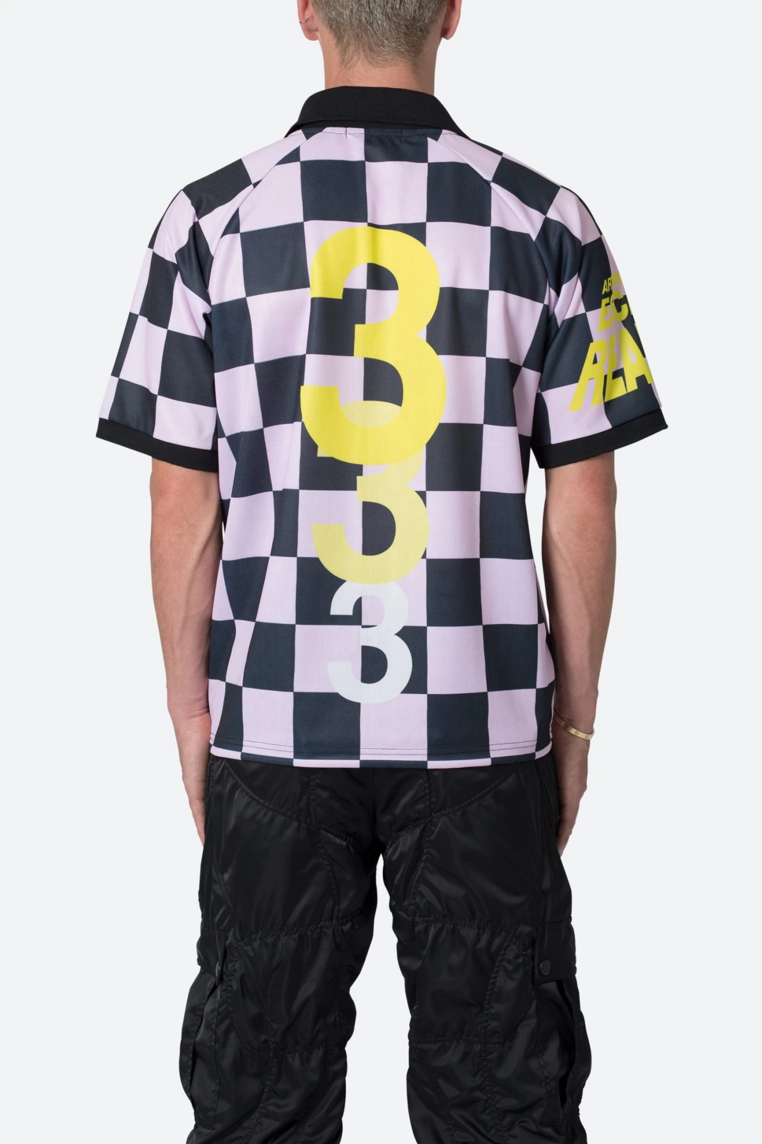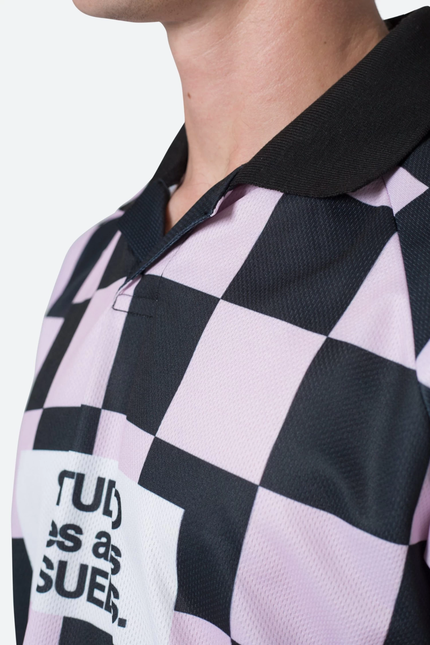 the Checkered Jersey is designed with a relax fit, and is made from a sublimated poly fabric, multi color checkerboard pattern with graphic details throughout, button placket at the chest, and finished with solid ribbing at the collar and sleeve opening.