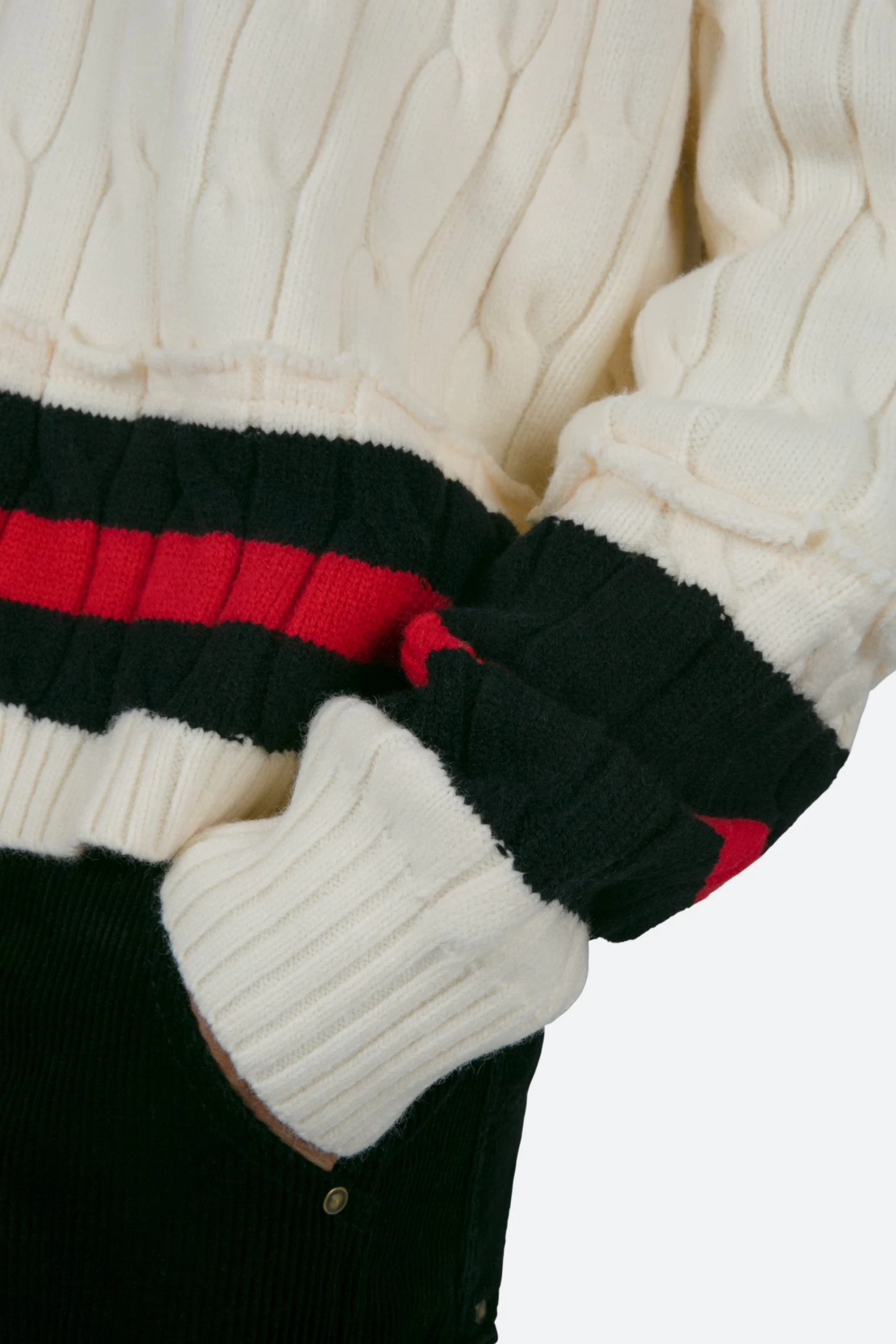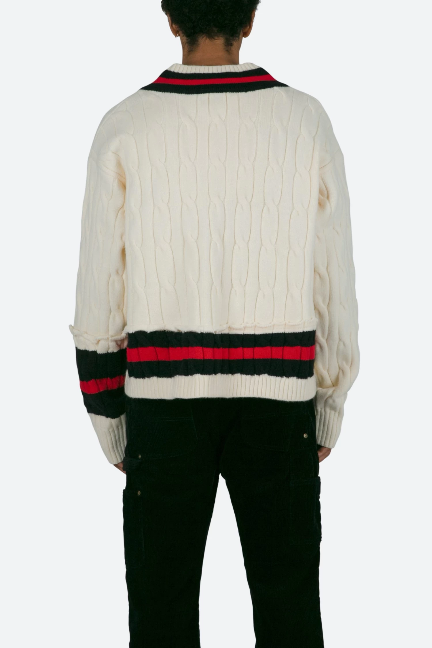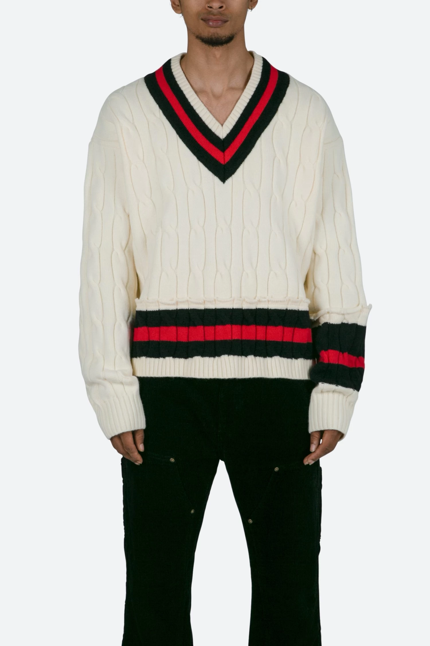 the Classic V Neck Sweater is a custom knit sweater that is constructed from an acrylic yarn, multi color stripe details at the collar, waist, and left arm, cable knit detail, features a standard fit, and is finished with raw edge paneling throughout.