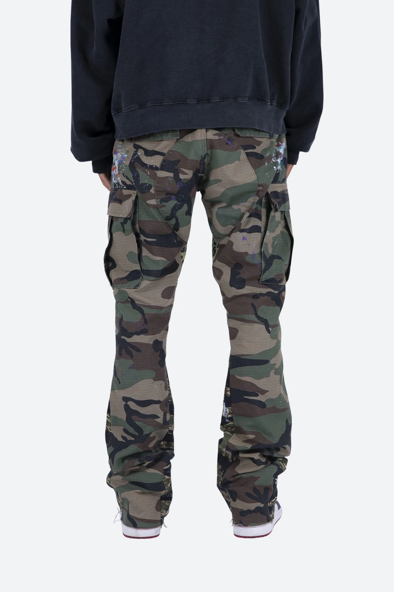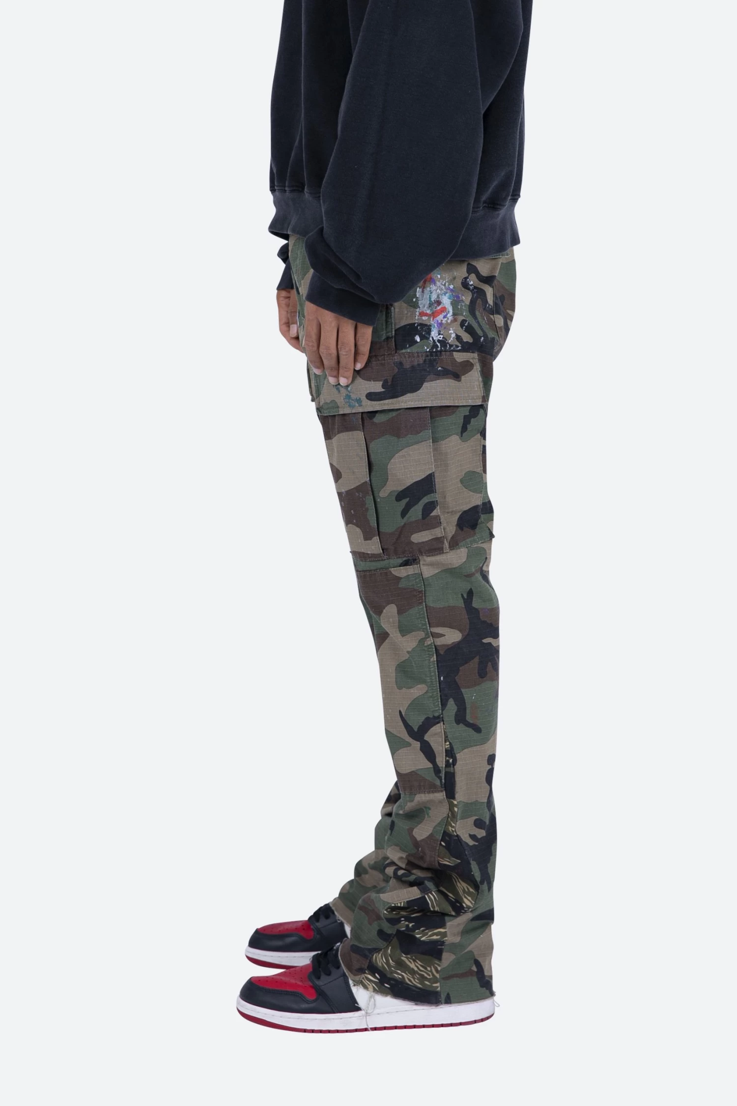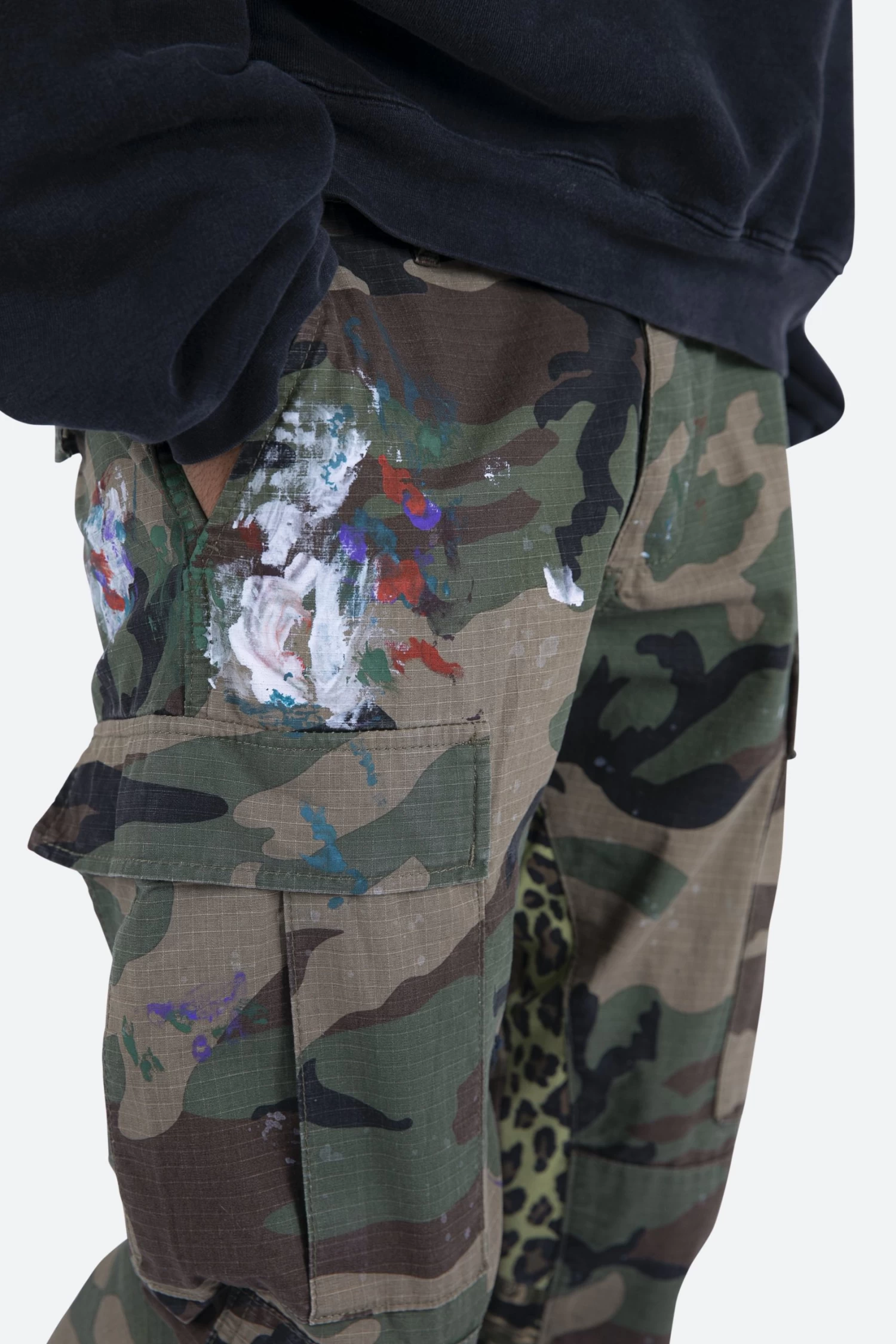 the Contrast Bootcut Cargo Pants are designed with our new B fit, which is slim through the thigh and features a slight flare at the leg opening and is constructed from washed camo twill, with a vintage wash and paint splatter, and finished with a contrasting leopard and tiger camo panelling.