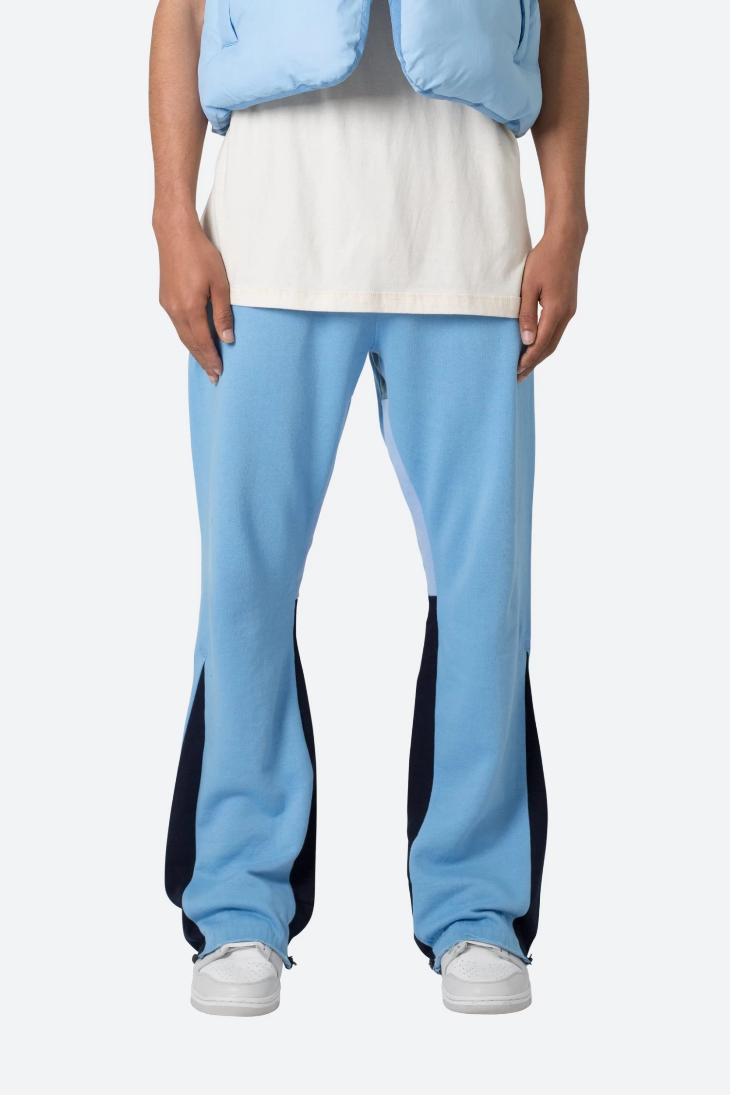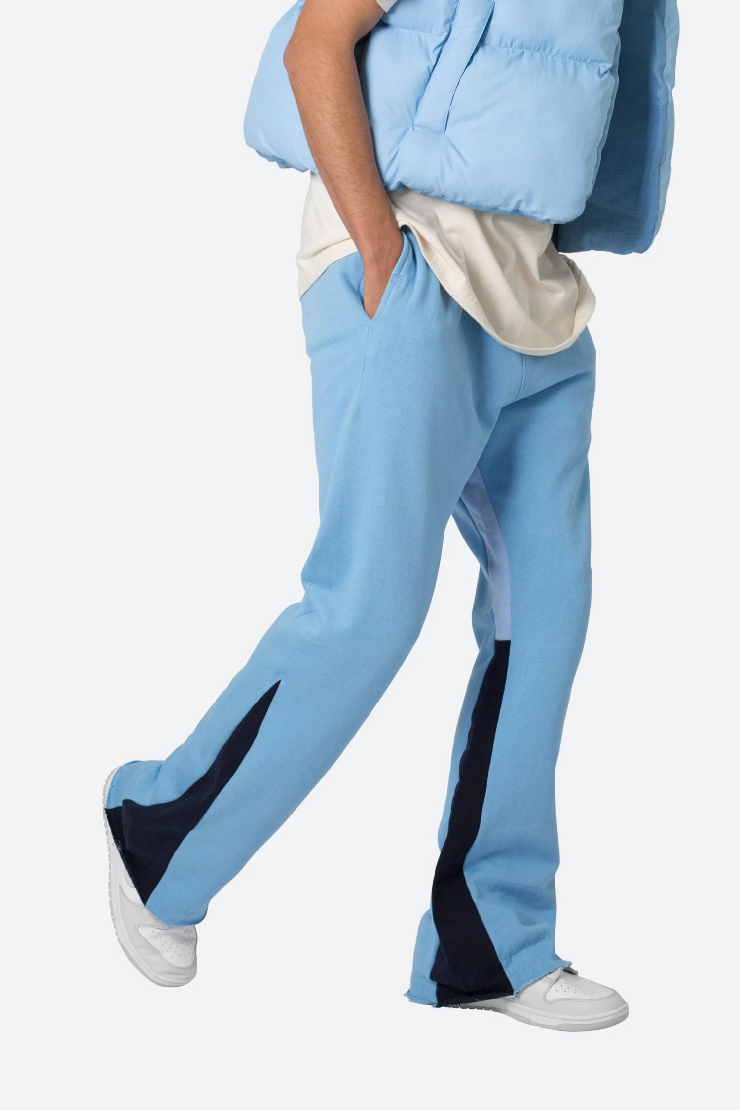 the Contrast Bootcut Sweatpants are designed with a relaxed fit throughout, featuring an elasticized self waist and leg opening, multi-colored paint splatter throughout, and finished with denim and contrasting panels at the inseam and outseam to provide a flare at the leg opening.