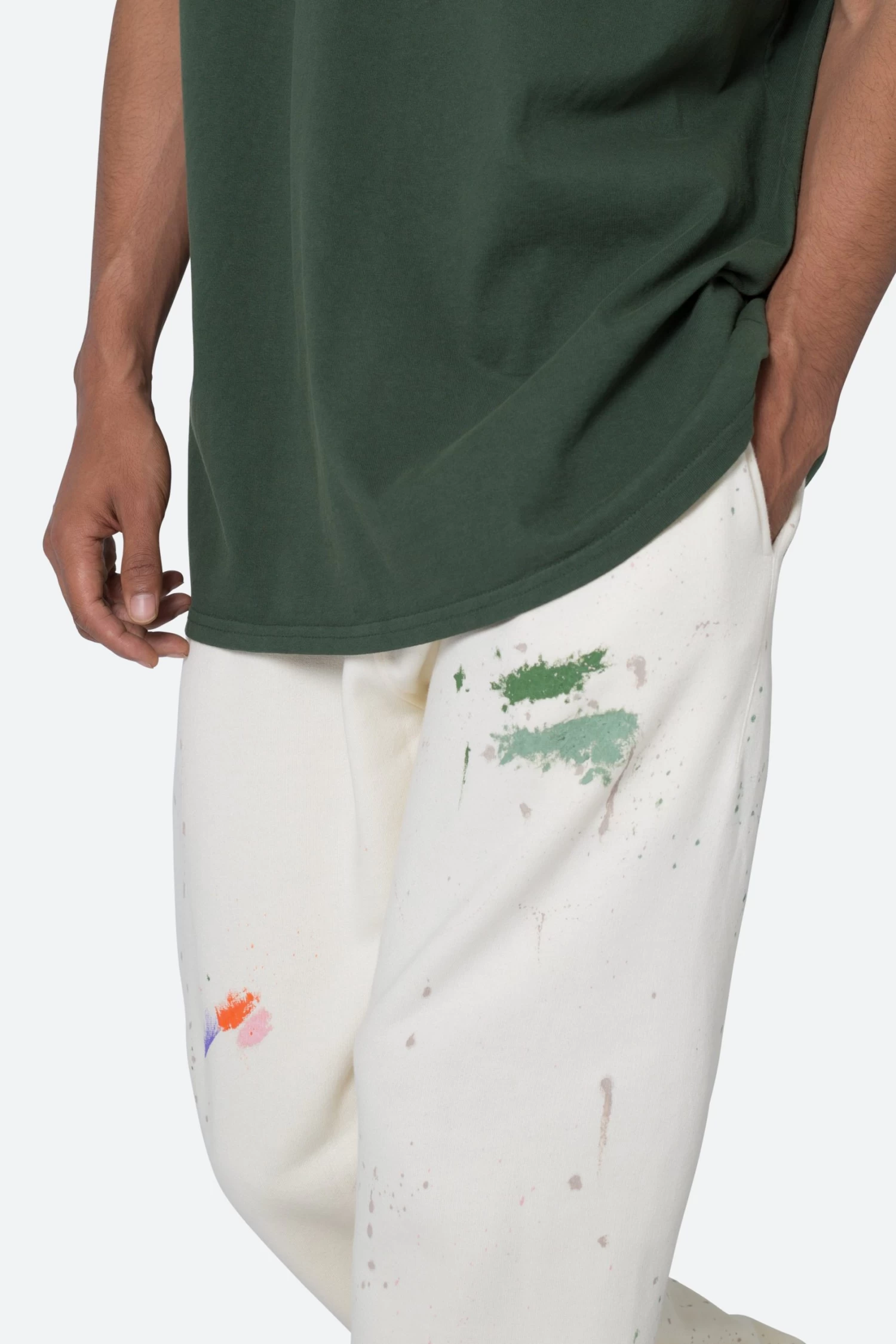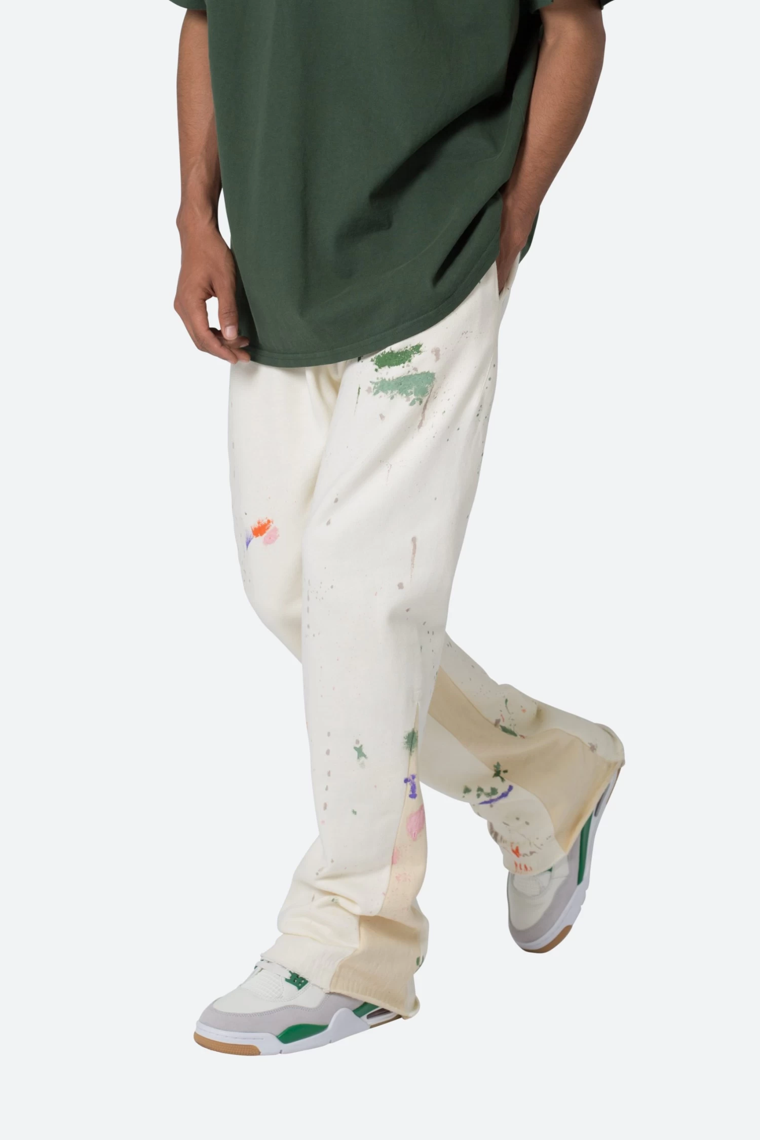 the Contrast Bootcut Sweatpants are designed with a relaxed fit throughout, featuring an elasticized self waist and leg opening, multi-colored paint splatter throughout, and finished with denim and contrasting panels at the inseam and outseam to provide a flare at the leg opening.