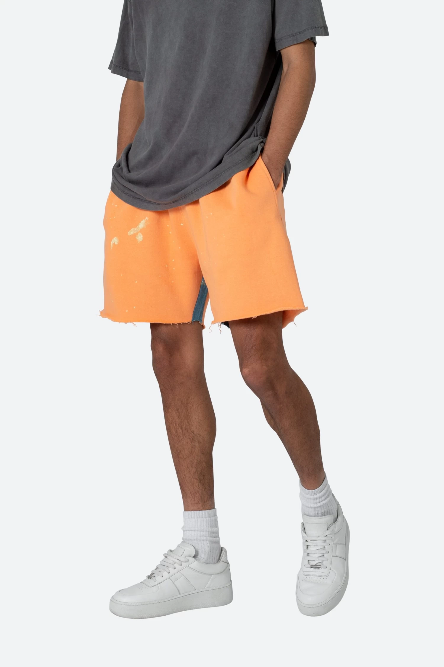 the Contrast Paneled Sweatshorts are constructed with a custom-knit french terry fabric in a relaxed fit. The shorts feature an elasticized waist in self fabric, welt pockets at the outseam, and a cotton drawstring on the inside of the shorts, contrast paneling at the inseam, multi color paint splatter throughout, and finished with a raw edge leg opening.