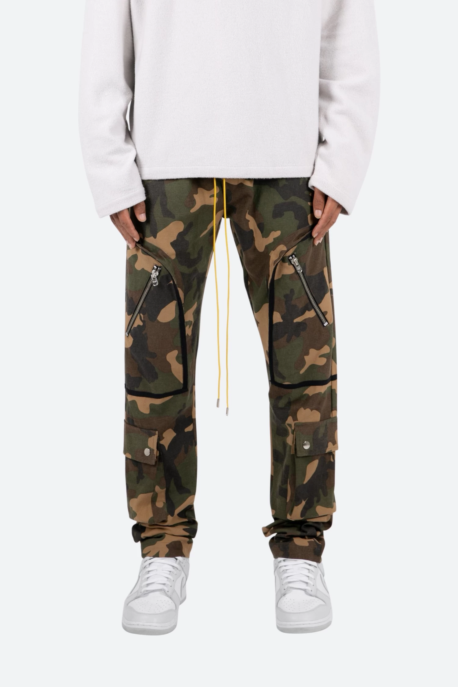 the Contrast Taped Cargo Pants are designed with a relaxed fit throughout the leg, with large cargo pockets located on the front with contrast taping, an elastic waistband, yellow elastic drawcord, and finished with welt pockets at the side seam.