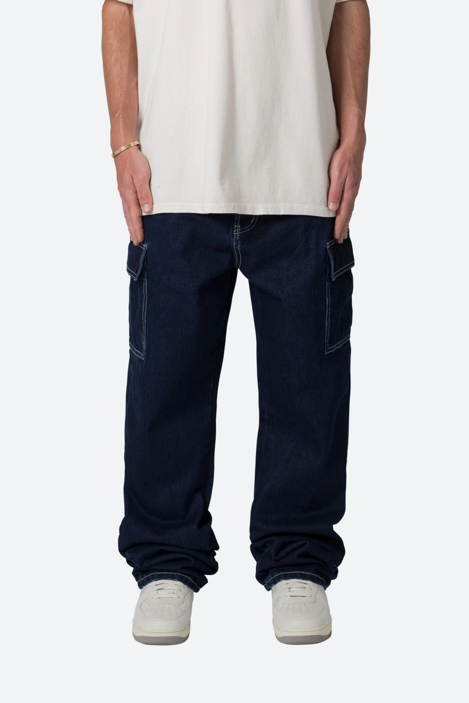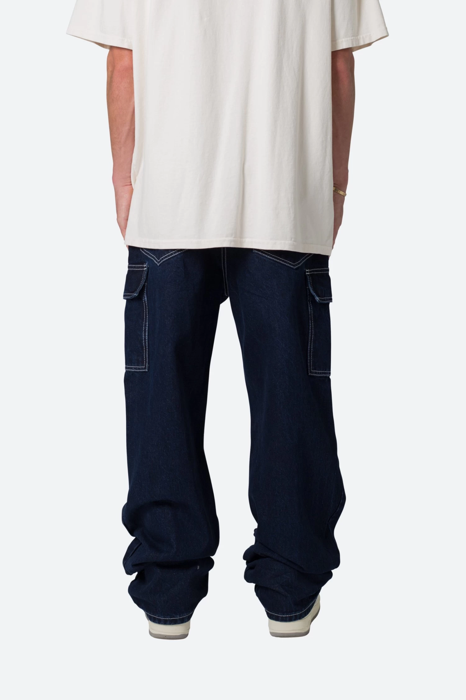 the Contrast Ultra Baggy Denim are designed with a new oversized ultra baggy fit, constructed from blue denim with a rinse wash, featuring cargo pockets throughout with snap closures, contrasting stitch color, and finished with a button placket.
