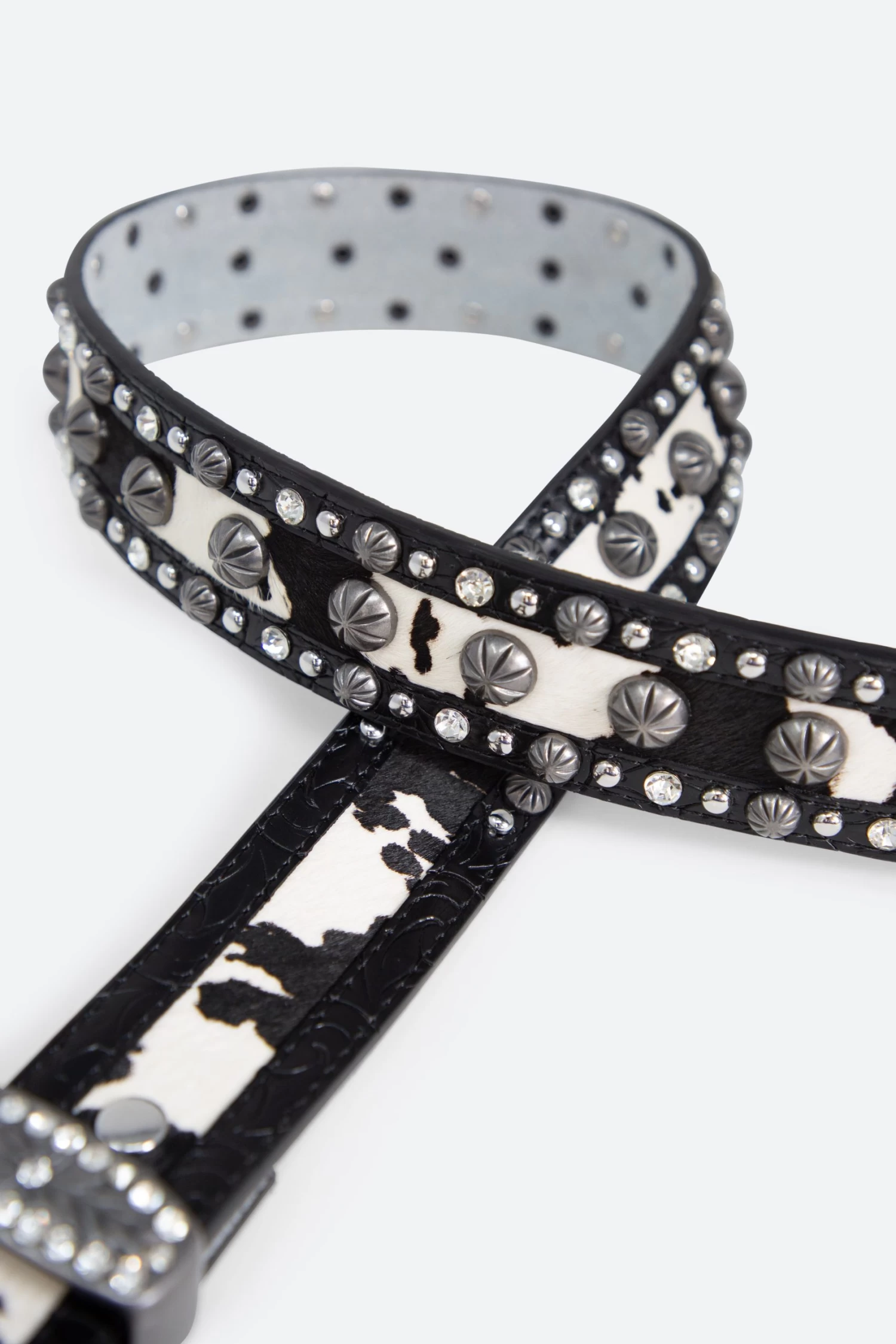 The Cow Print Studded Belt is made from natural leather and features intricate Western design motifs on the metal buckle, end tip and loop, with stud and rhinestone embellishment throughout.