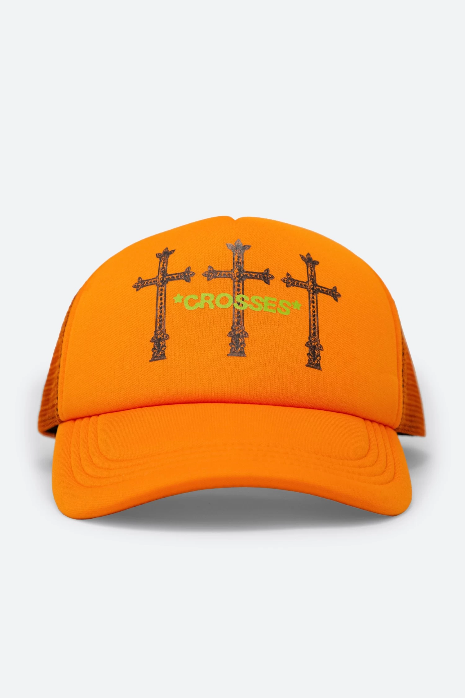 theย Crossesย Trucker Cap is constructed from a neoprene front panel and brim, mesh back, and finished with a multi colored screen print at the front.