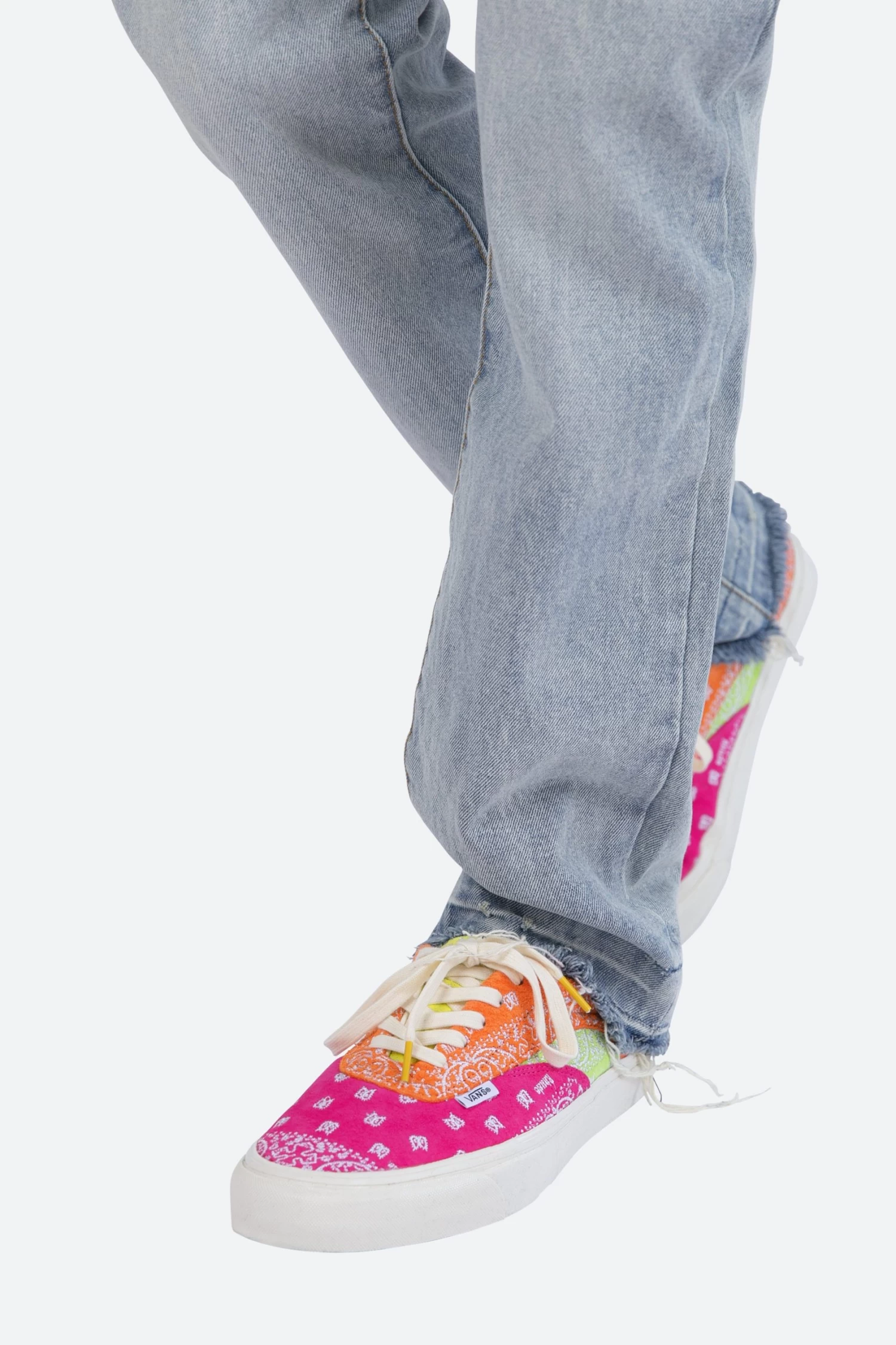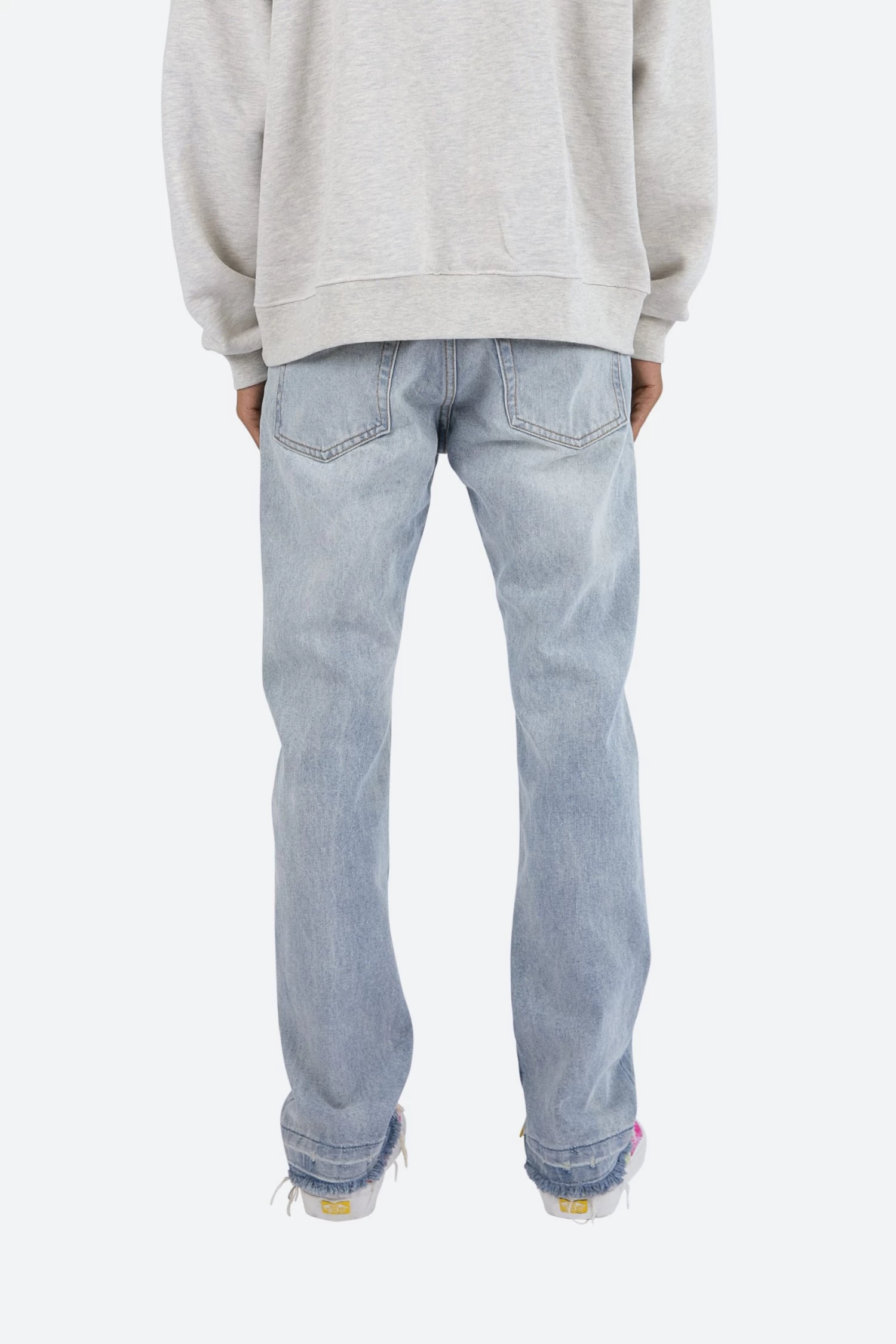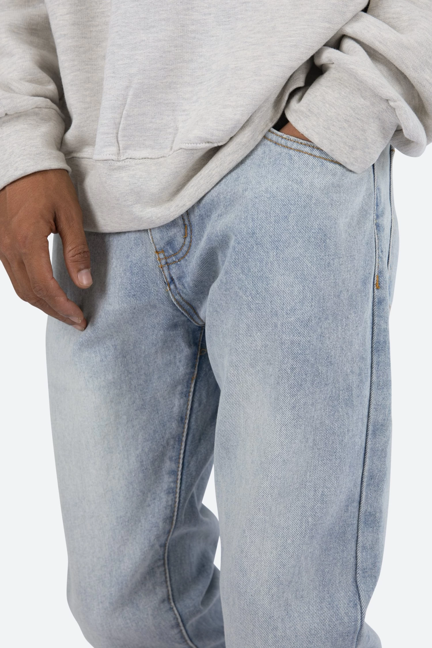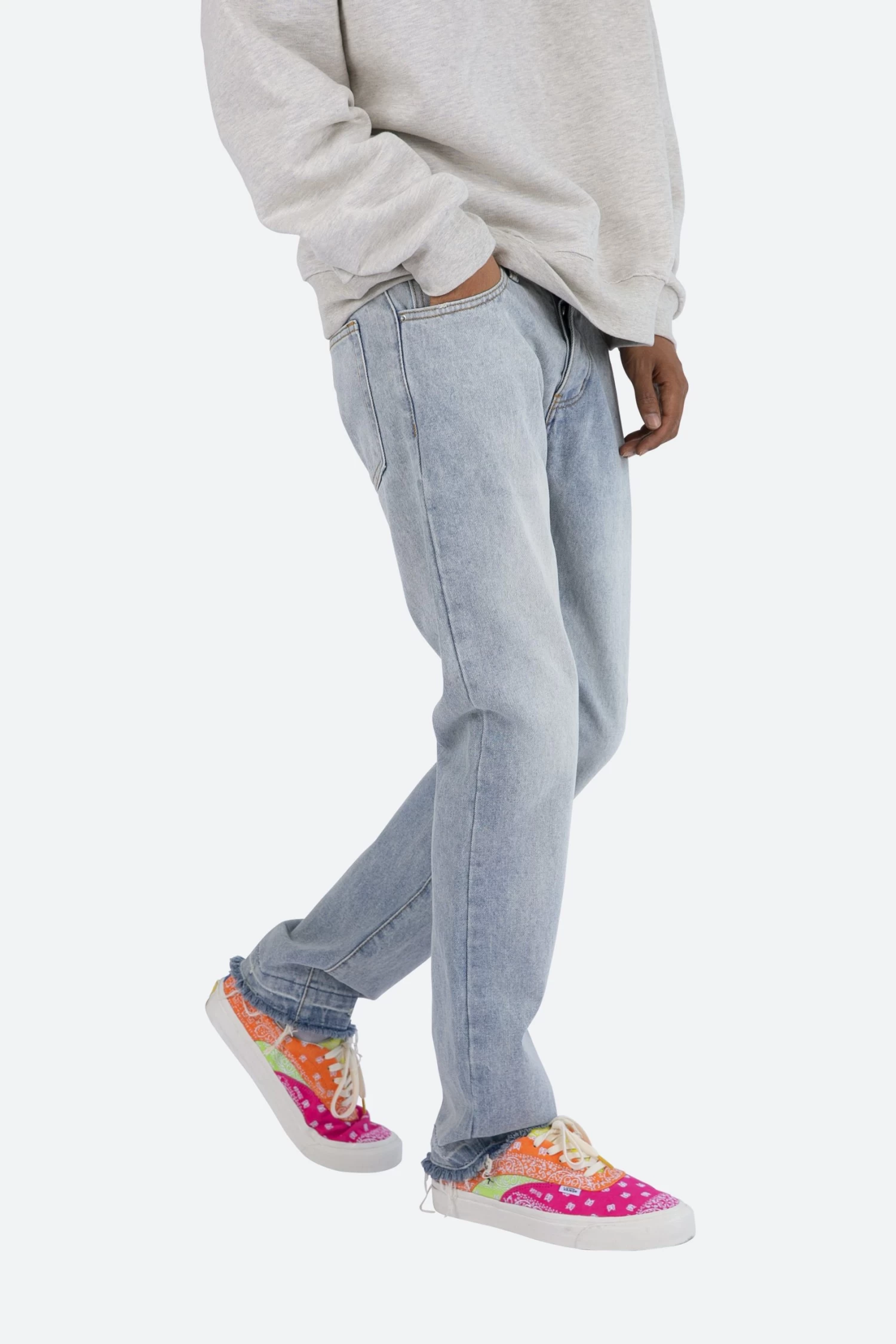 the D212 Denim is designed with our new D fit which is relaxed throughout with an extended inseam for stacking and features a warm, light wash, and finished with whiskering and sanding throughout.