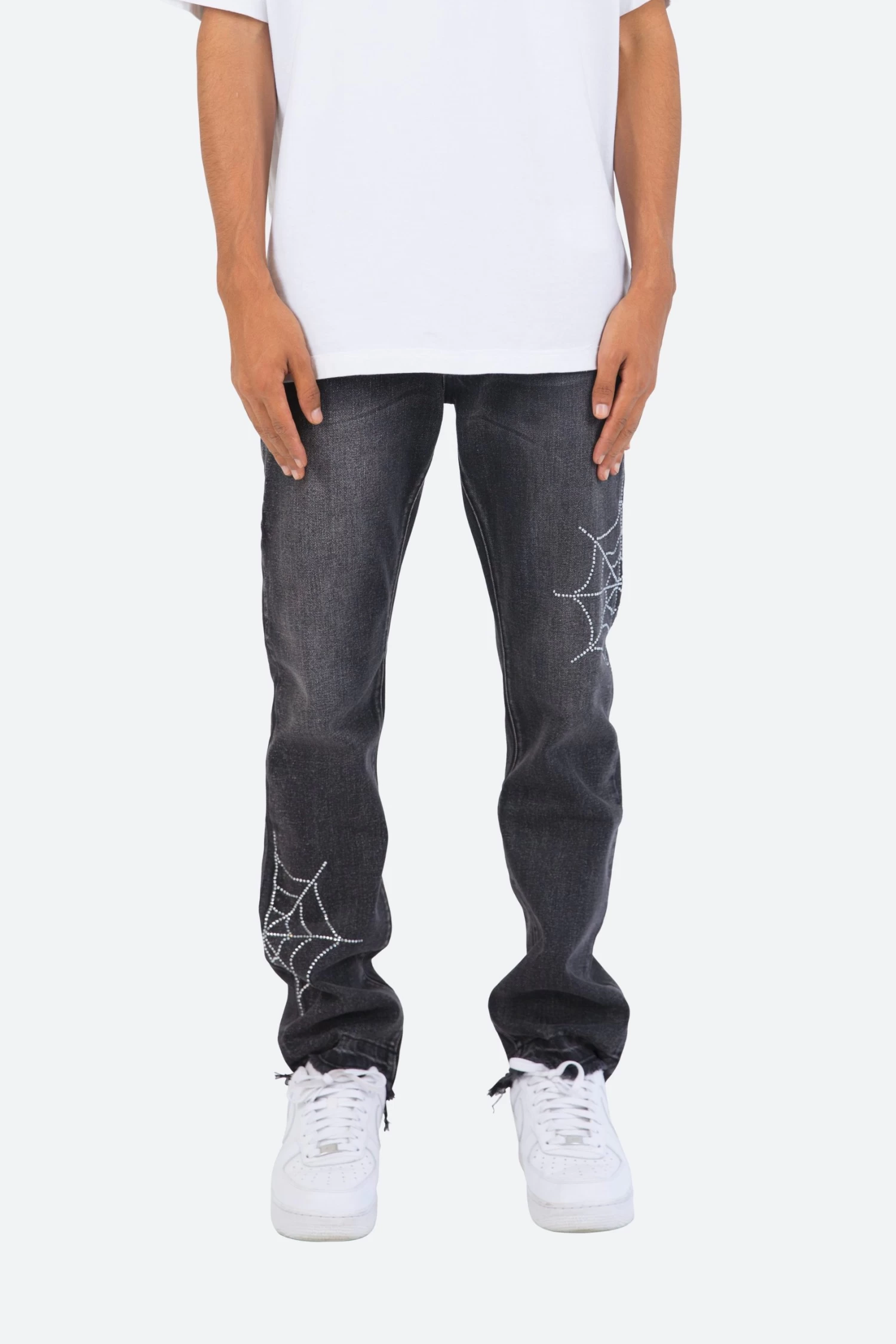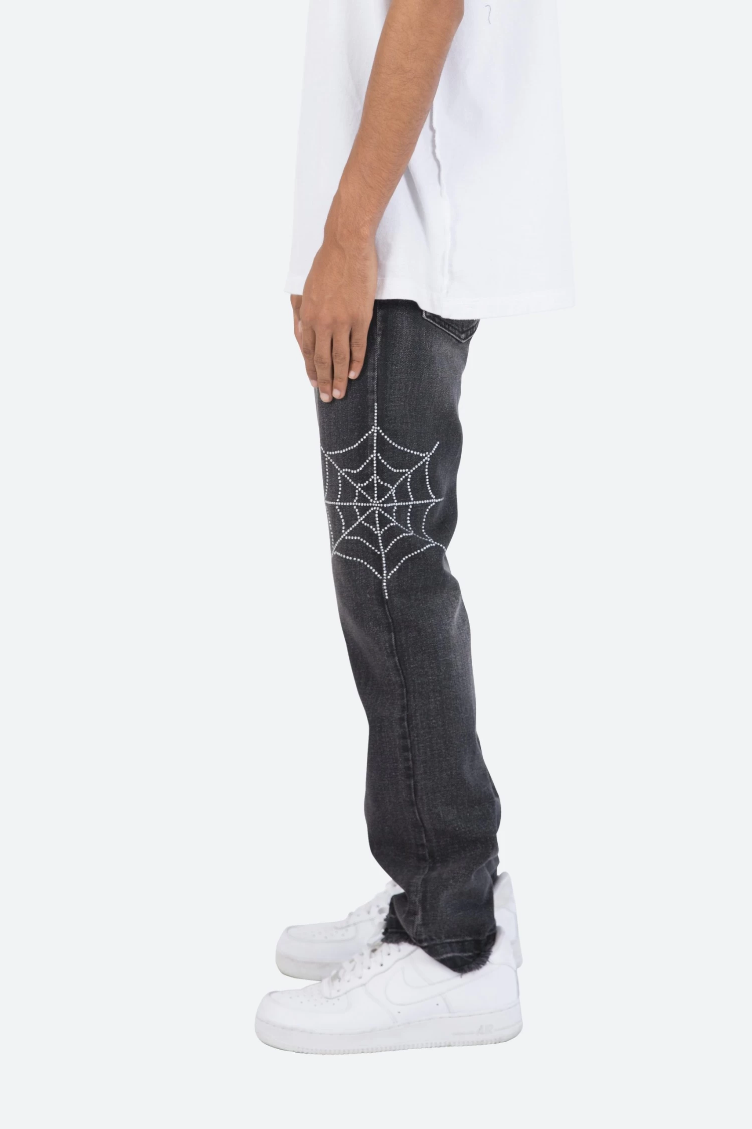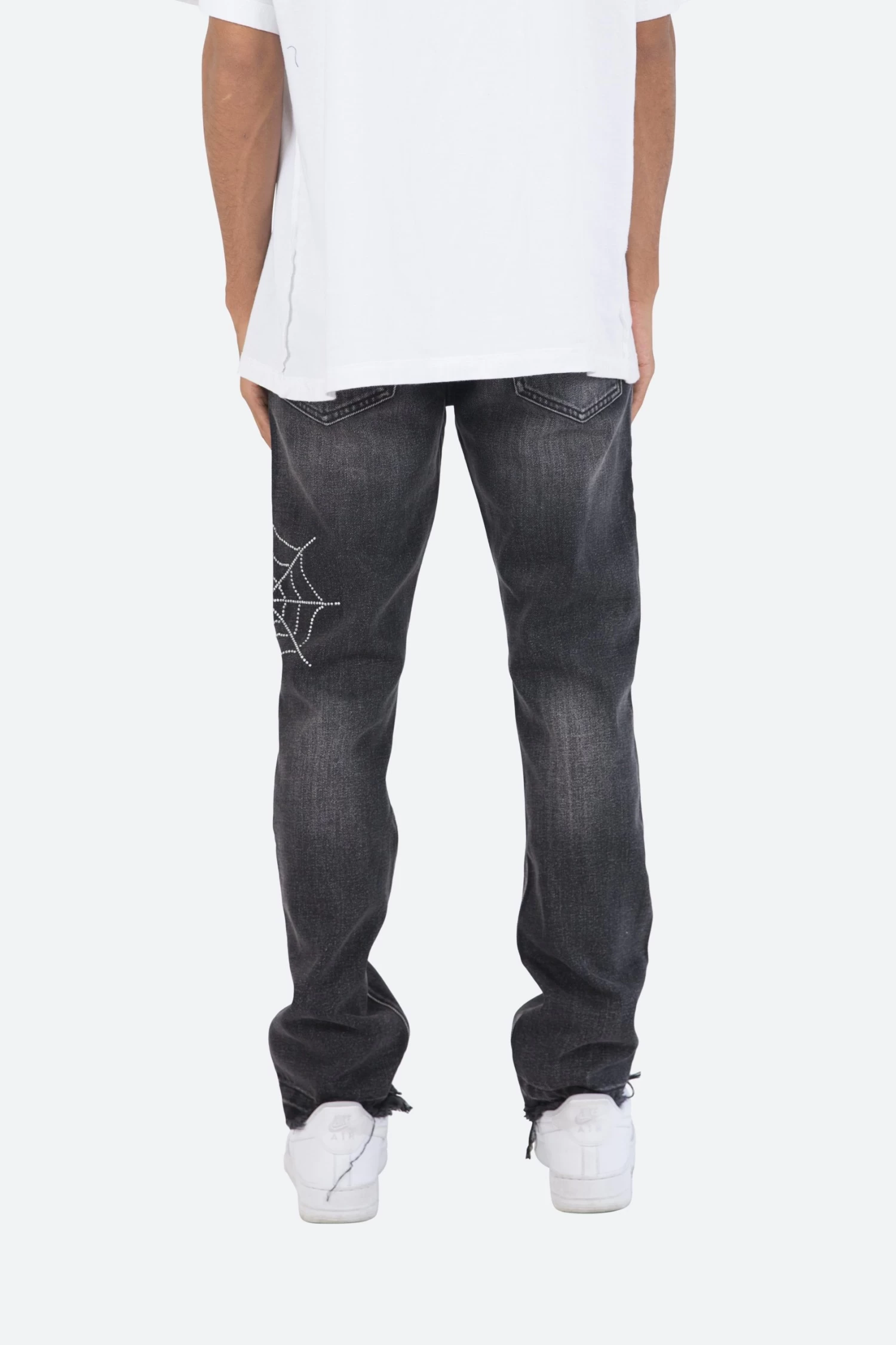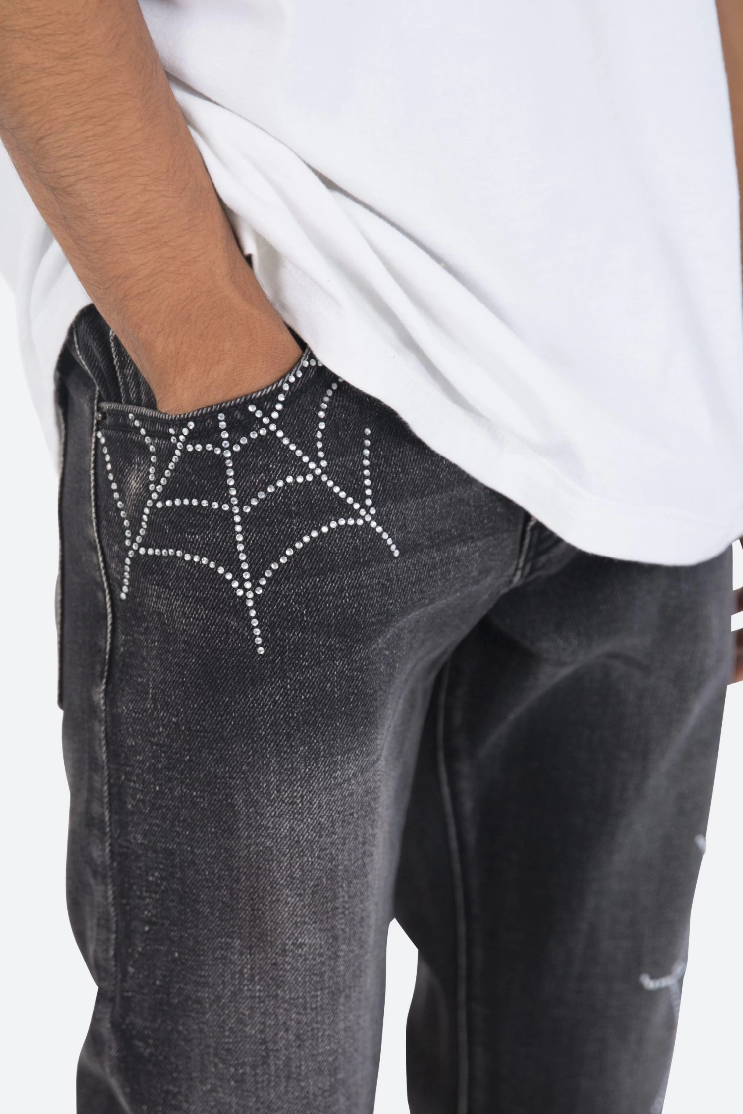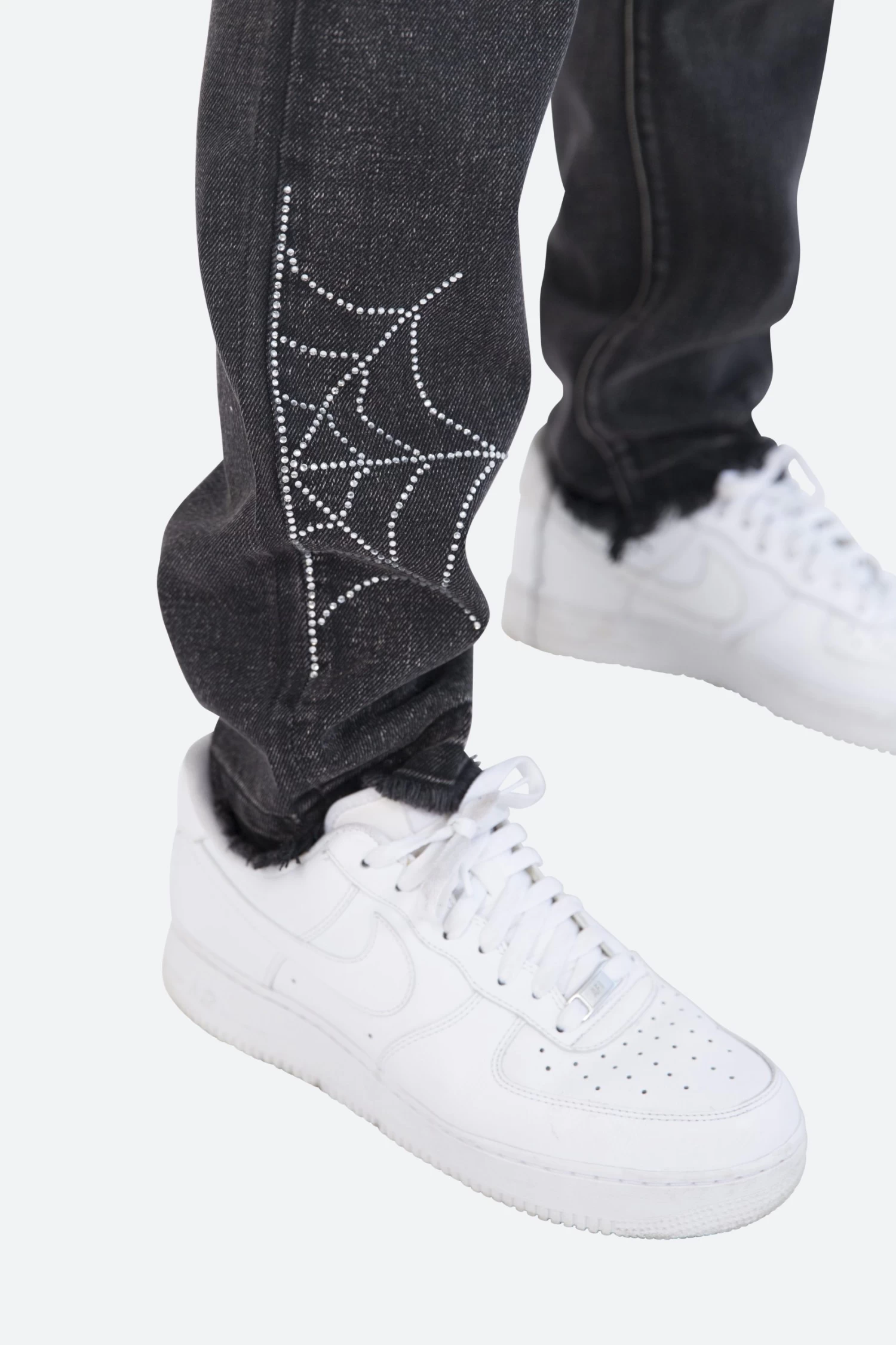 the D278 Spider Denim is designed with our new D fit which is relaxed throughout with an extended inseam for stacking and features spider web artwork in rhinestones on both legs and is constructed from black denim with a raw leg opening.