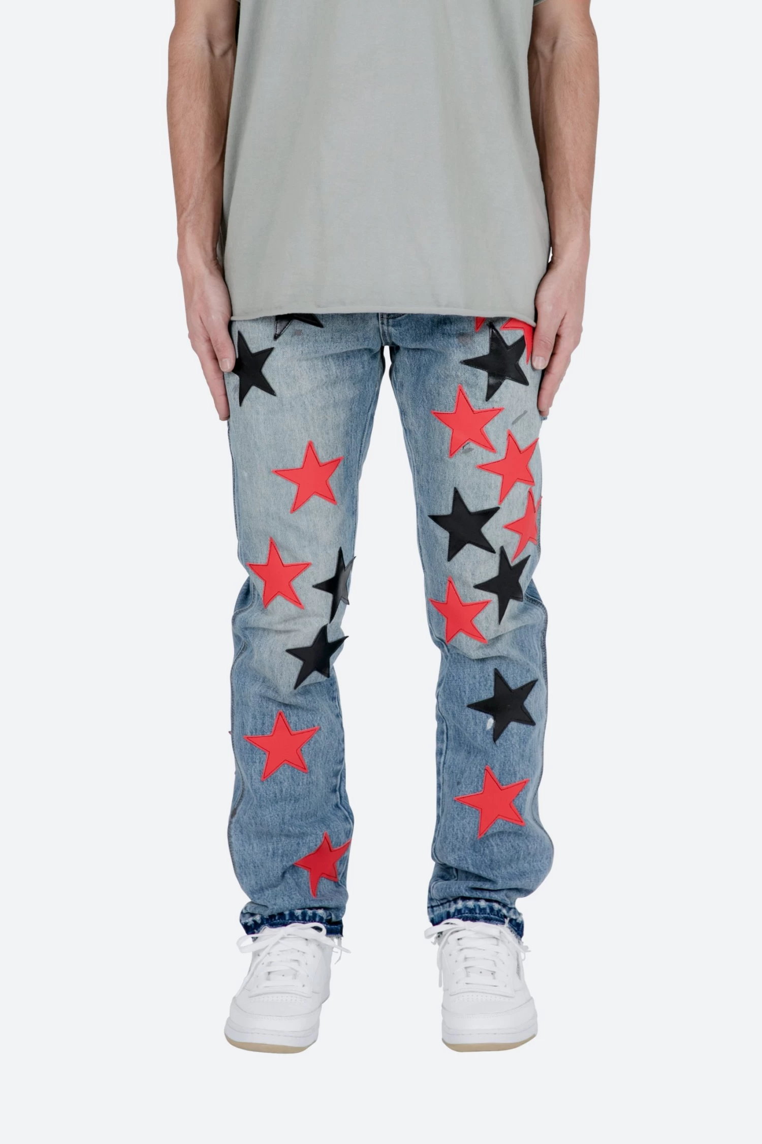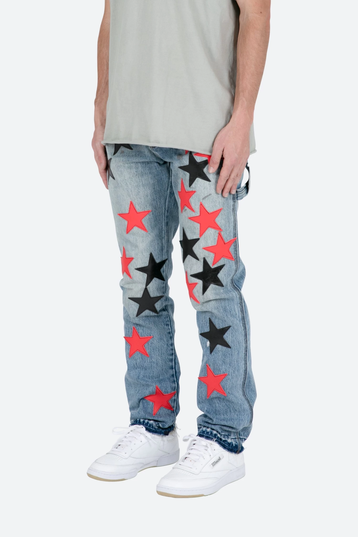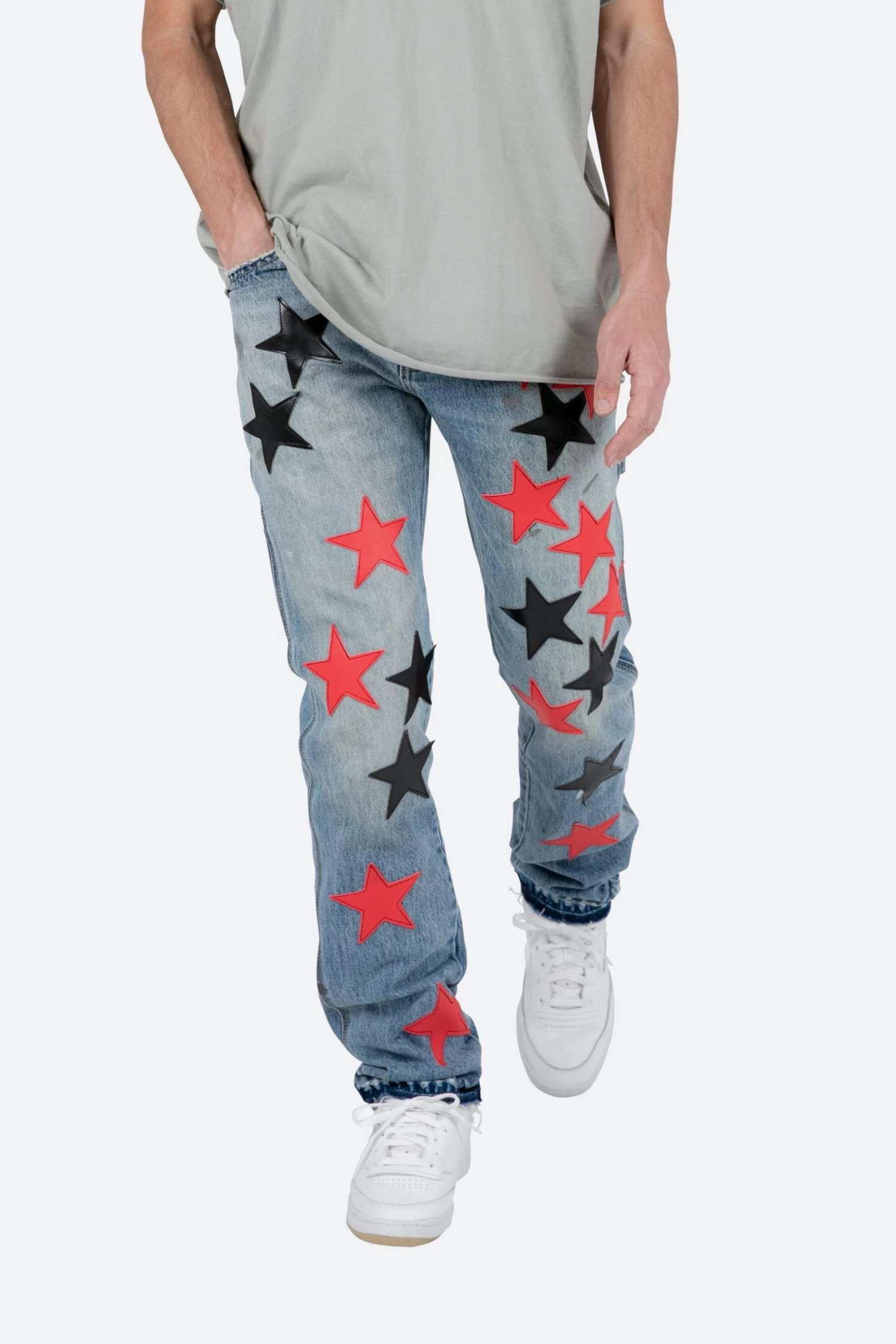 the D438 Star Denim is designed with our new D fit which is relaxed throughout with an extended inseam for stacking and features a vintage wash with whiskering and sanding throughout, and finished with poly-leather star patches throughout.