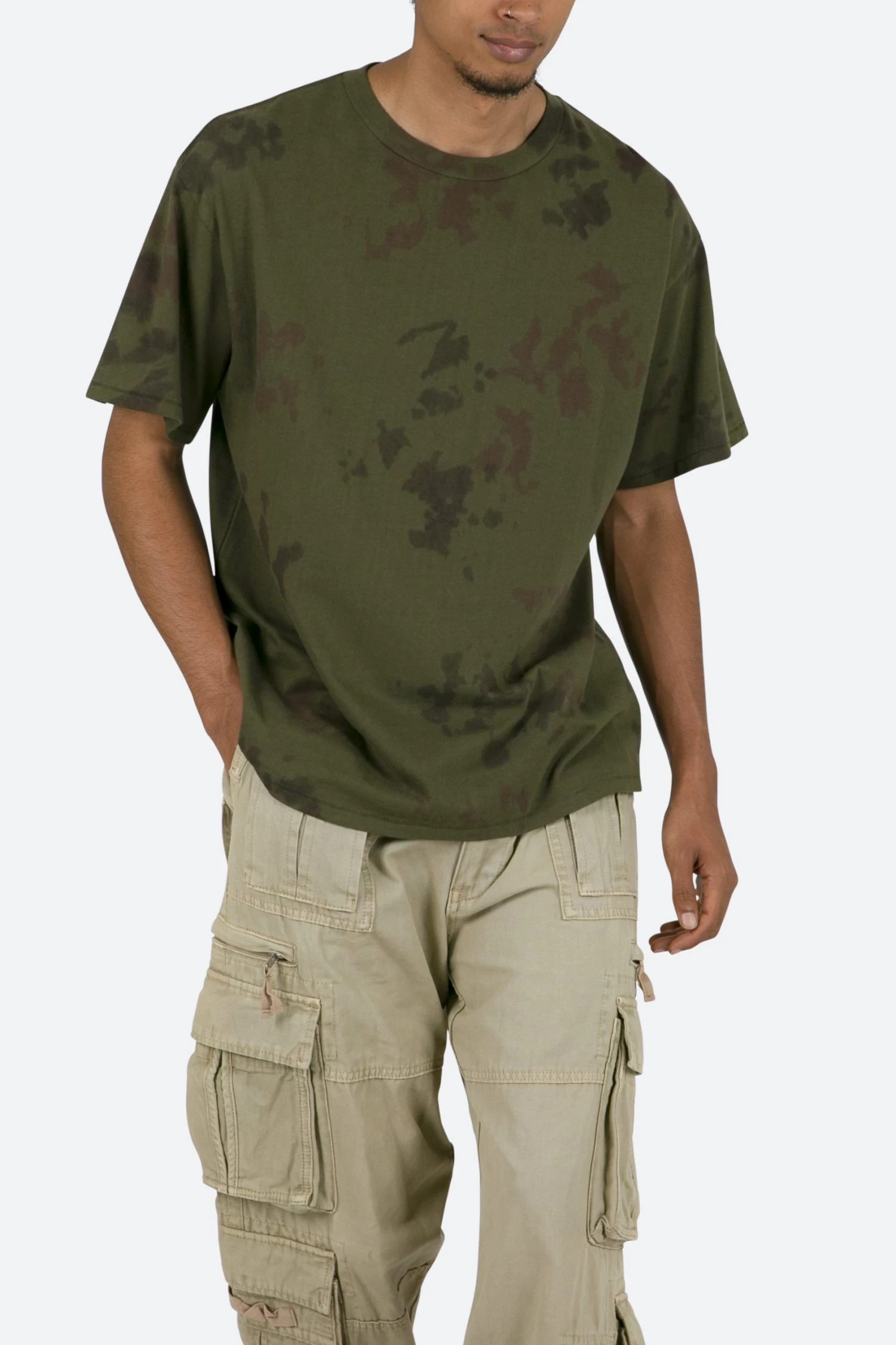 the Drab Tee features a flat hem line and an extended shoulder seam for a relaxed, dropped shoulder fit, constructed from a washed cotton fabric, and finished with multi colored dye details throughout