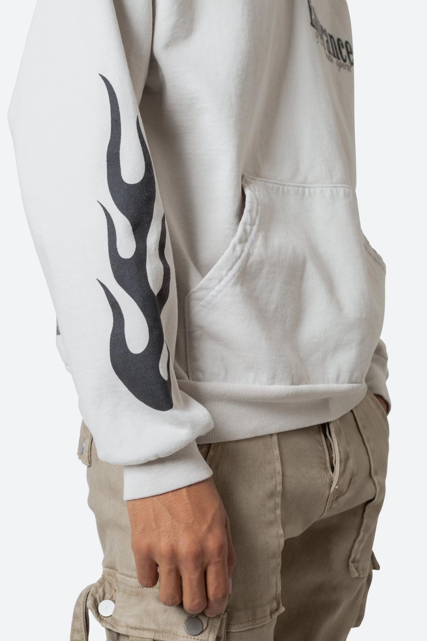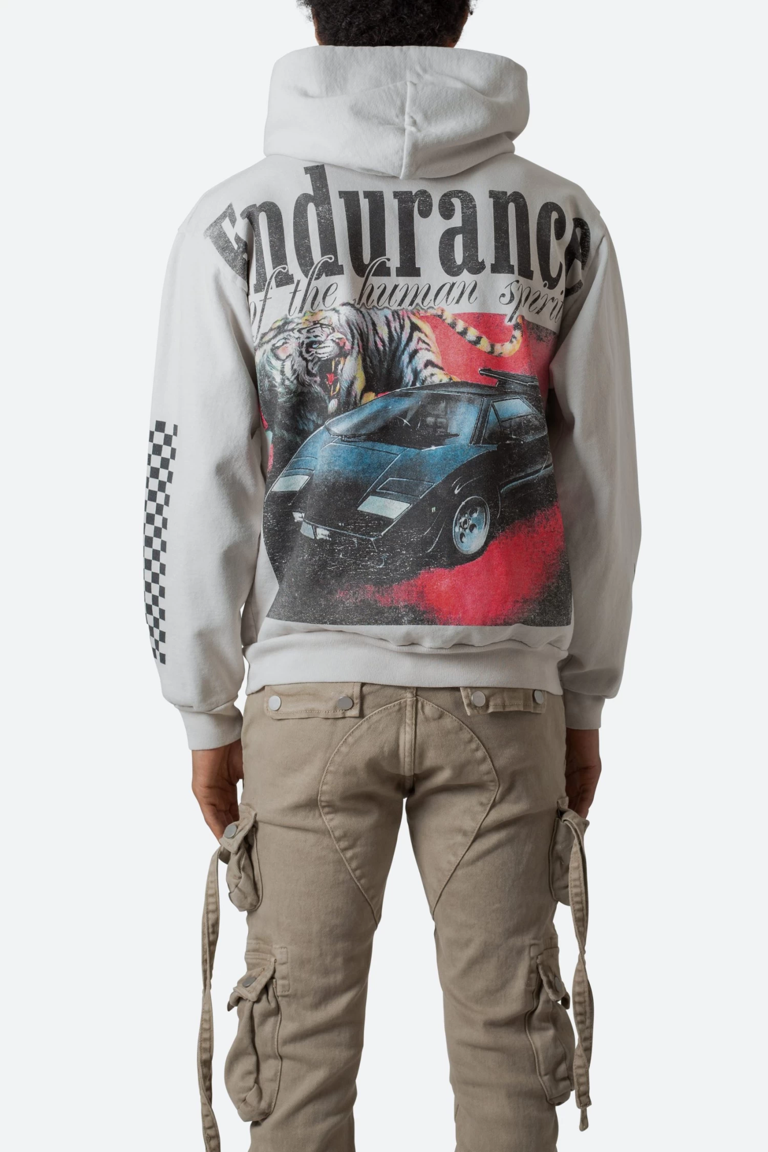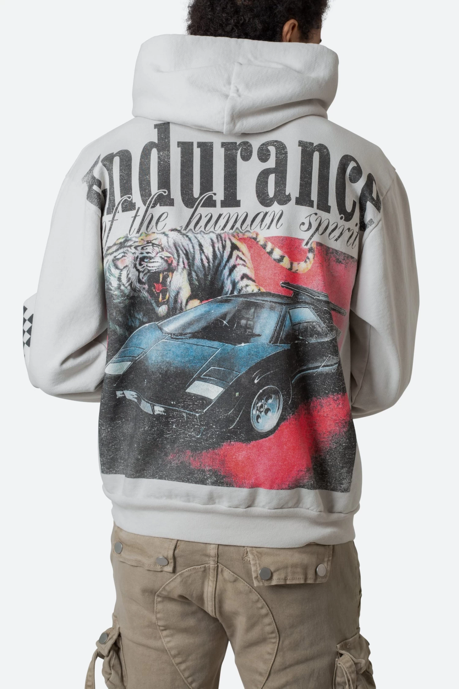 the Endurance Hoodie features a standard fit, a front pouch pocket, and body matched ribbing at the waist, side seam, and wrists, finished with a multi color print on the chest, sleeves, and back, all on a made in the USA blank.