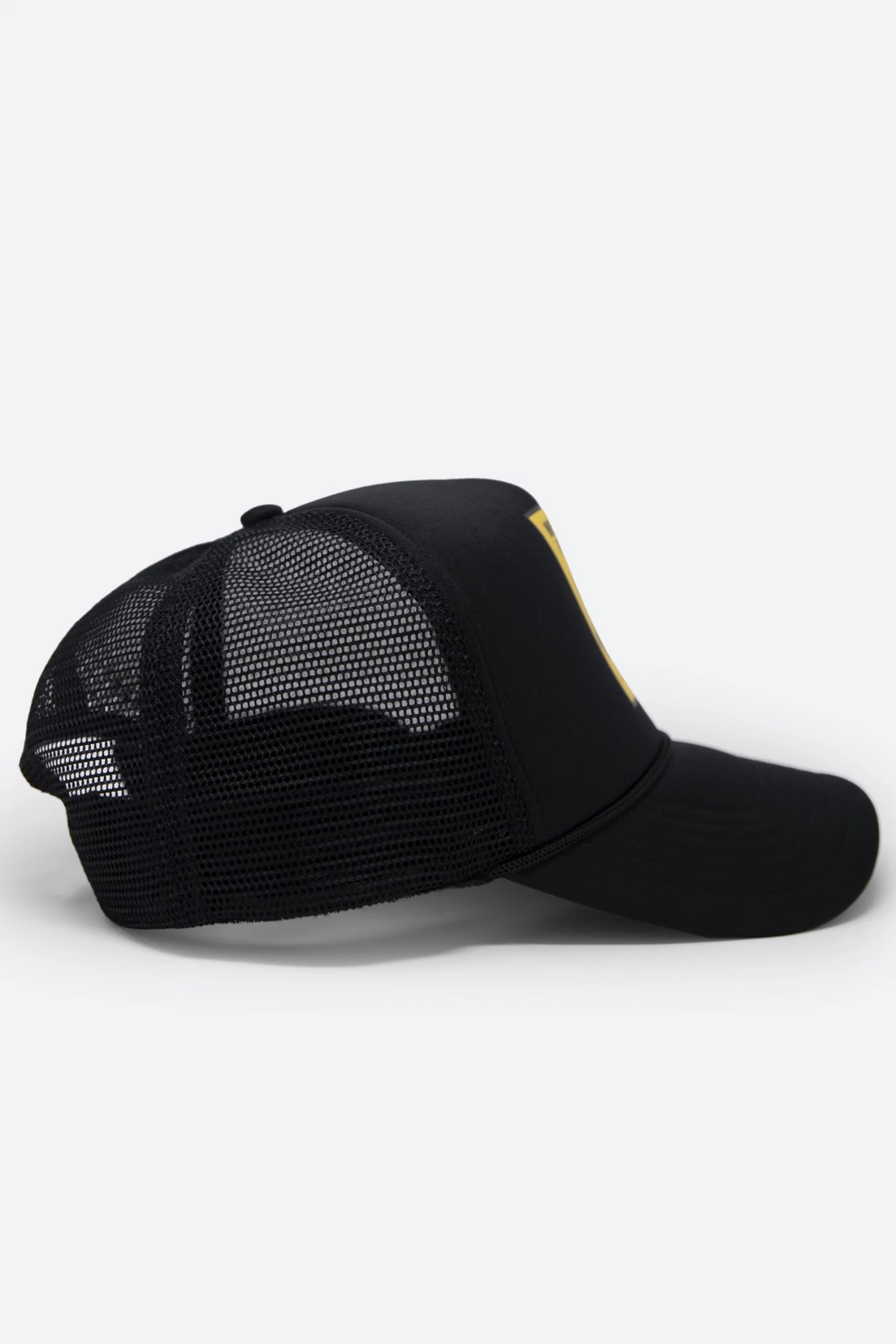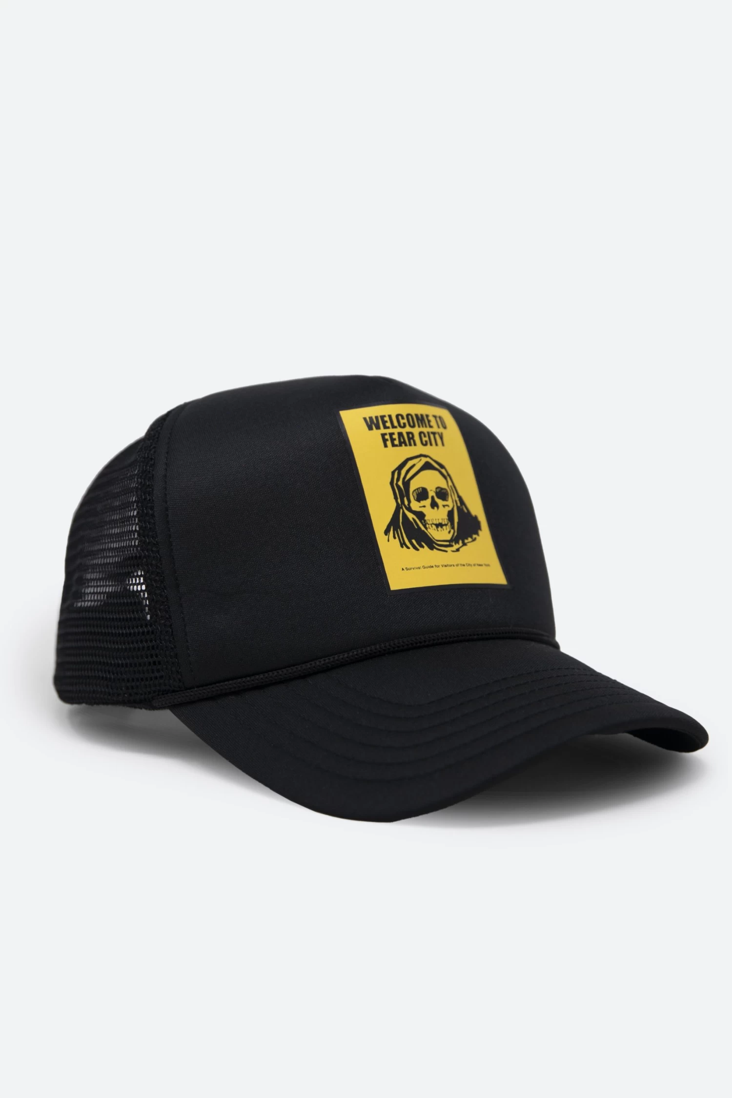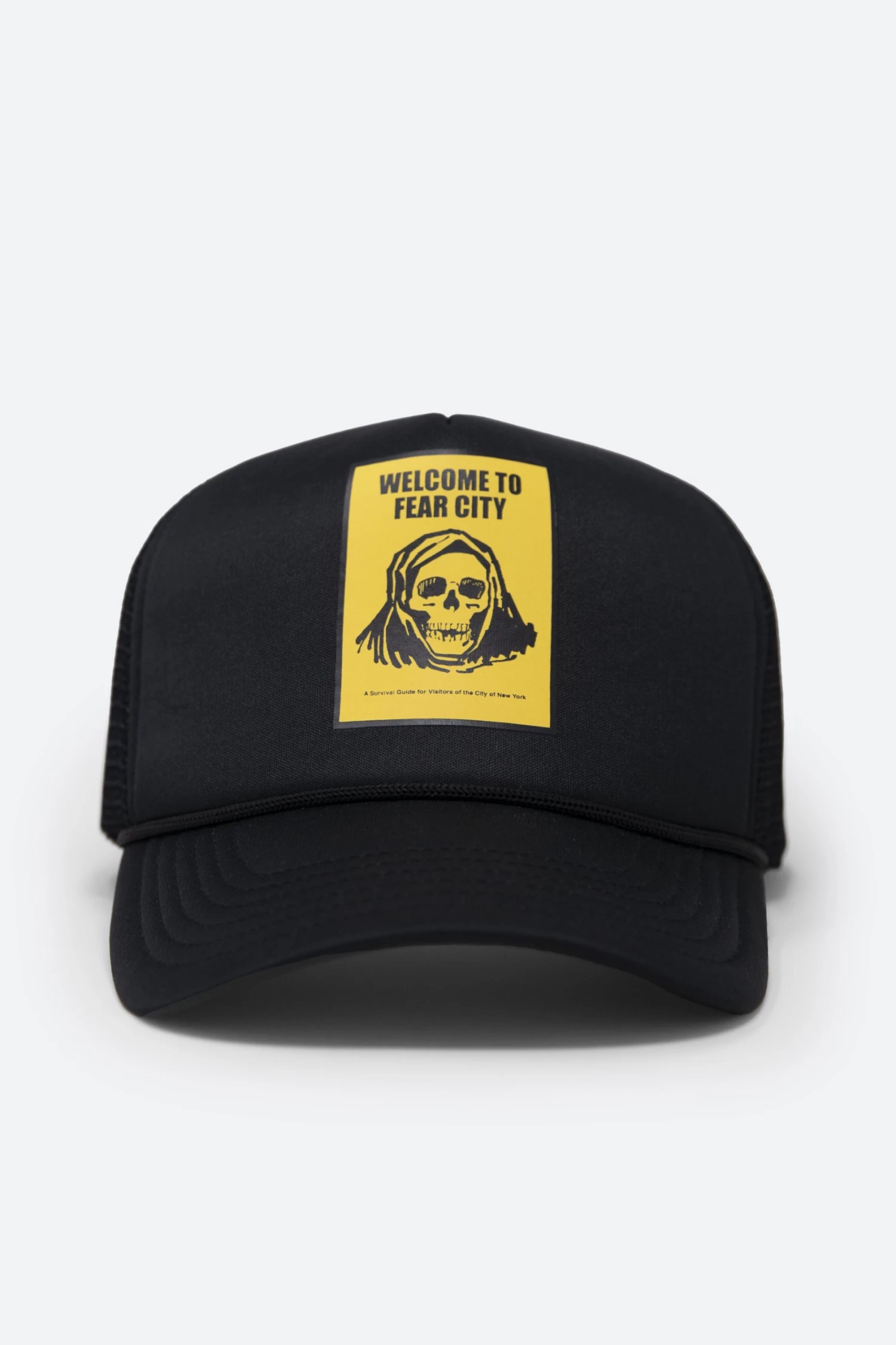 the Fear City Trucker Cap is constructed from a neoprene front panel and brim, mesh back, and finished with a screenprint at the front.