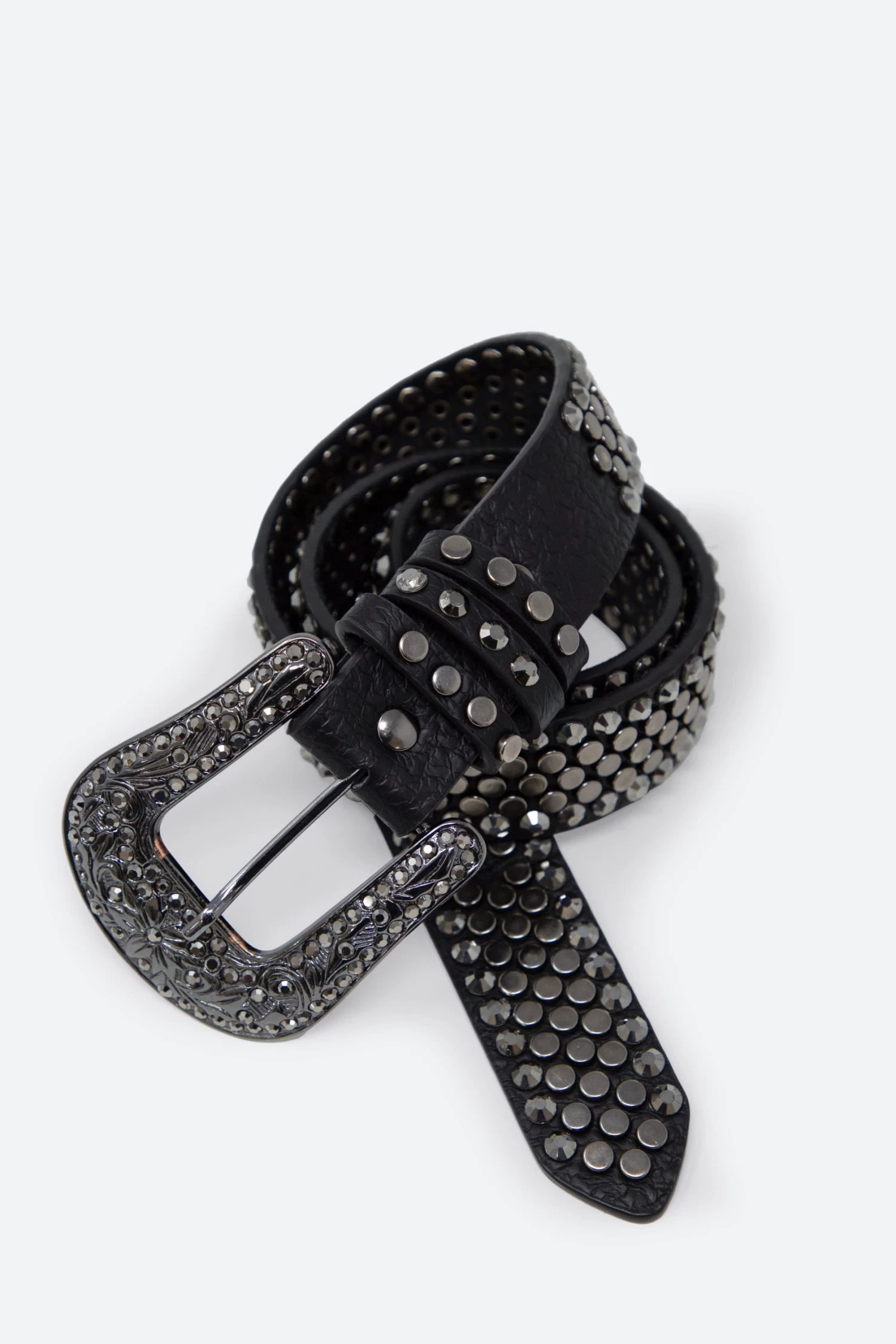 The Flathead Metal Studded Belt is made from black vegan leather and features intricate Western design motifs on the metal buckle and loop, with silver flathead metal stud embellishment throughout.