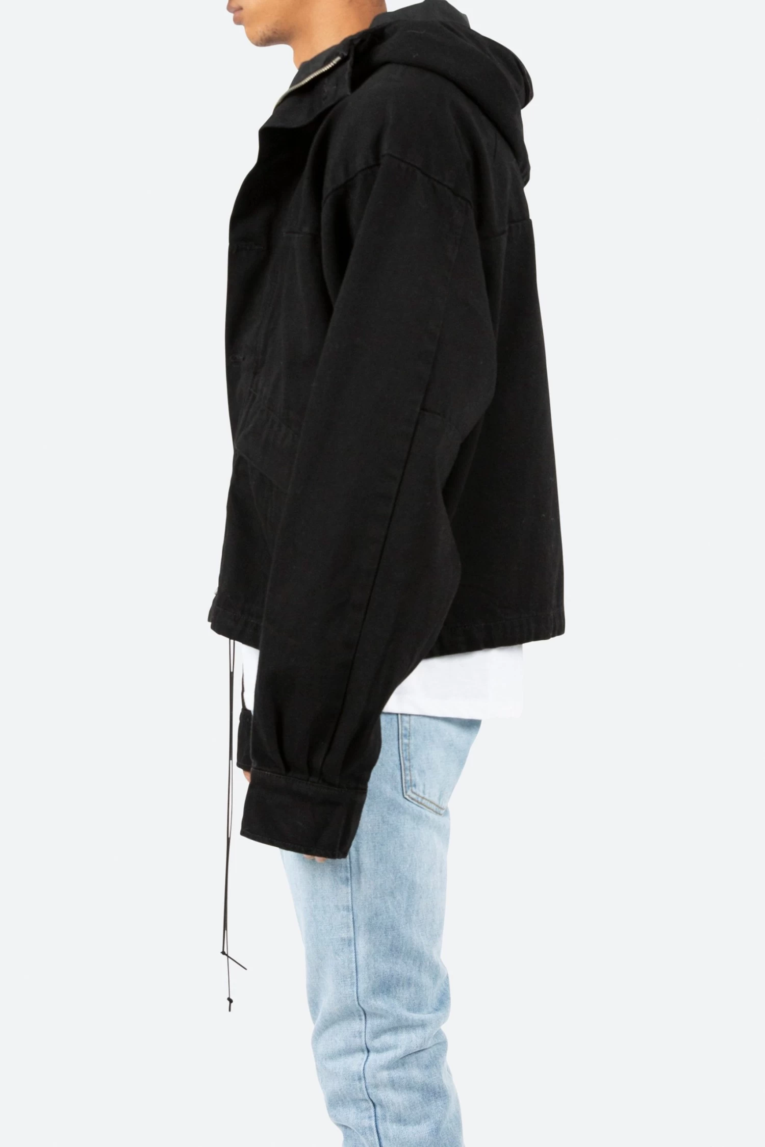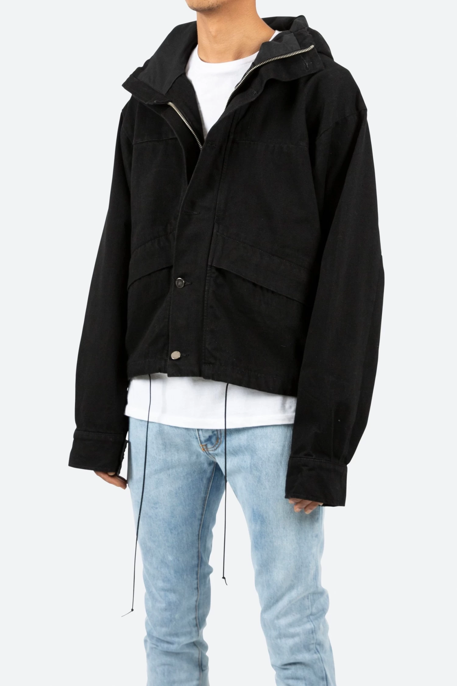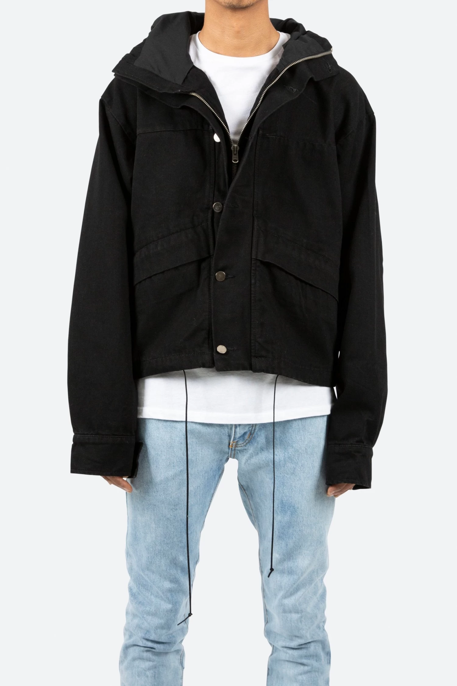developed in Los Angeles, the Hooded Denim Jacket is designed with an oversized fit and features a cropped body, extended sleeves, button placket, drawcord at the waist and oversized hood.