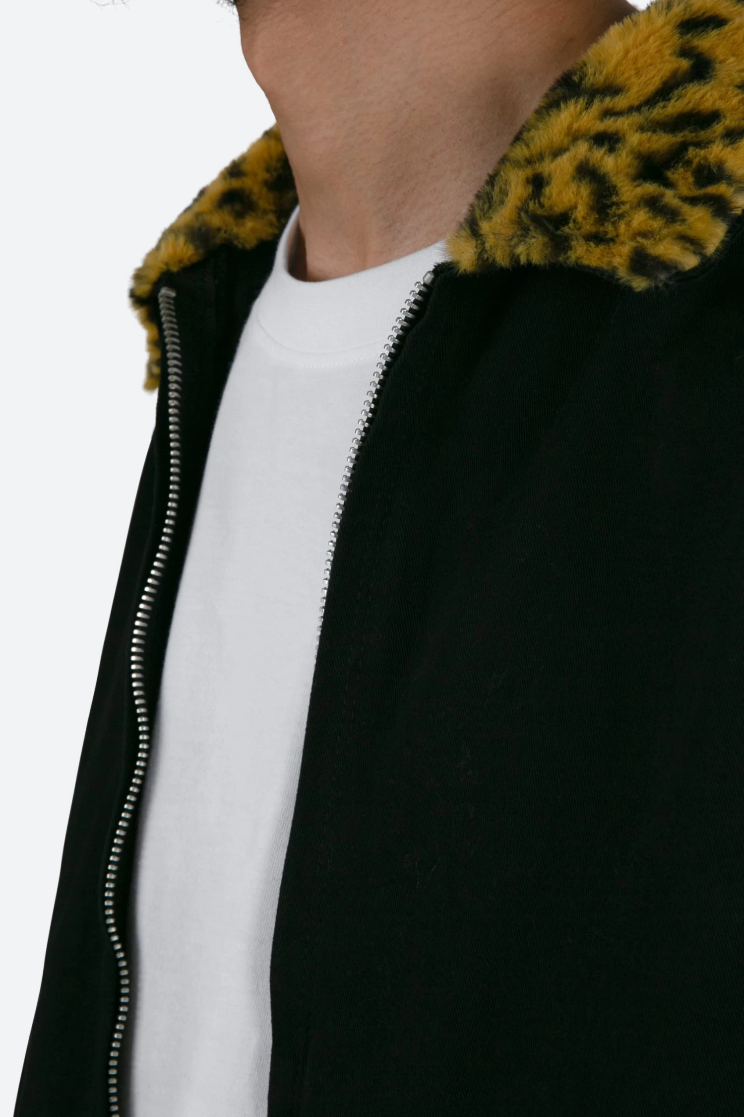 the Leopard Work Jacket is designed in a cotton twill fabric and features pockets at the waist, zipper closure at the chest, faux leopard fur collar, and is finished with a light wash for improved hand feel.