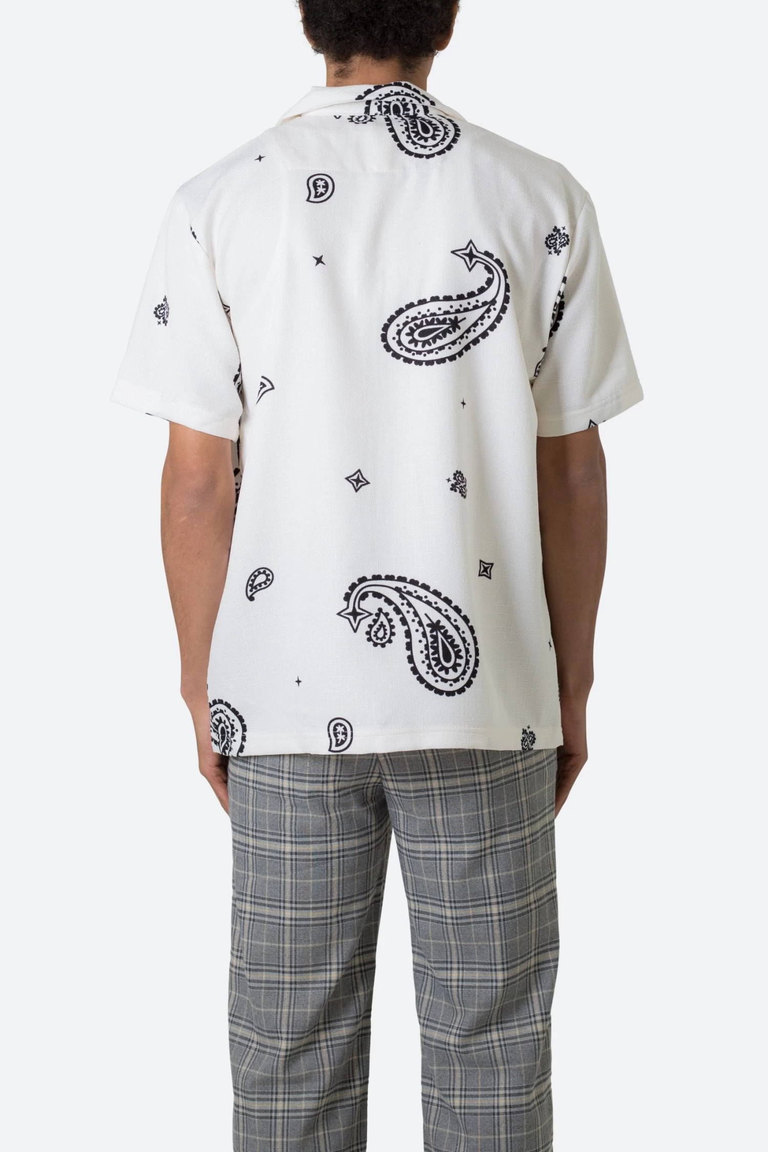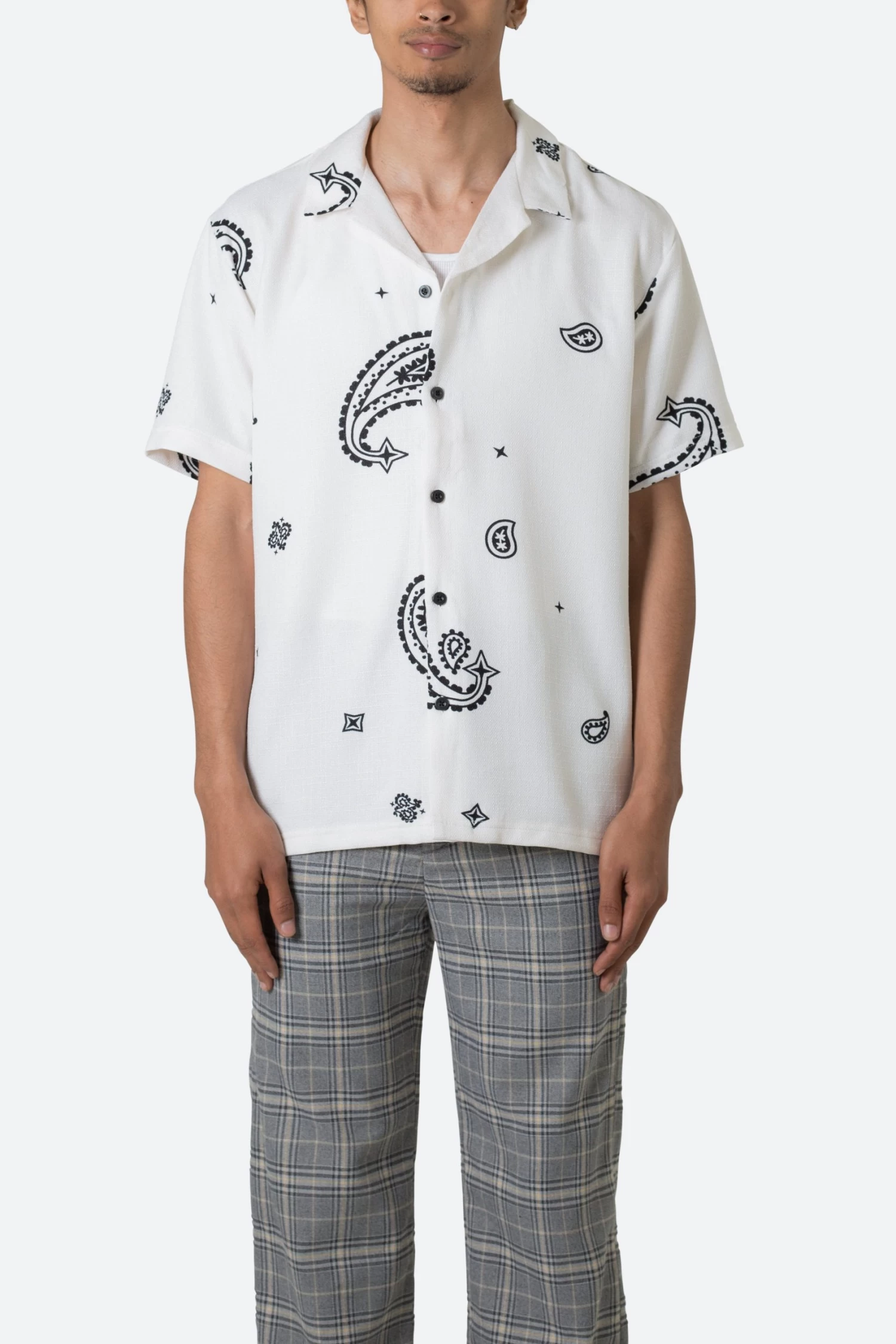 the Linen Blend S/S Shirt is made from a linen weaved cotton fabric with an all-over paisley print. The relaxed-fit shirt features tonal buttons, flat hem, and finished in a relaxed fit.