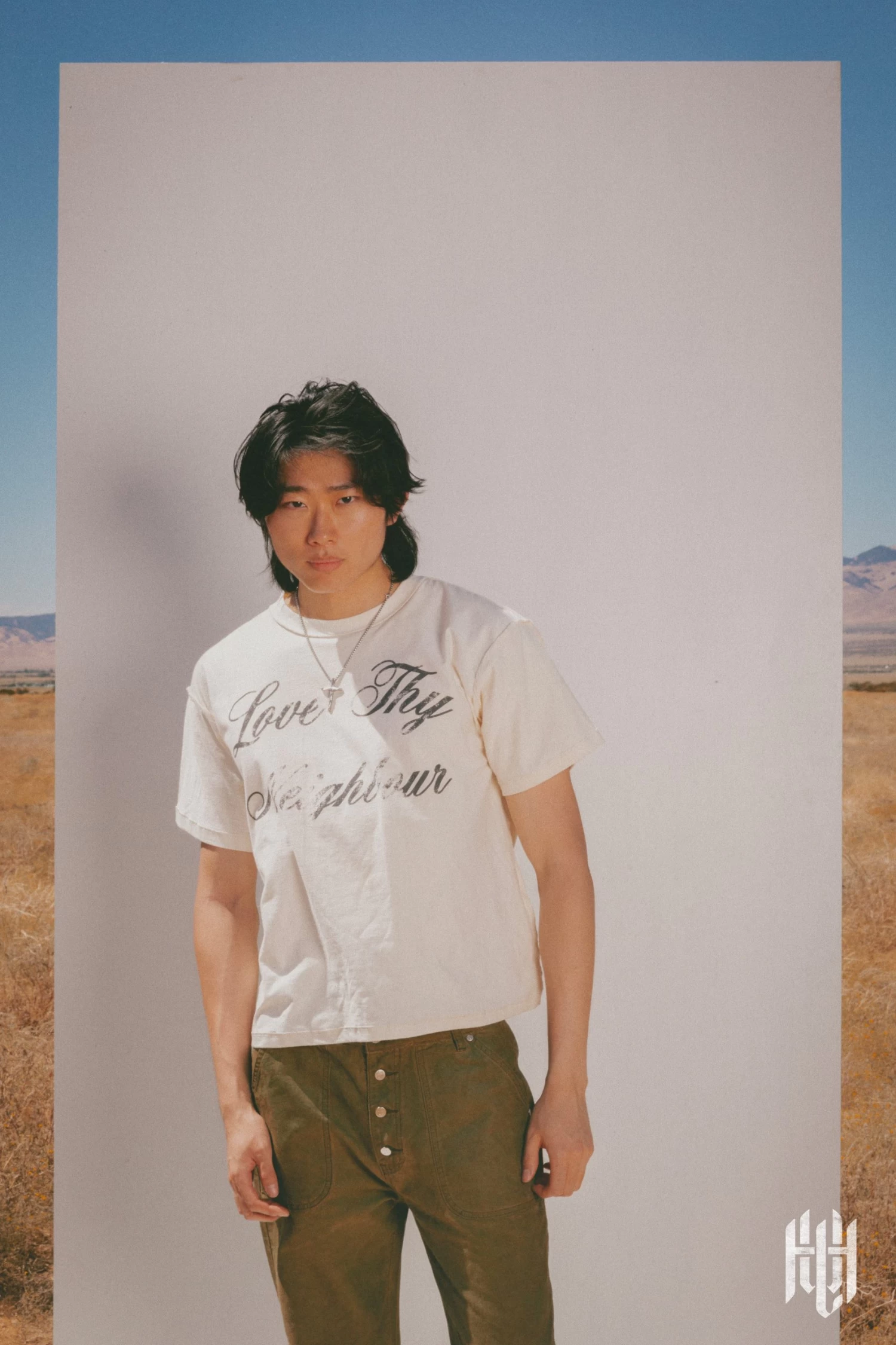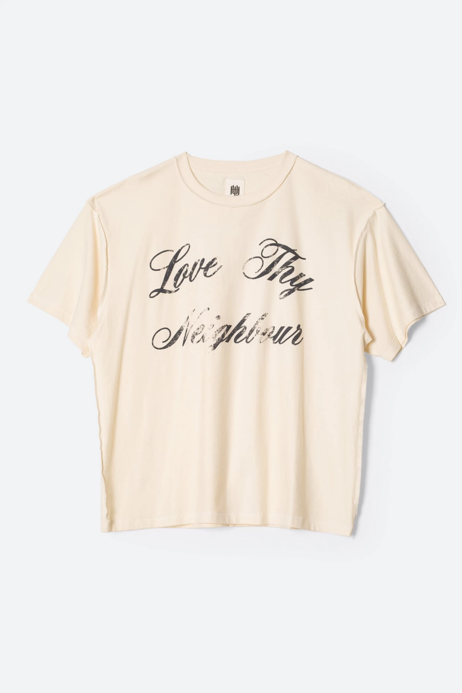 The Love Thy Neighbor Tee is printed in the USA on a custom developed, vintage inspired blank. The tee features a relaxed and boxy fit, ribbing at the neck, a standard hem, a printed graphic on the front, and is finished inside out.