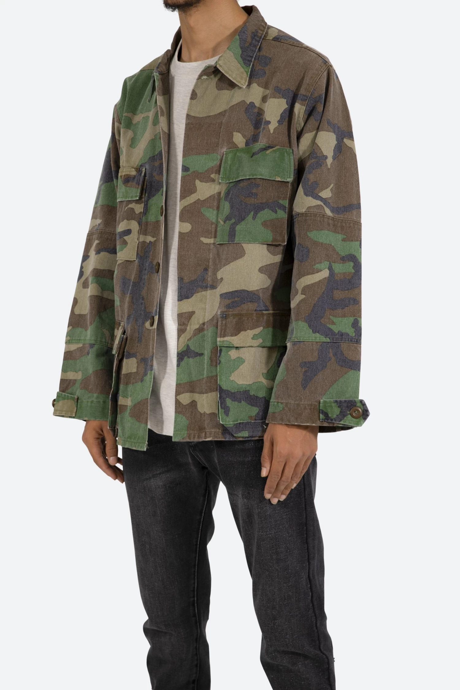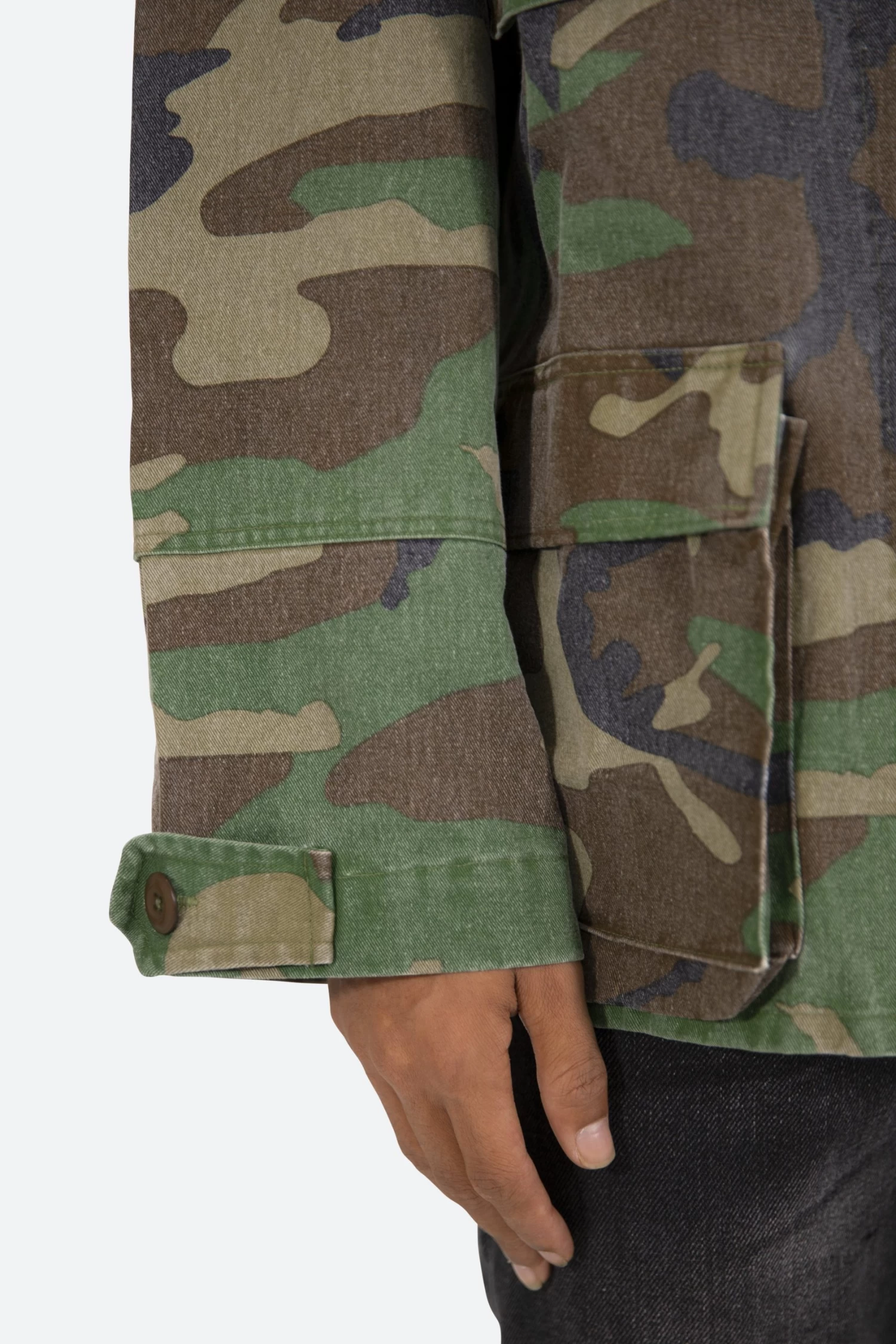 the M65 Shirt is designed with a relaxed fit and features a flat hemline, an adjustable button closure at the wrist, cargo pockets on the chest and waist, and finished in a custom developed camo printed twill fabric with a vintage wash.