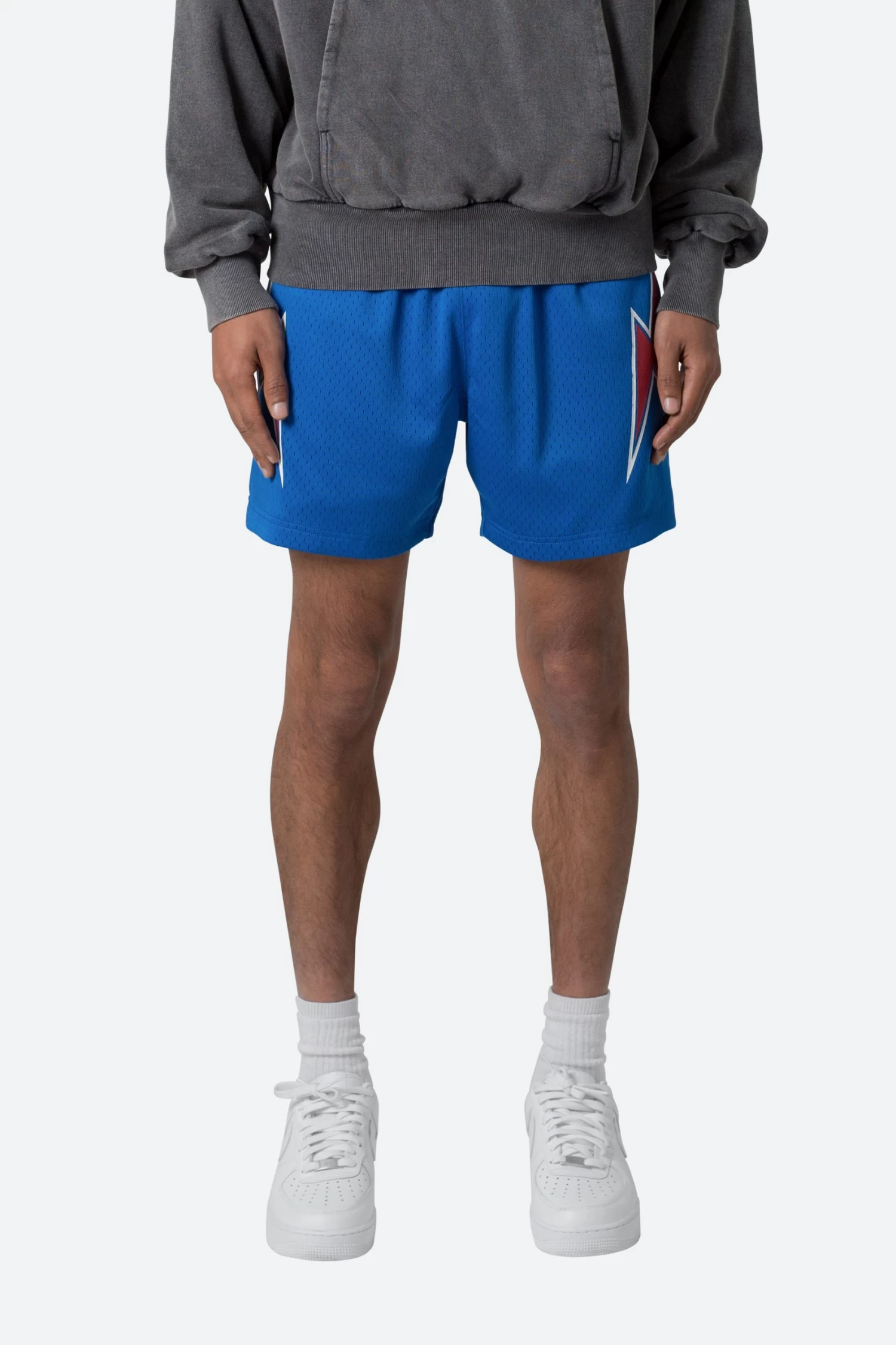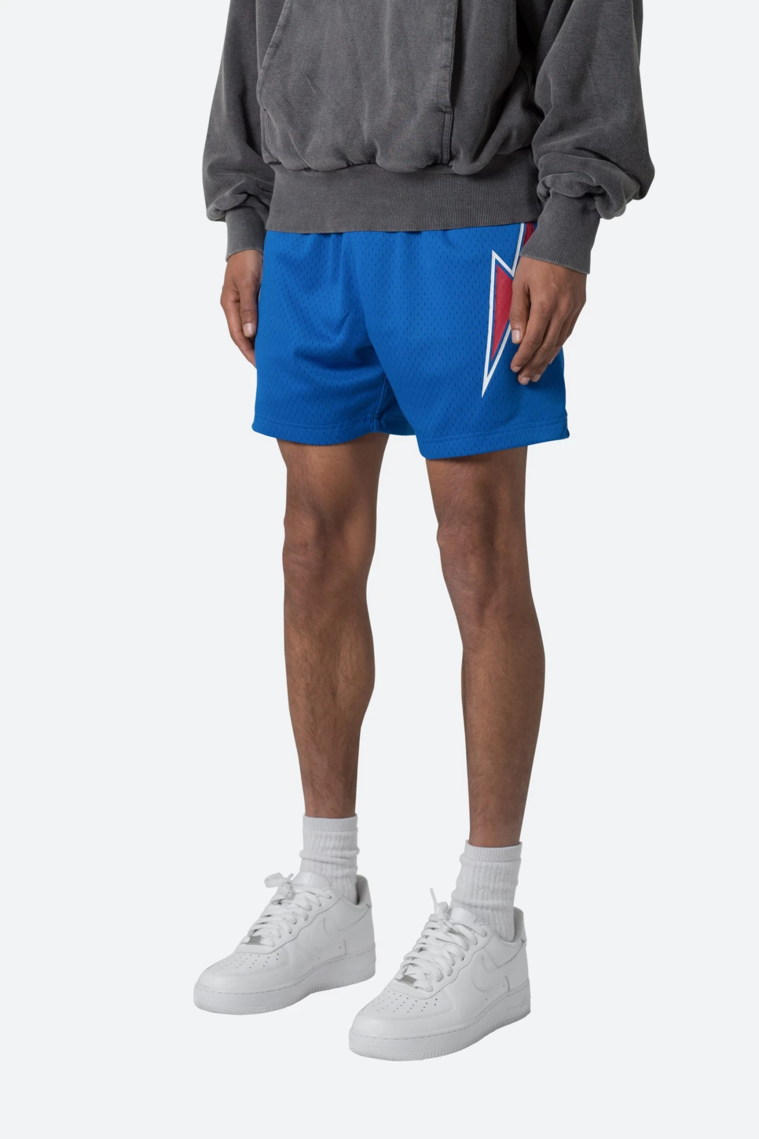 the Mesh Basketball Shorts are constructed with a custom-knit mesh fabric in a relaxed fit. The short features screen printed lightning bolts down the outseam, welt pockets on the front, and an internal drawstring.