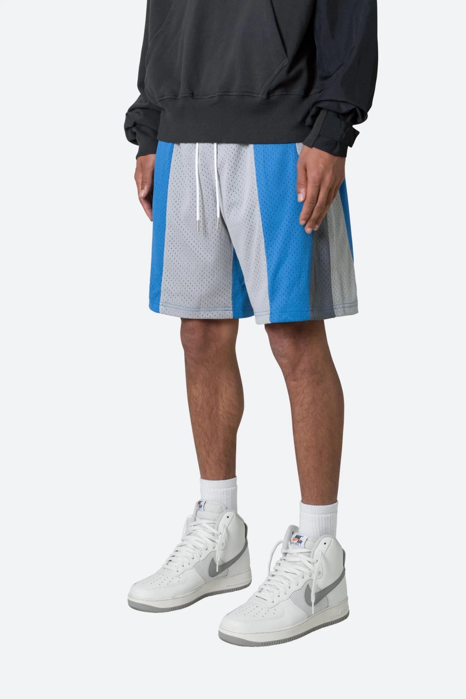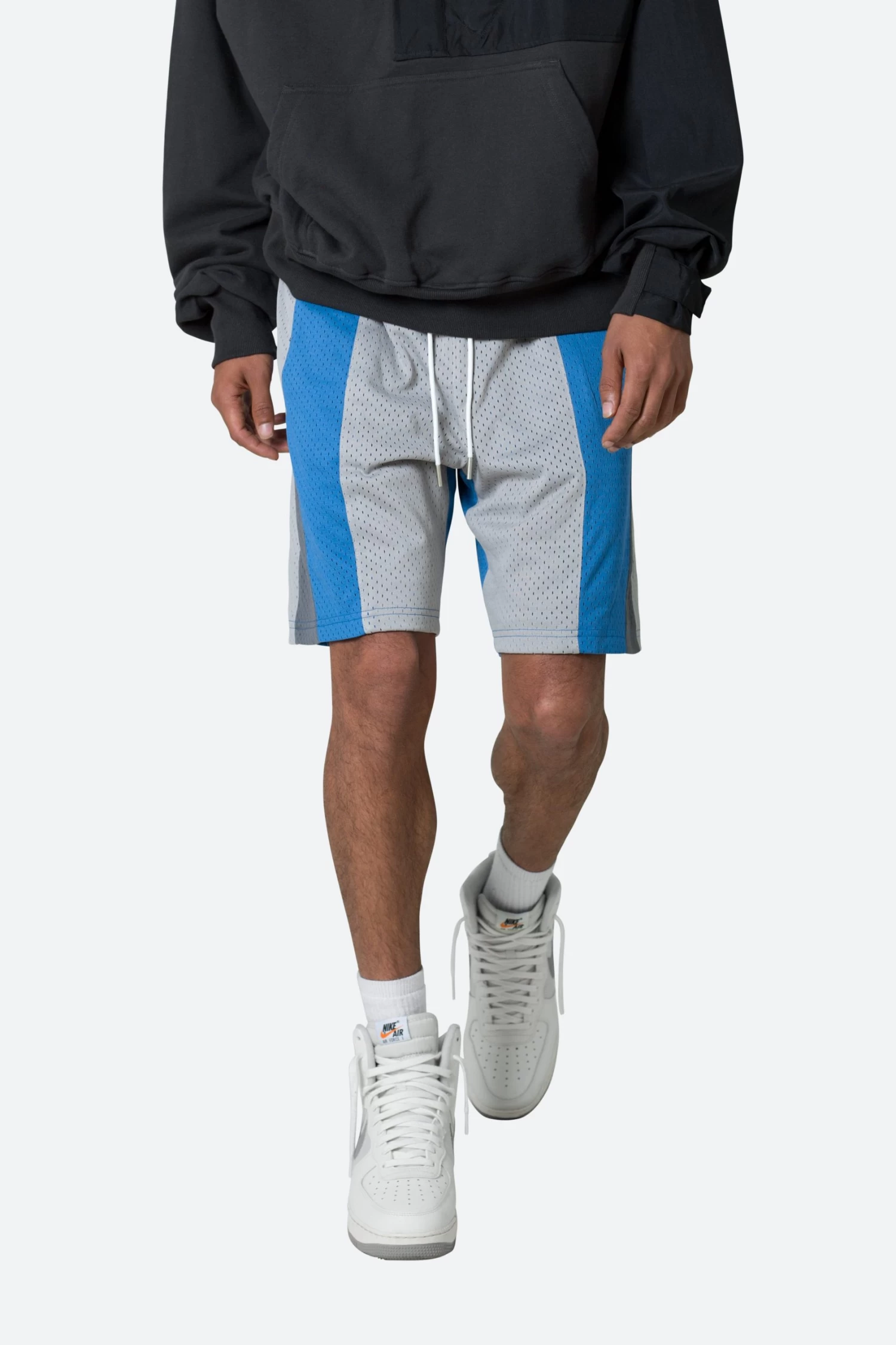 the Mesh Paneled Shorts are constructed with a synthetic fabric in a relaxed fit. The short feature an elasticized waist, zipper pockets at the front, contrasting color blocked panels, and finished with a drawcord.