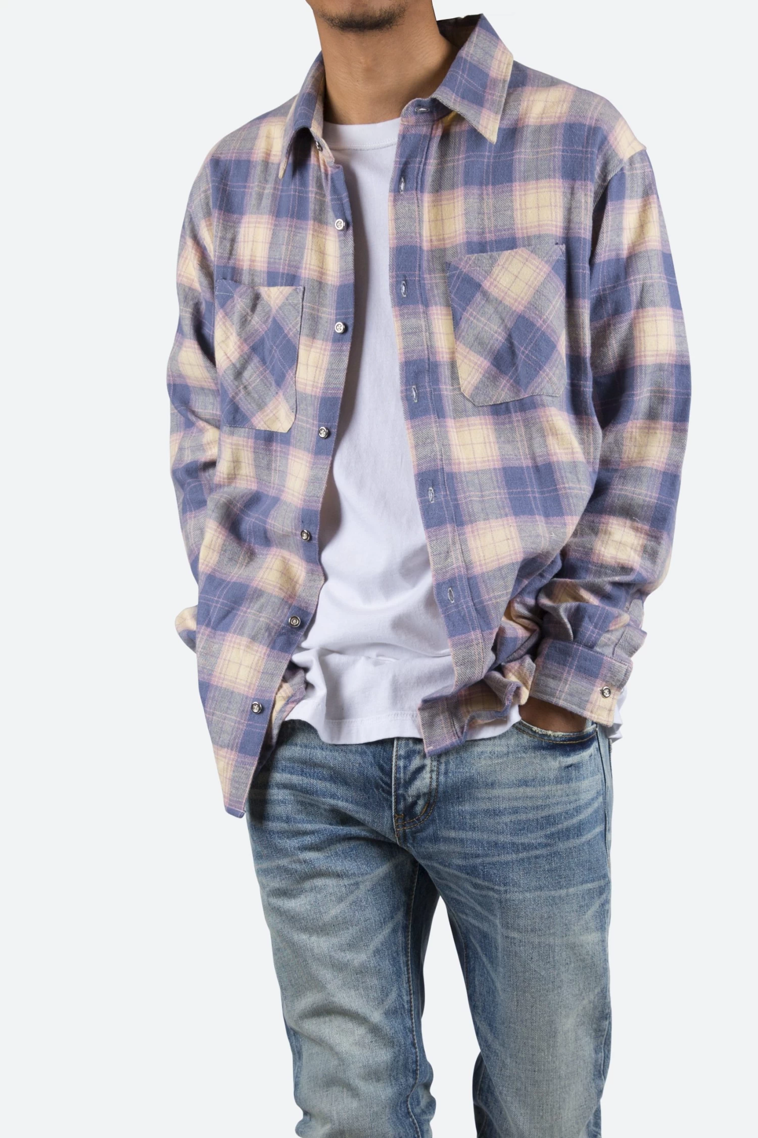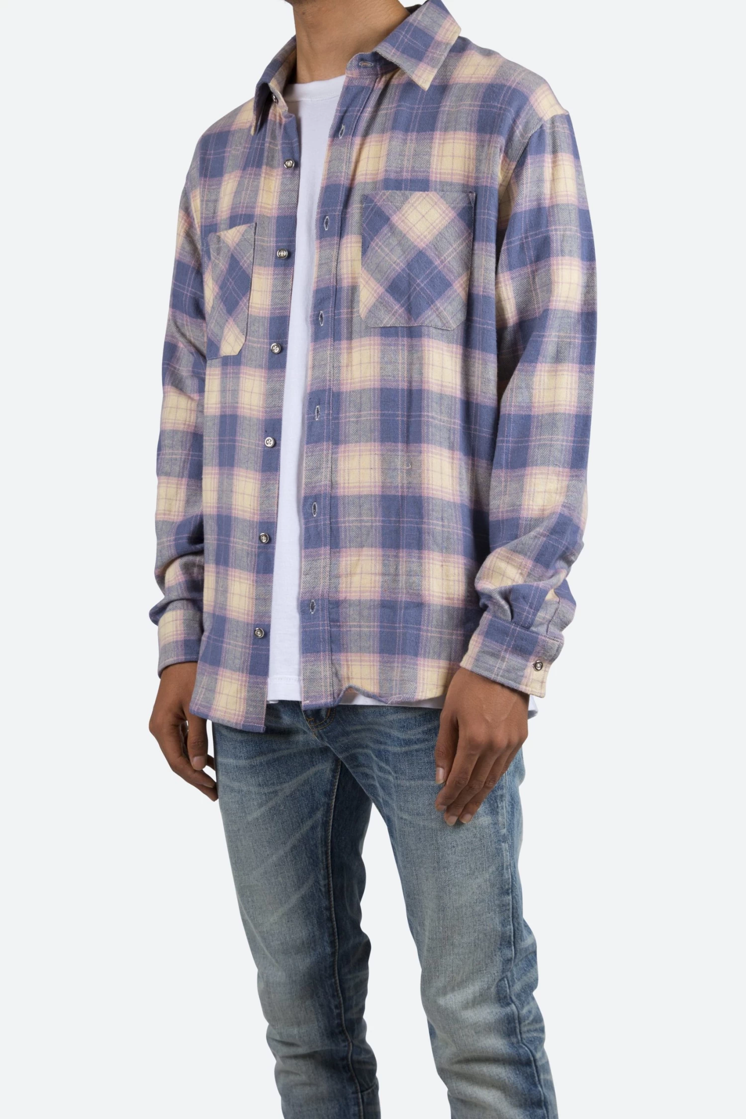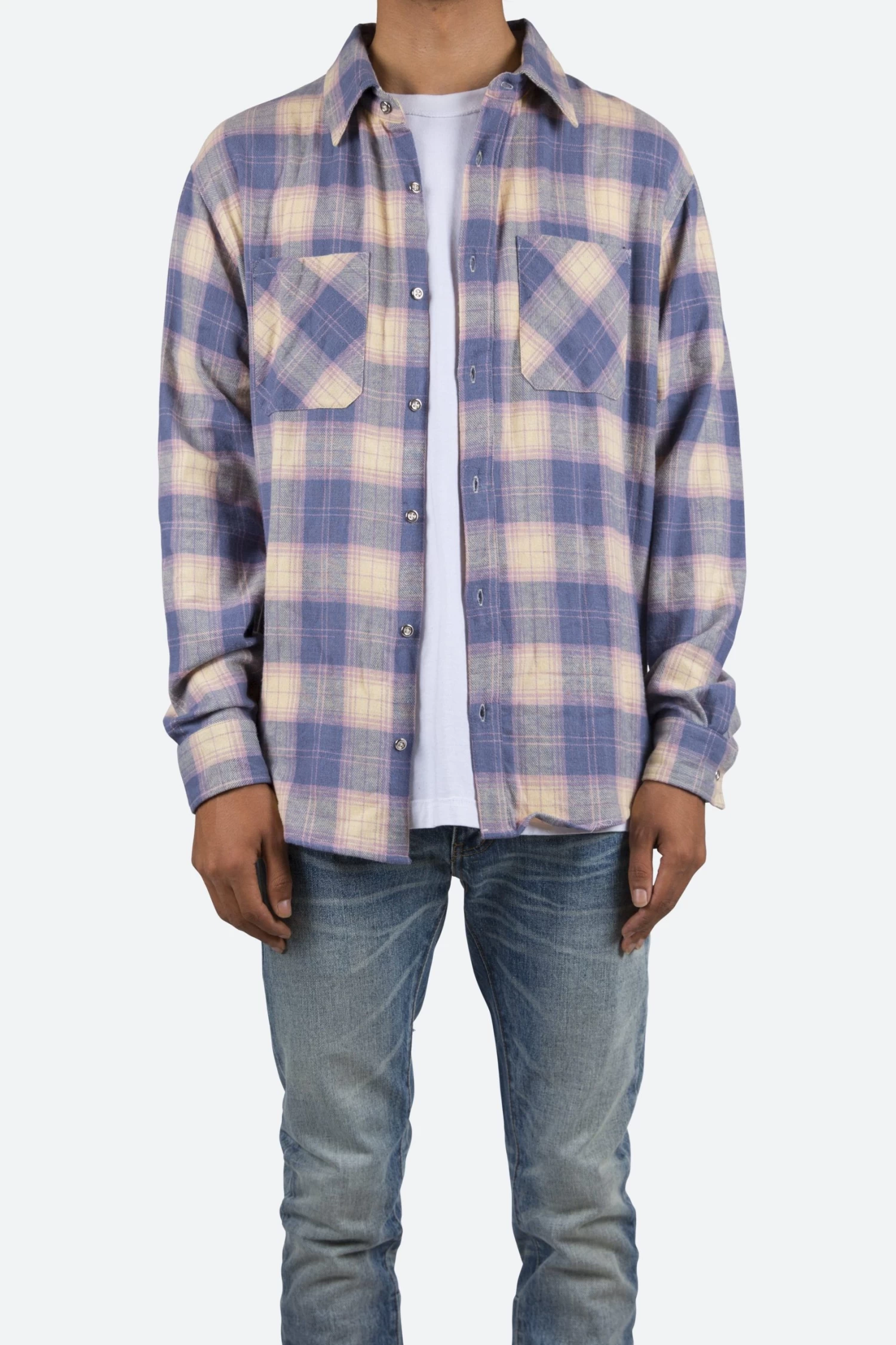 the Metal Button Flannel is designed with a relaxed fit, a scoop hemline, pleats at the wrist, an adjustable button closure, slits at the side seam, all in a cotton plaid woven fabric, and finished with metal buttons.