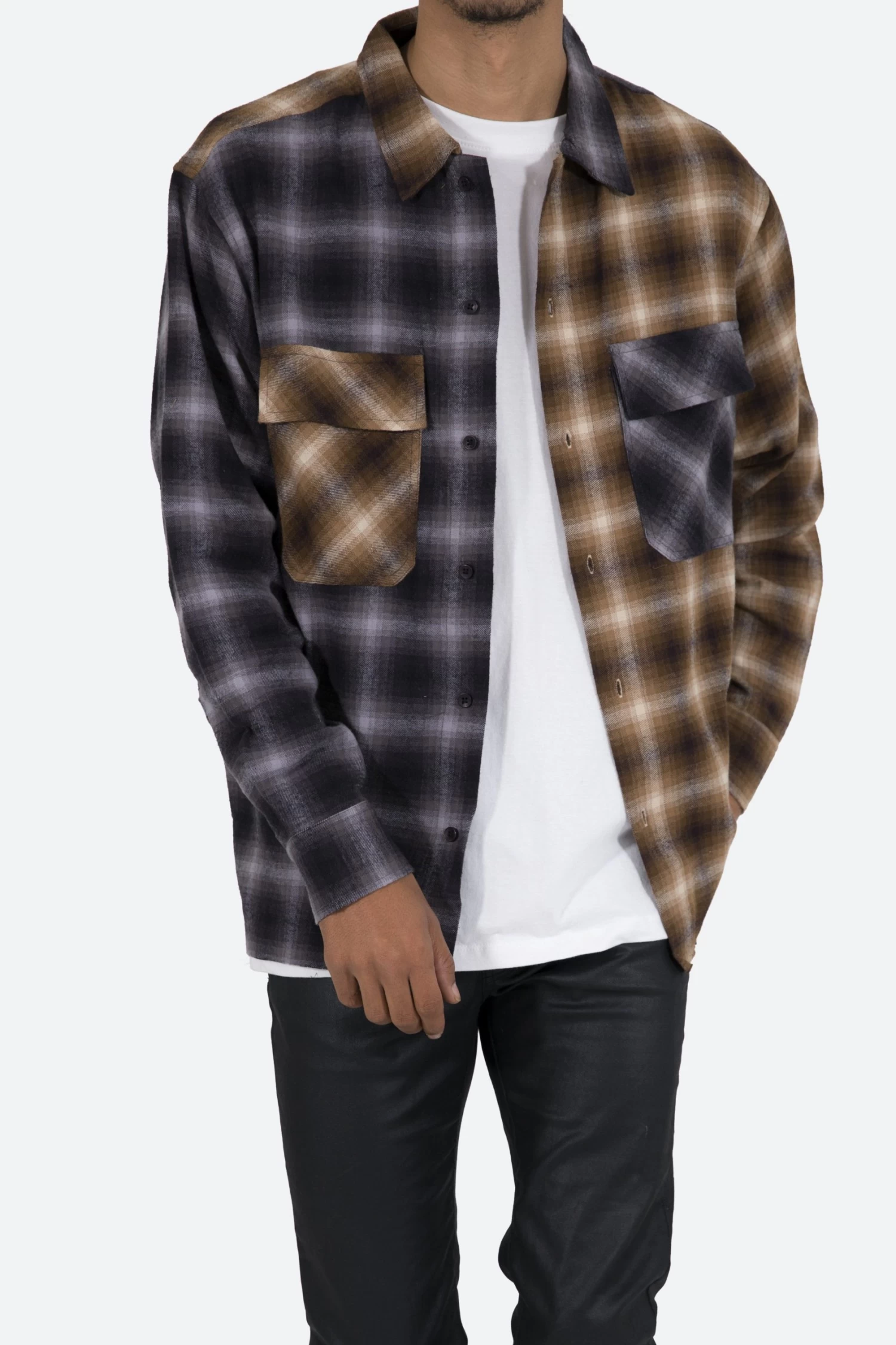 the Mismatch Flannel Shirt is designed with a relaxed fit, a flat raw edge hemline, pleats at the wrist, an adjustable button closure, all in a multi-patterned mismatched cotton plaid woven fabric.