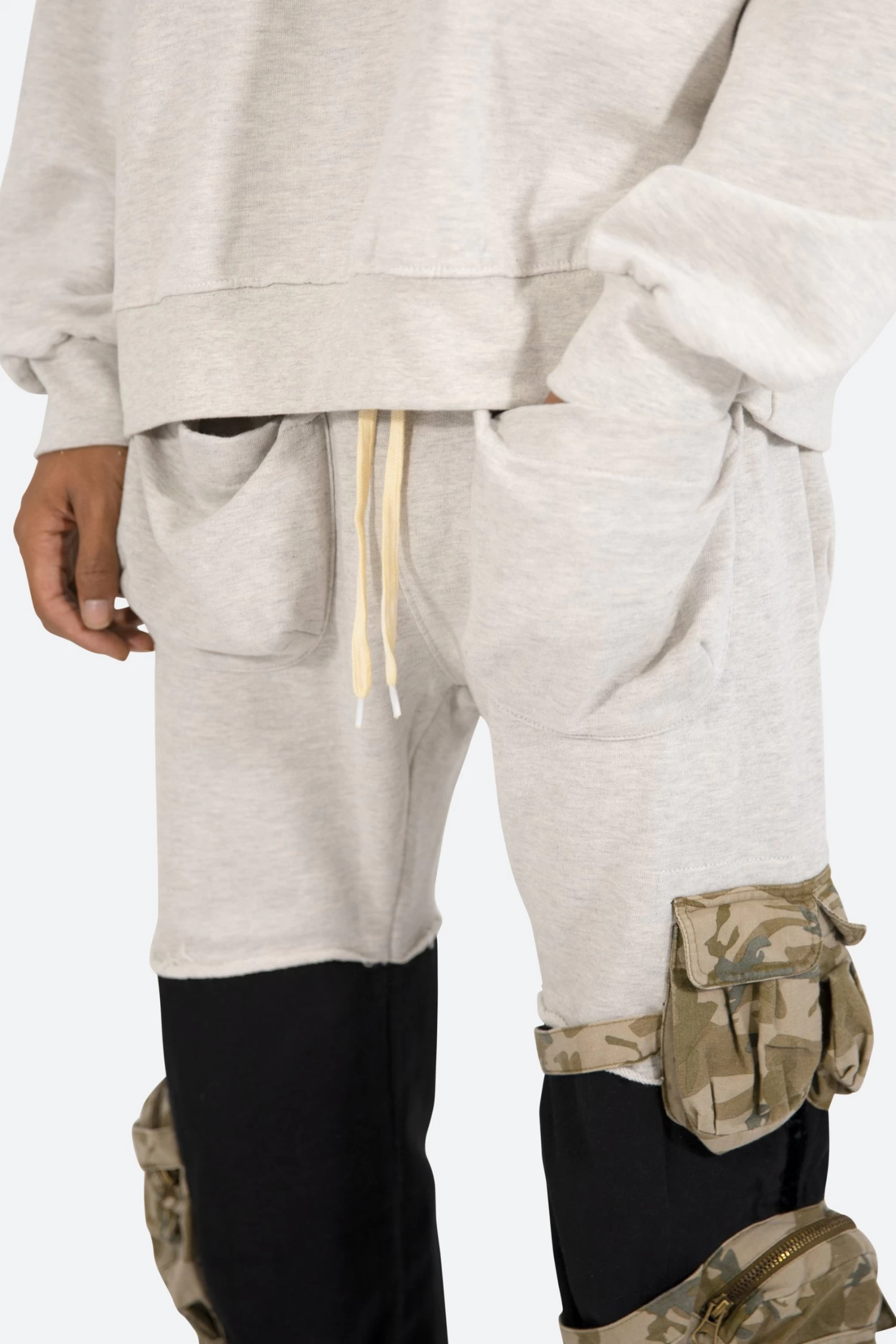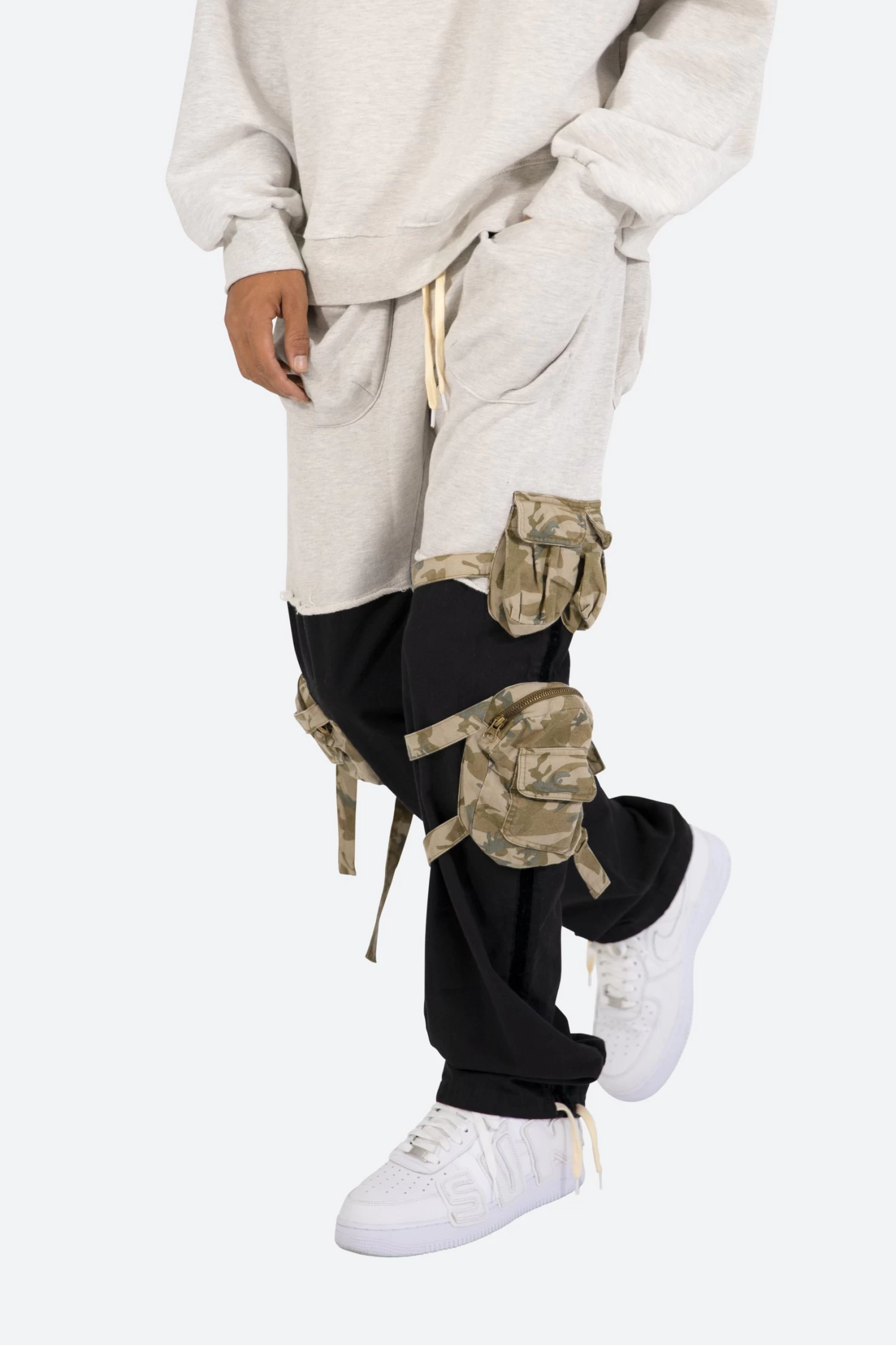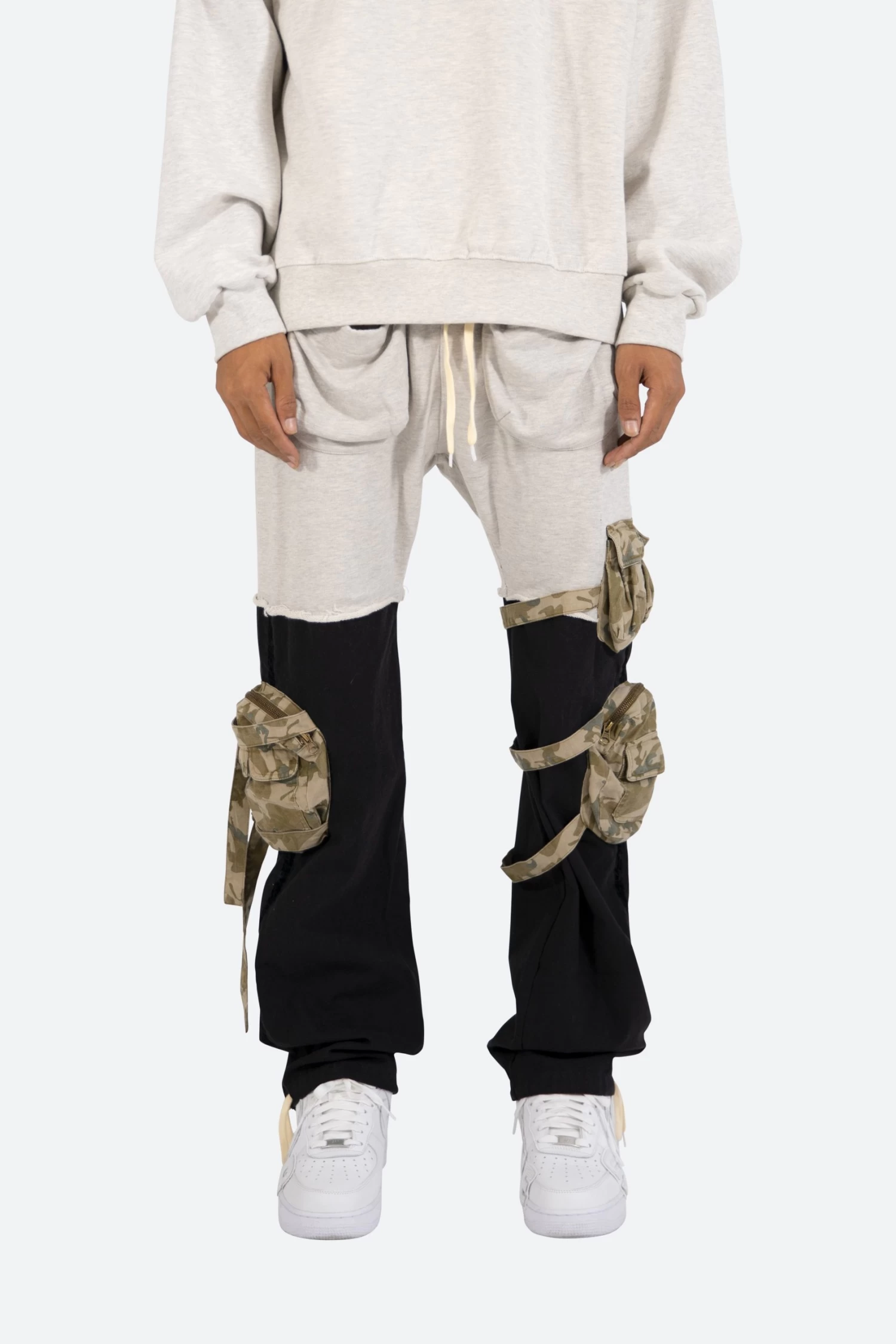 theย Mixed Materialย Cargo Pantsย areย designed with a relaxed fit throughout with black and grey french terry constructions, cargo pockets at the side seamย constructed fromย camo printed twill with straps around the legs,ย self fabric gusseted patchย pockets at the hip, and finished off with cotton drawcords at the leg openings.