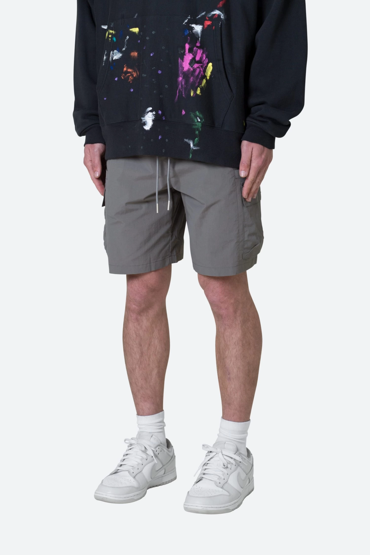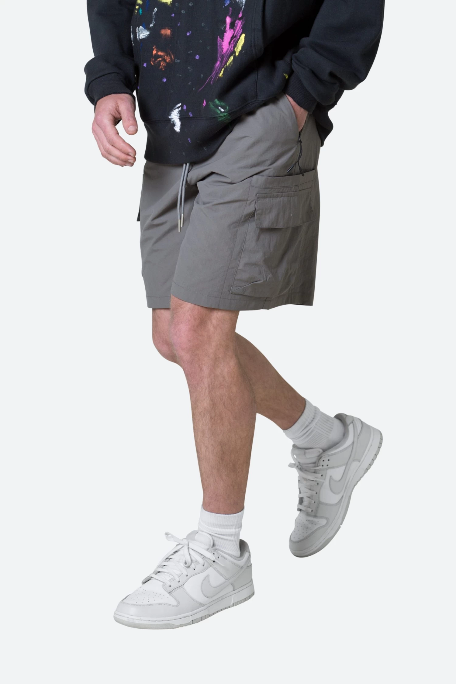 the Nylon Side Cargo Shorts are designed in a synthetic fabric and feature a cargo pockets on the outseam, and finished with a tonal drawcord.