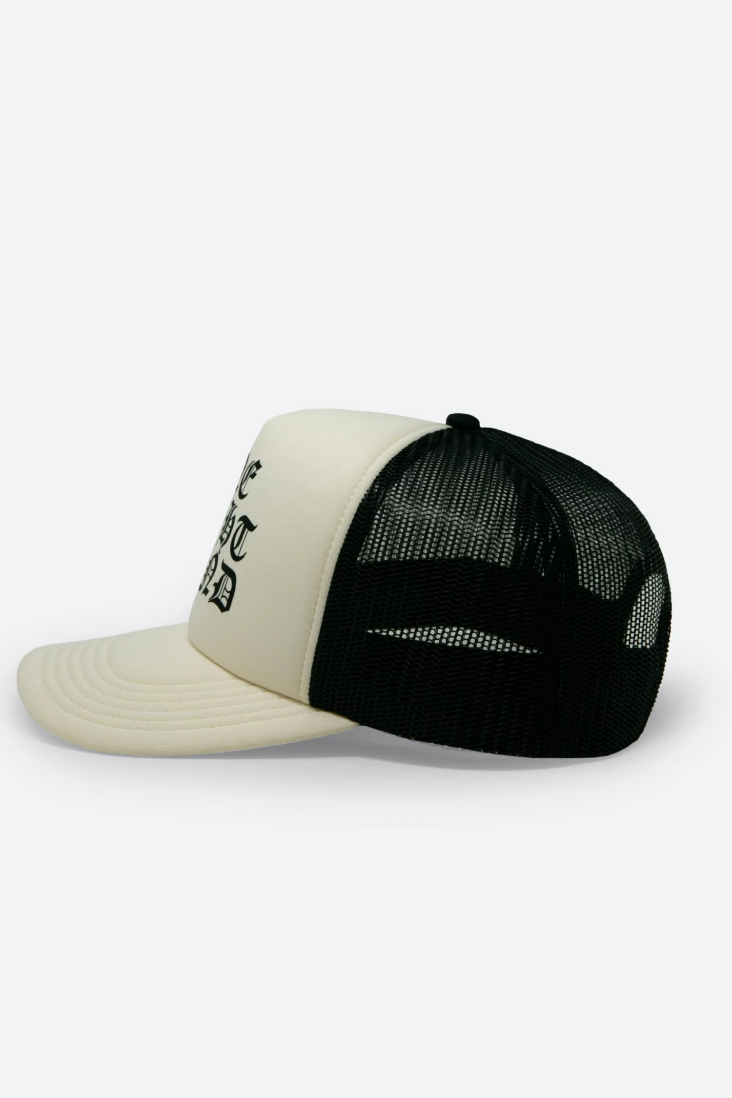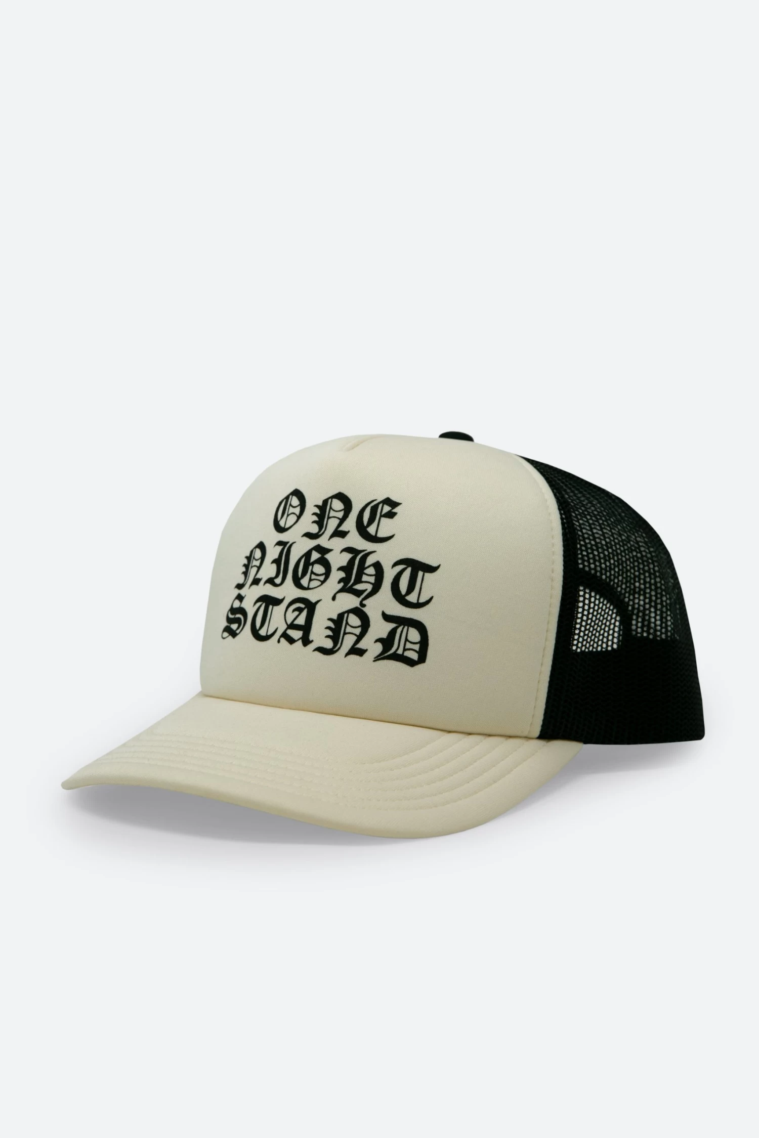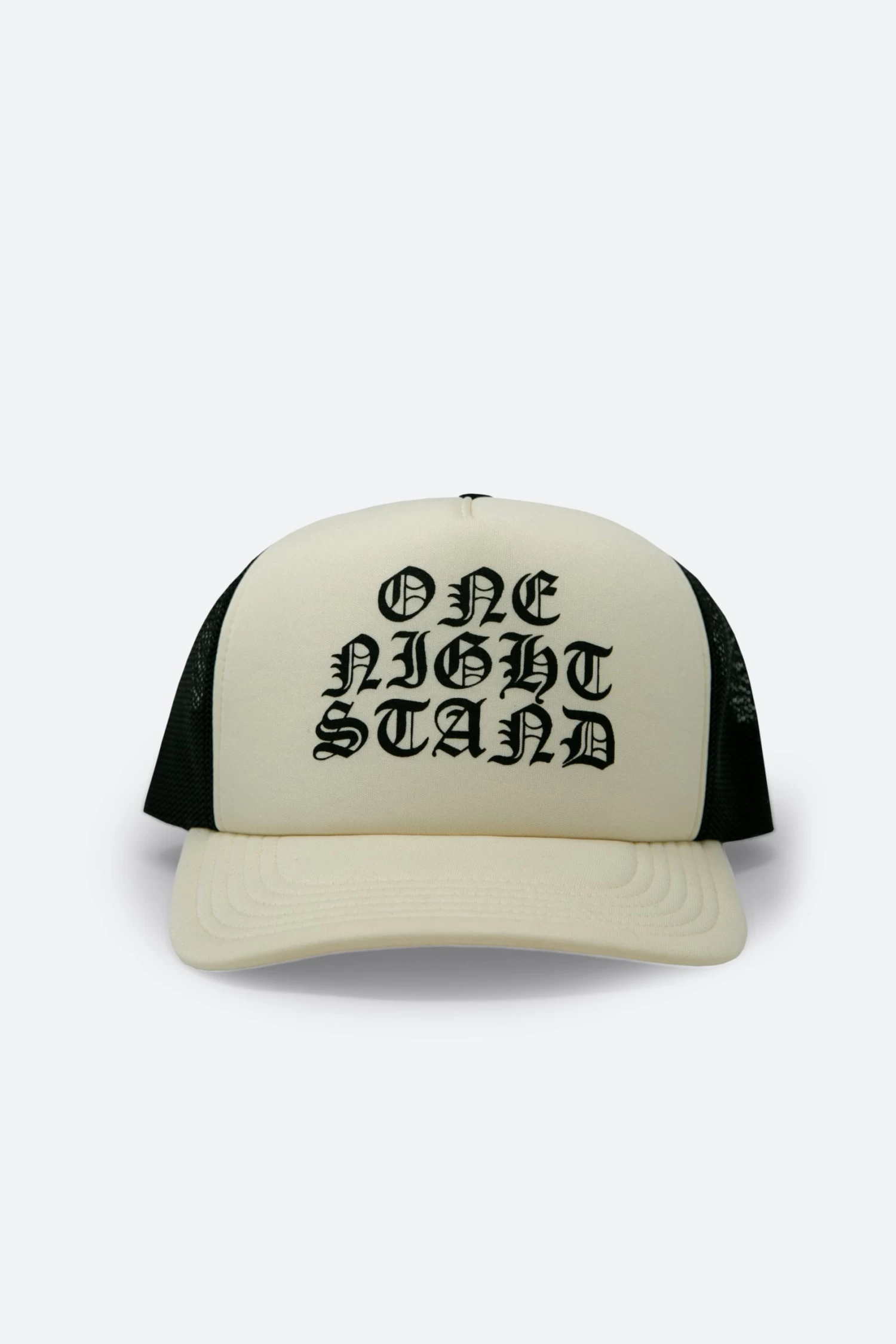 the One Night Stand Trucker Cap is constructed from a neoprene front panel and brim, mesh back, and finished with a screen print at the front.