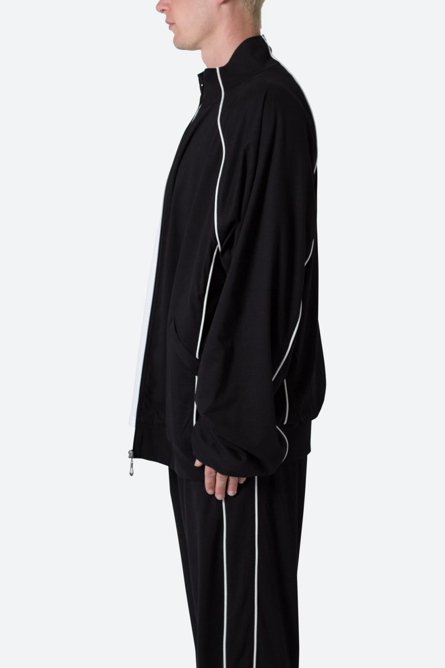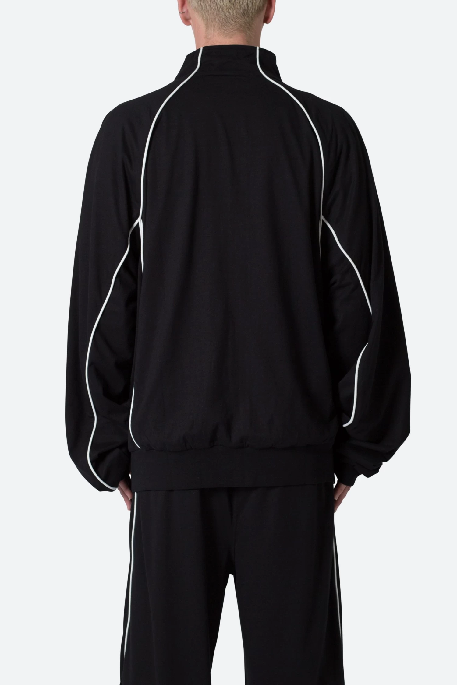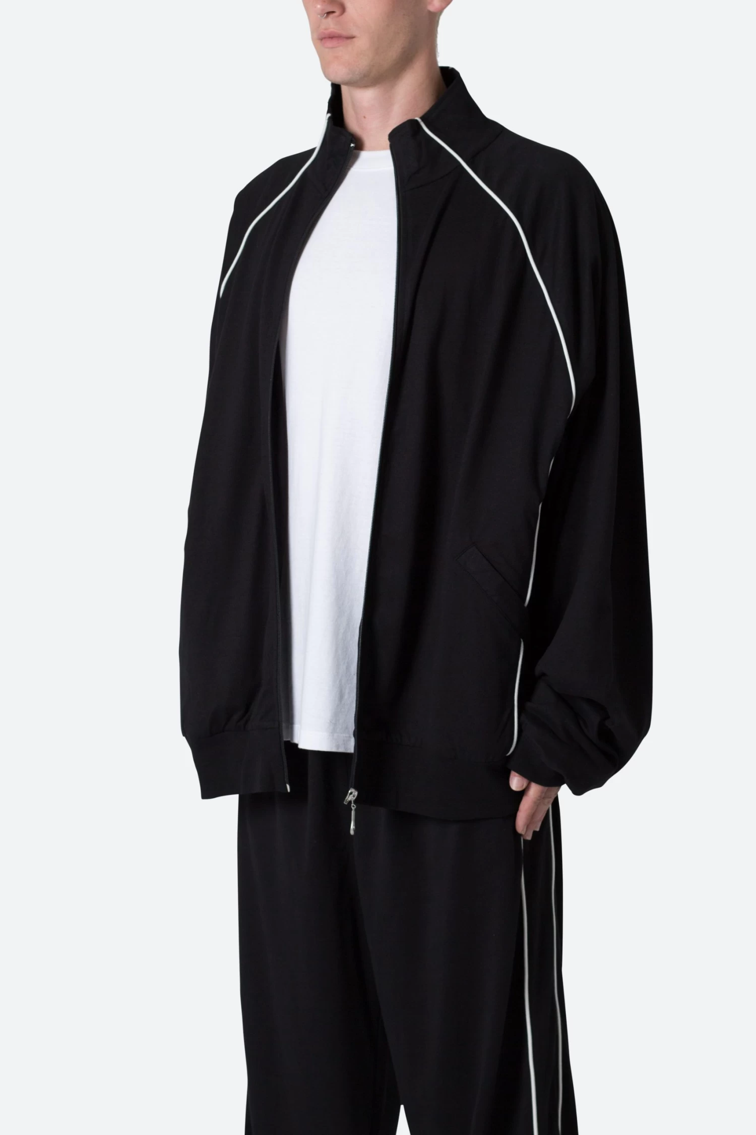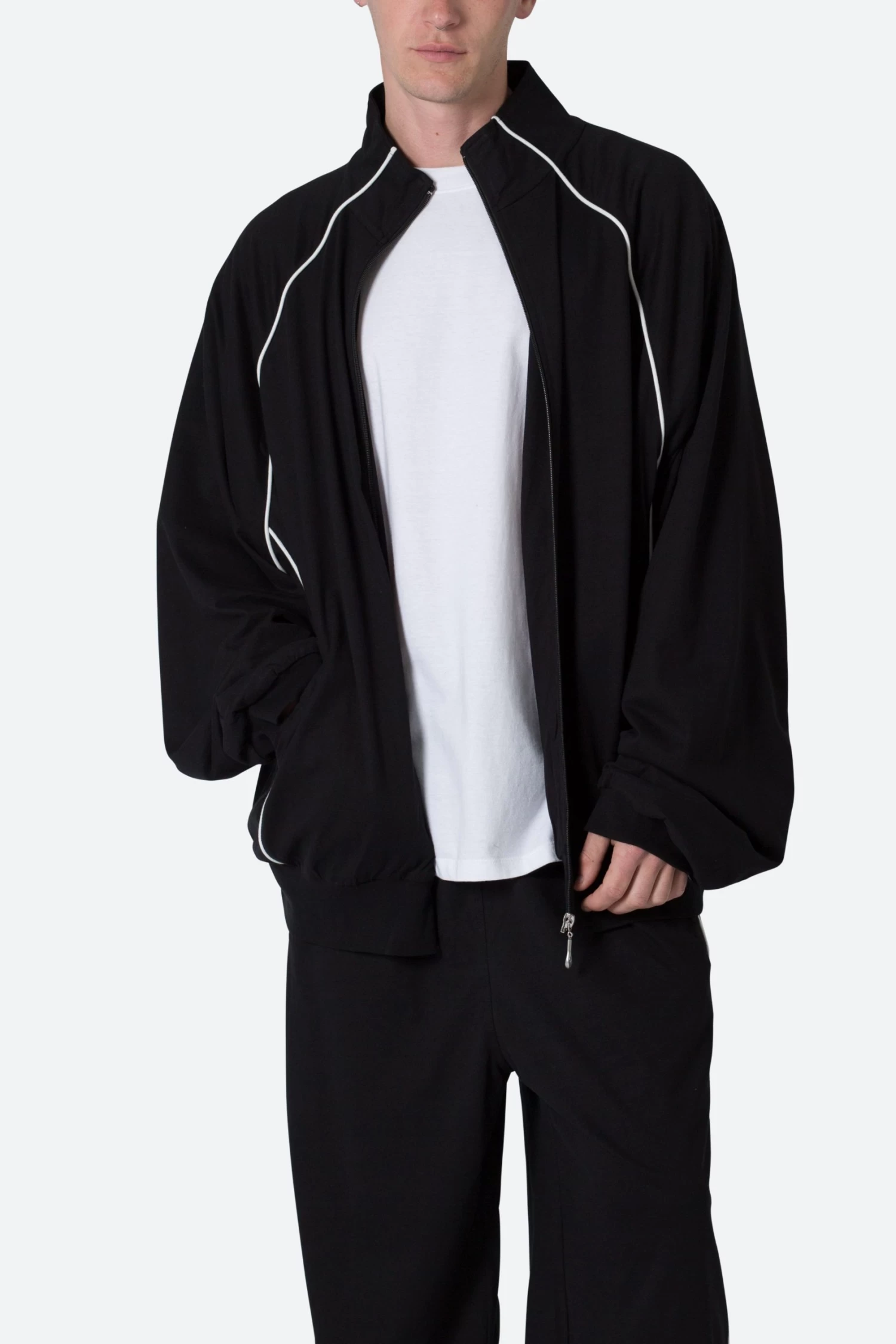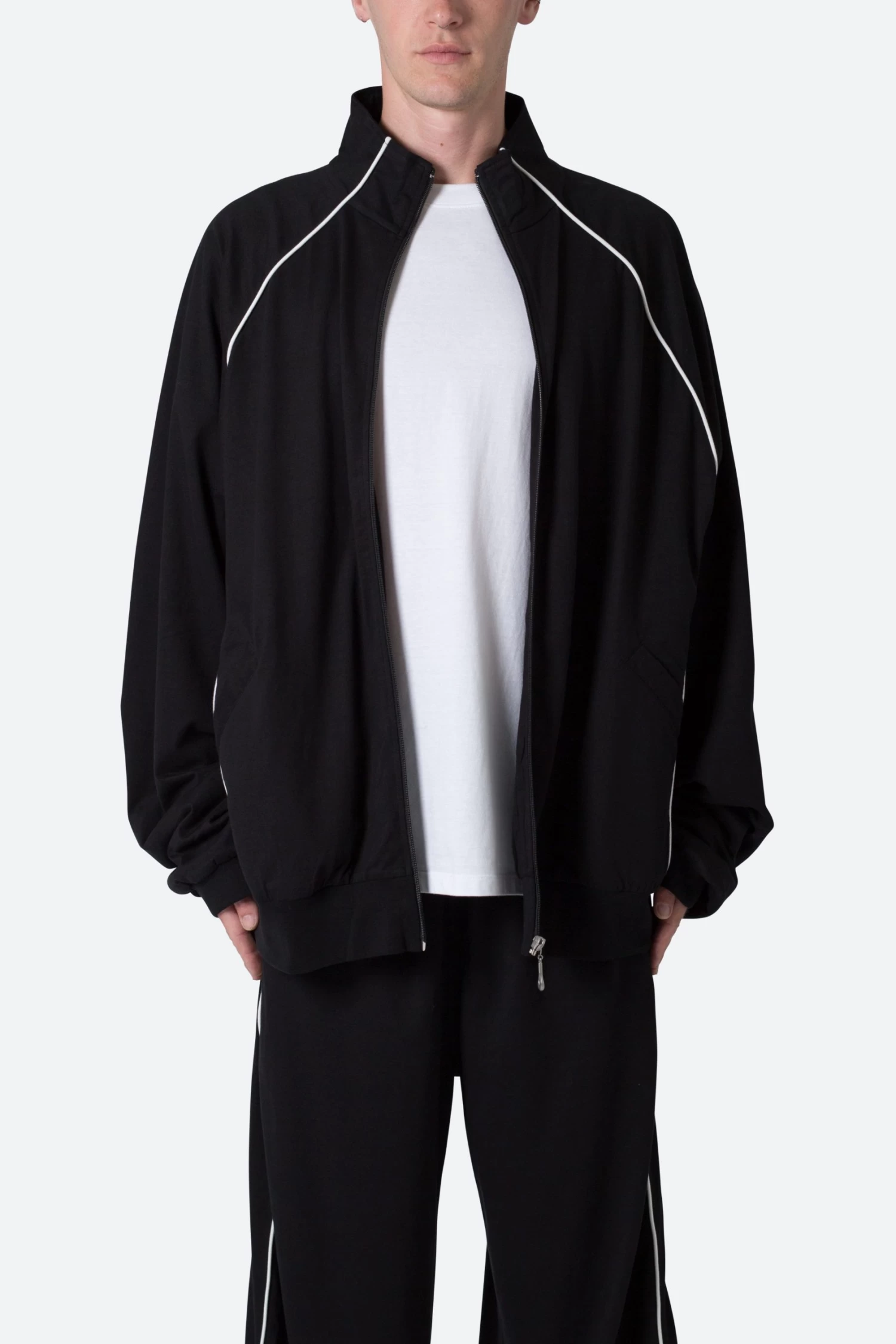 the Oversized Jersey Track Jacket is designed with a custom-developed polyester-jersey fabric, contrast piping at the raglan sleeves, ribbing at the wrists and waist, and finished with a zipper placket.