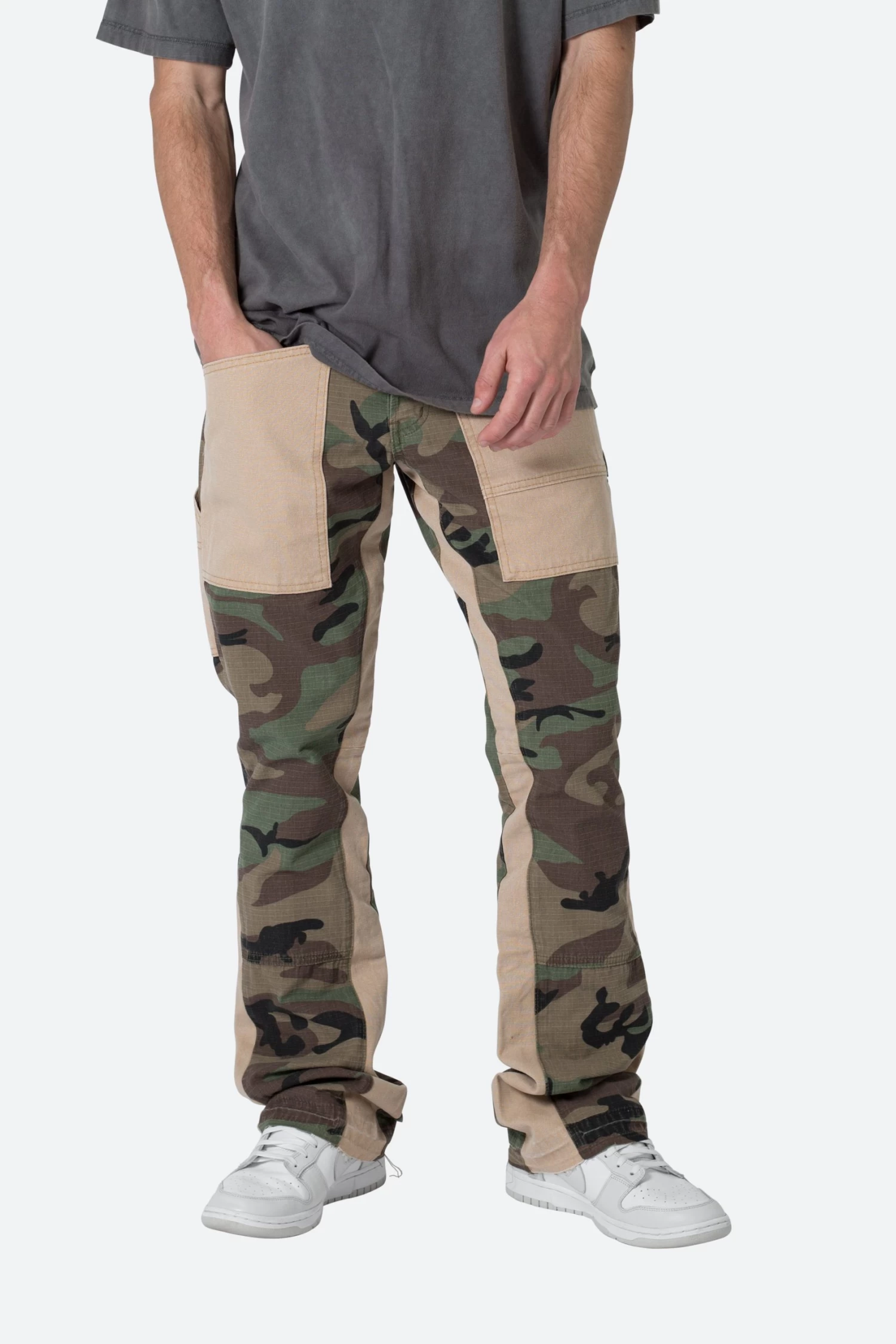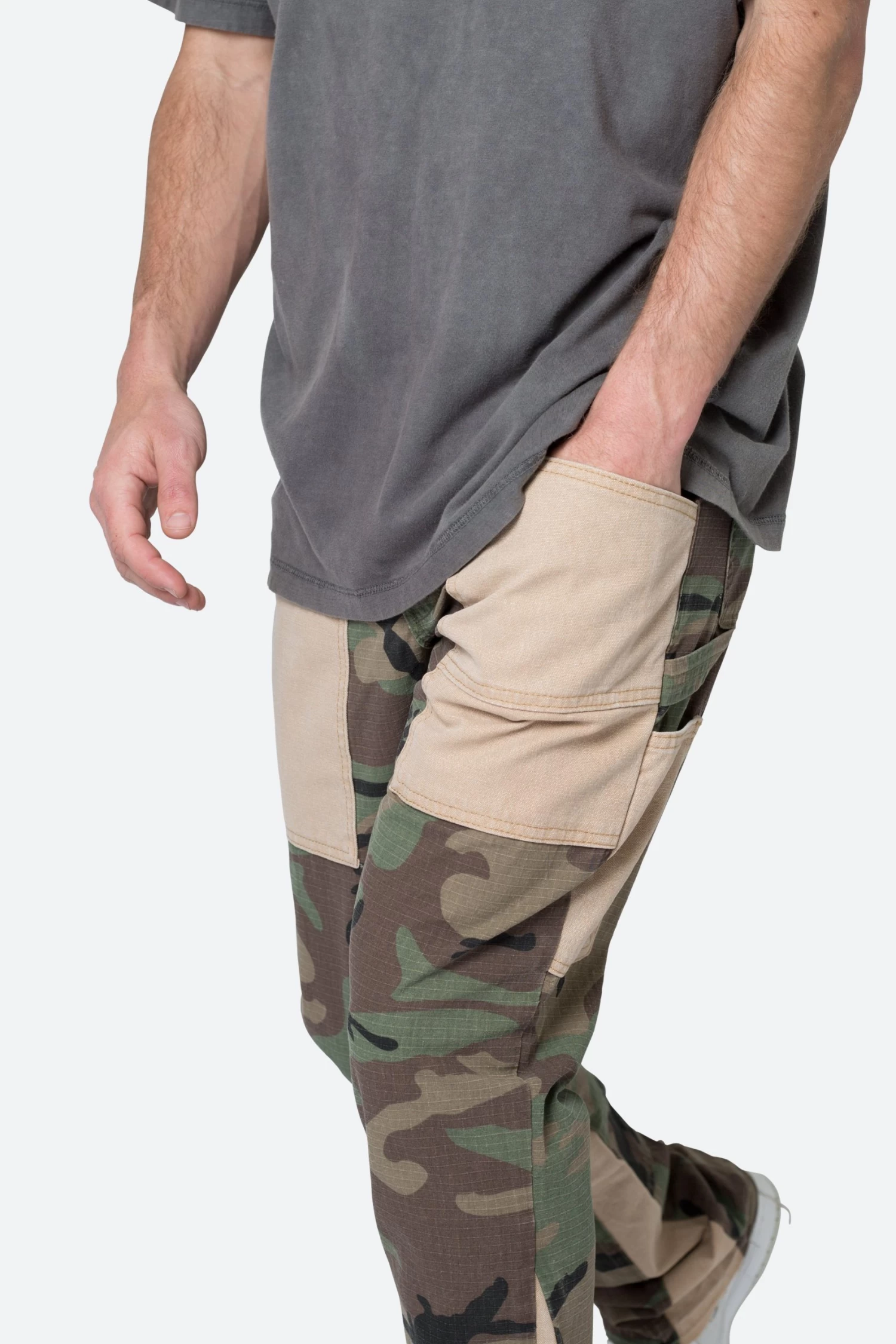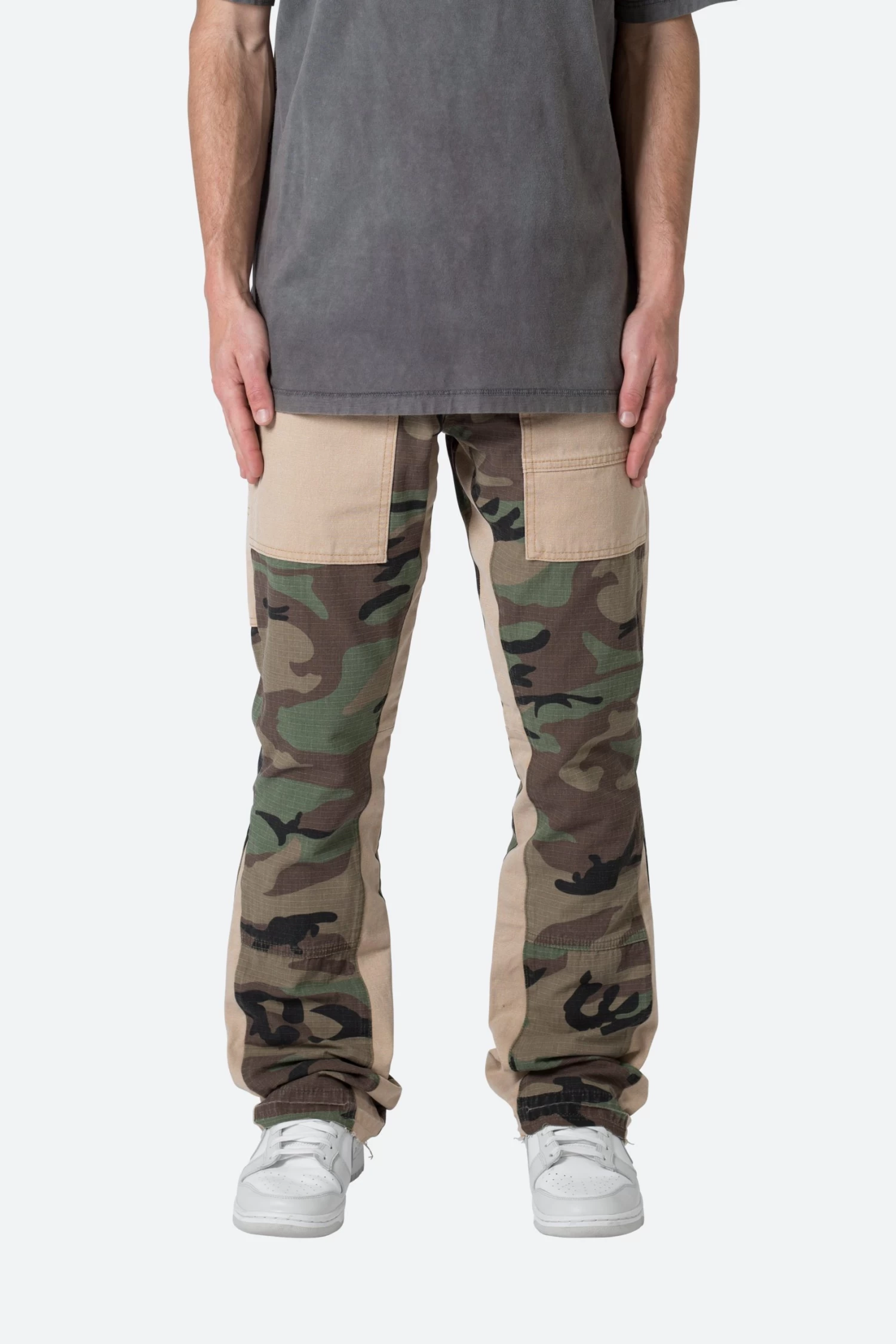 the Painter Flare Denim are constructed from a heavyweight camo cotton fabric, contrasting patch pockets on the front and rear, and finished with panels at the leg opening for a flare at the bottom.