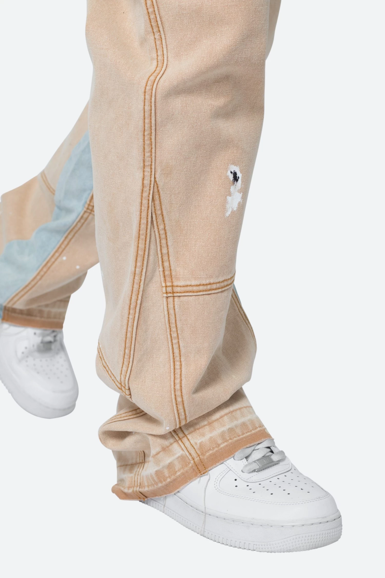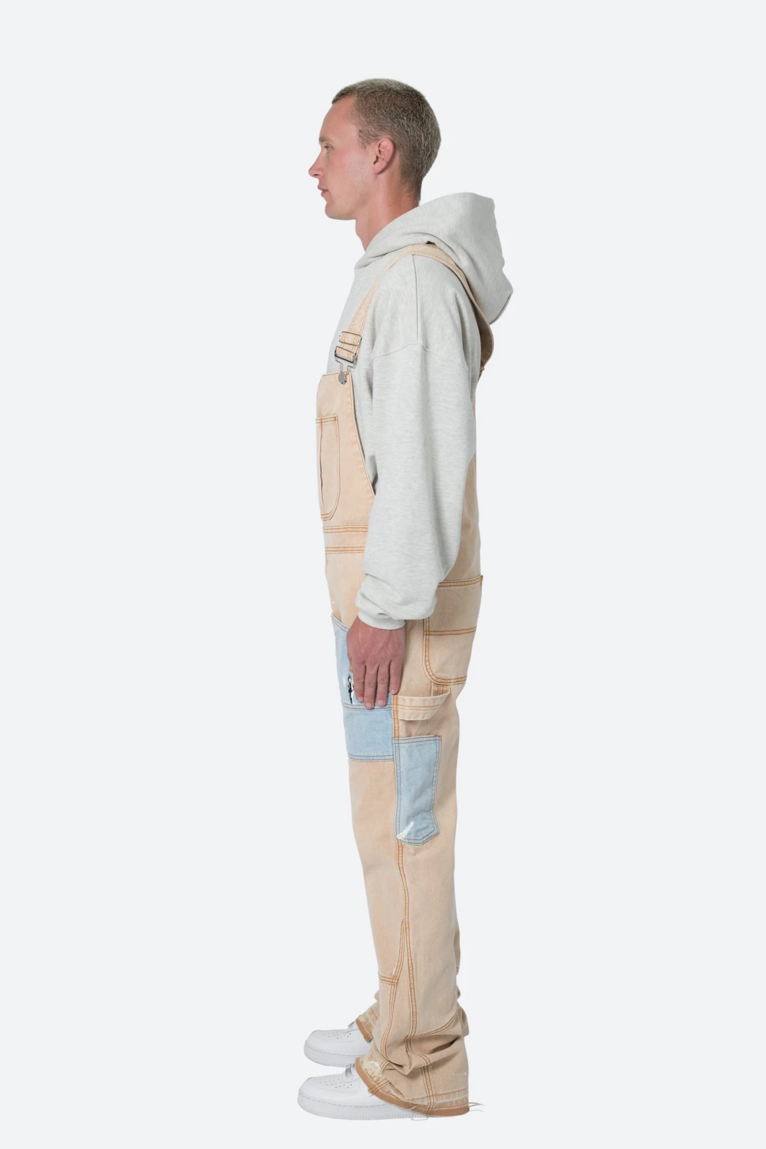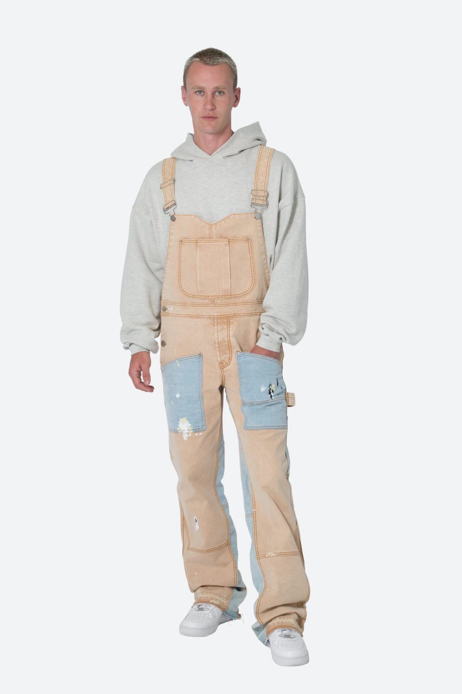 the Painter Flare Overalls are constructed from a heavyweight cotton fabric, pockets on the chest and at the waist, snap closures at the hip, straps constructed from self fabric, metal eyelet closures, panels at the leg opening for a flare at the bottom.