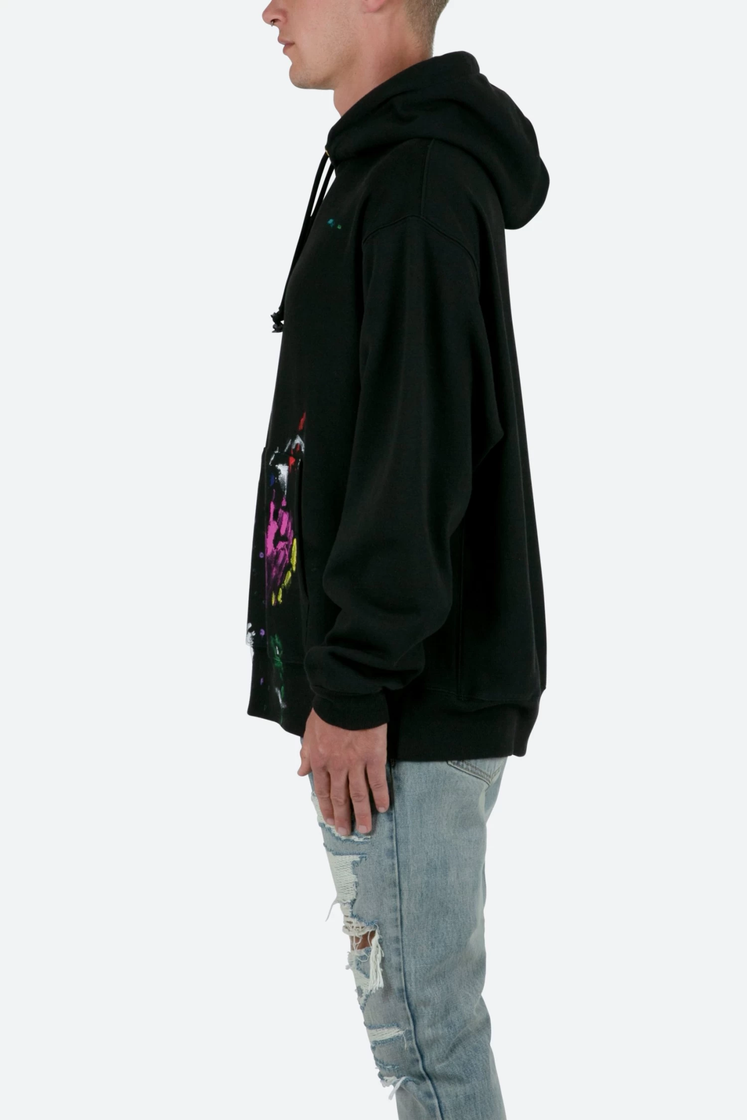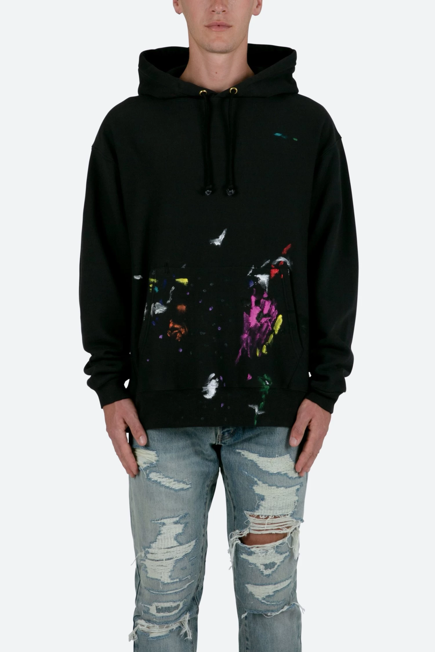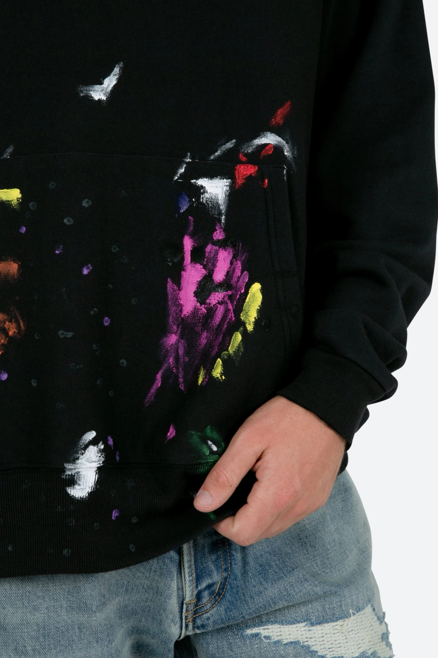 theย Painter Hoodieย features aย relaxed fit, a front pouch pocket, and body matched ribbing at the waist and wrists, ribbing is cut at the wrists, aย body matchedย cotton drawcord and finished with multi-colored paint splatter throughout.