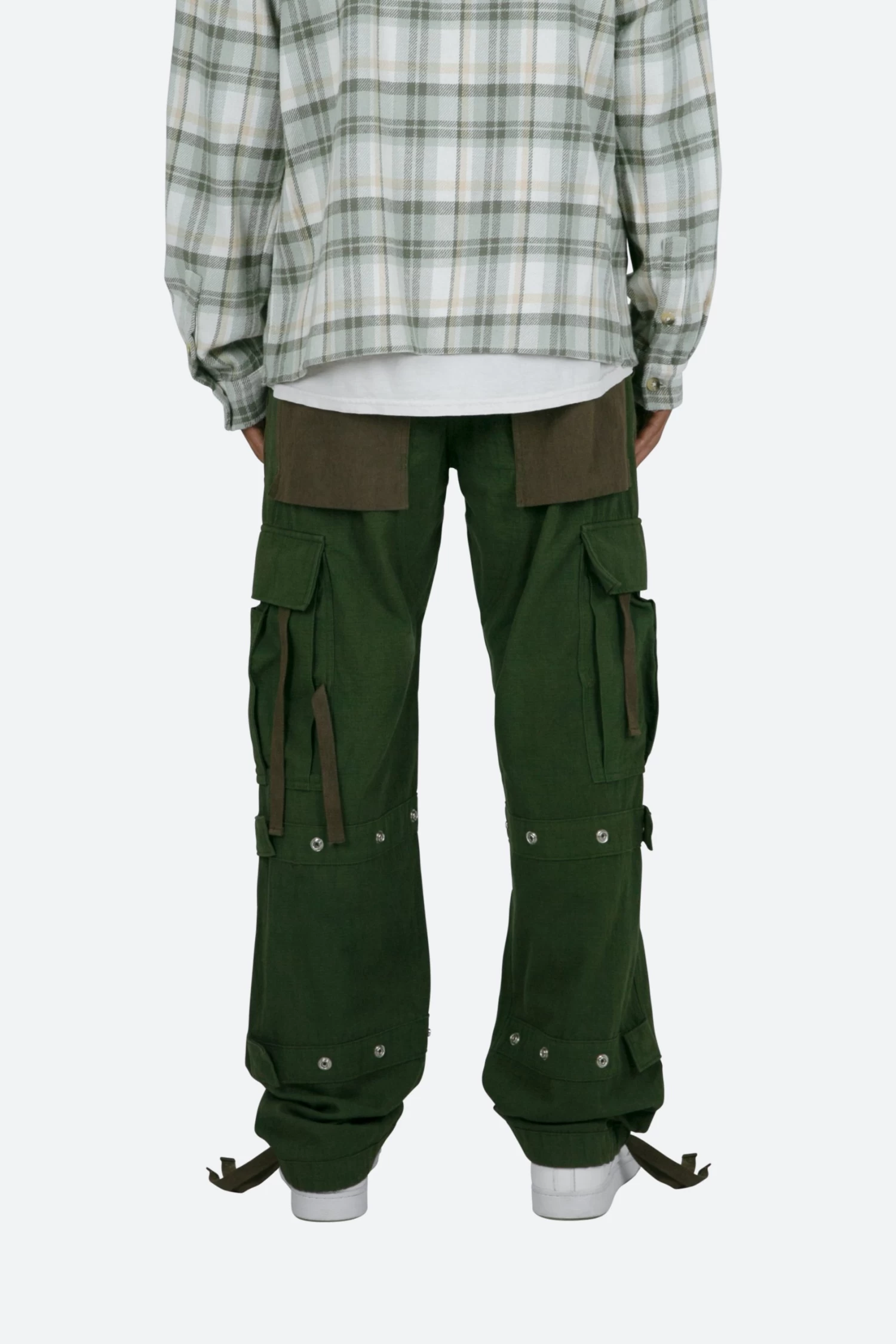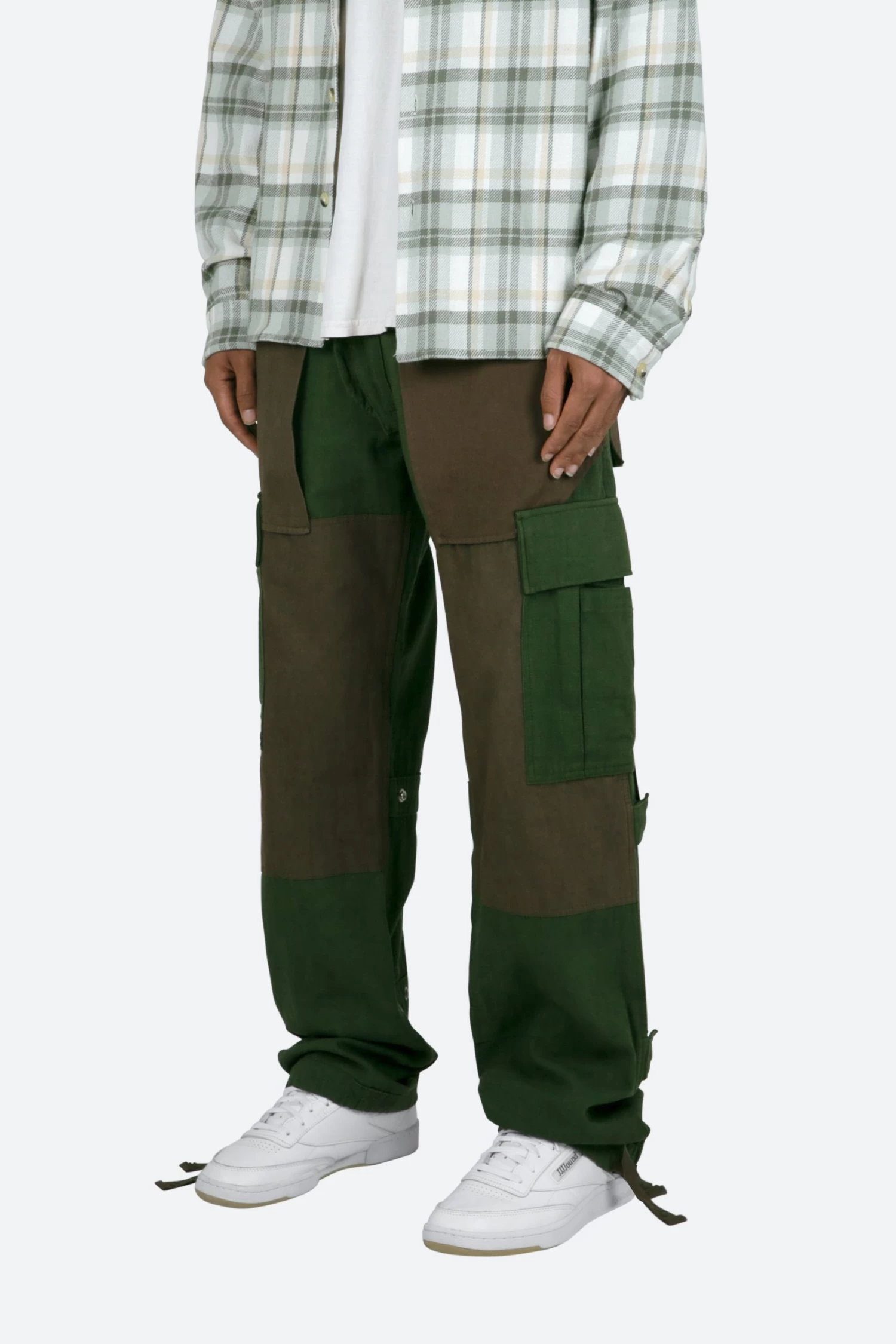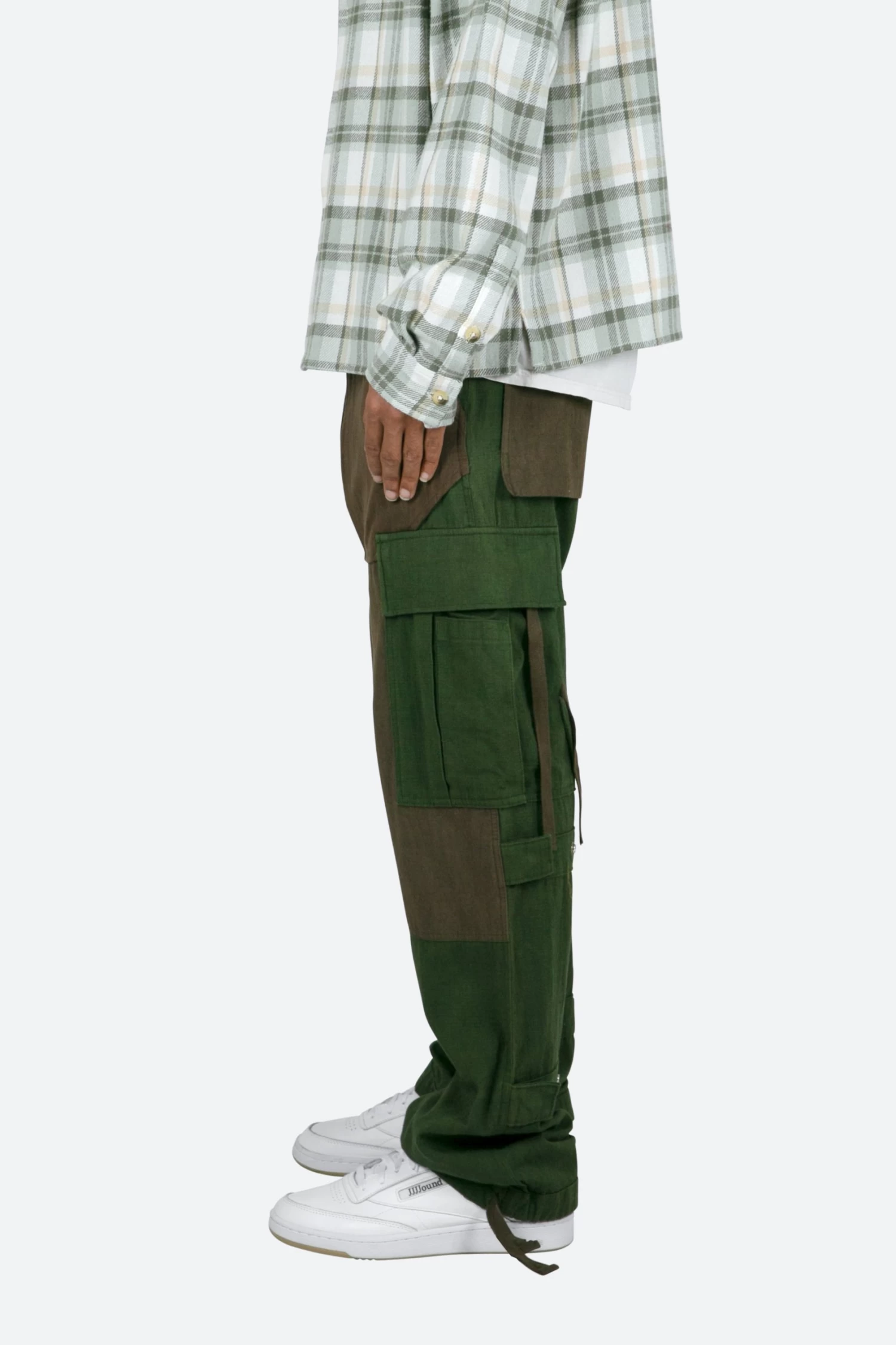 the Paneled Cargo Pants are designed with a relaxed fit throughout with cargo pockets at the side seam in contrasting colors, patch pockets at the hip, straps at the outside of the leg opening, and finishing off with a vintage wash.