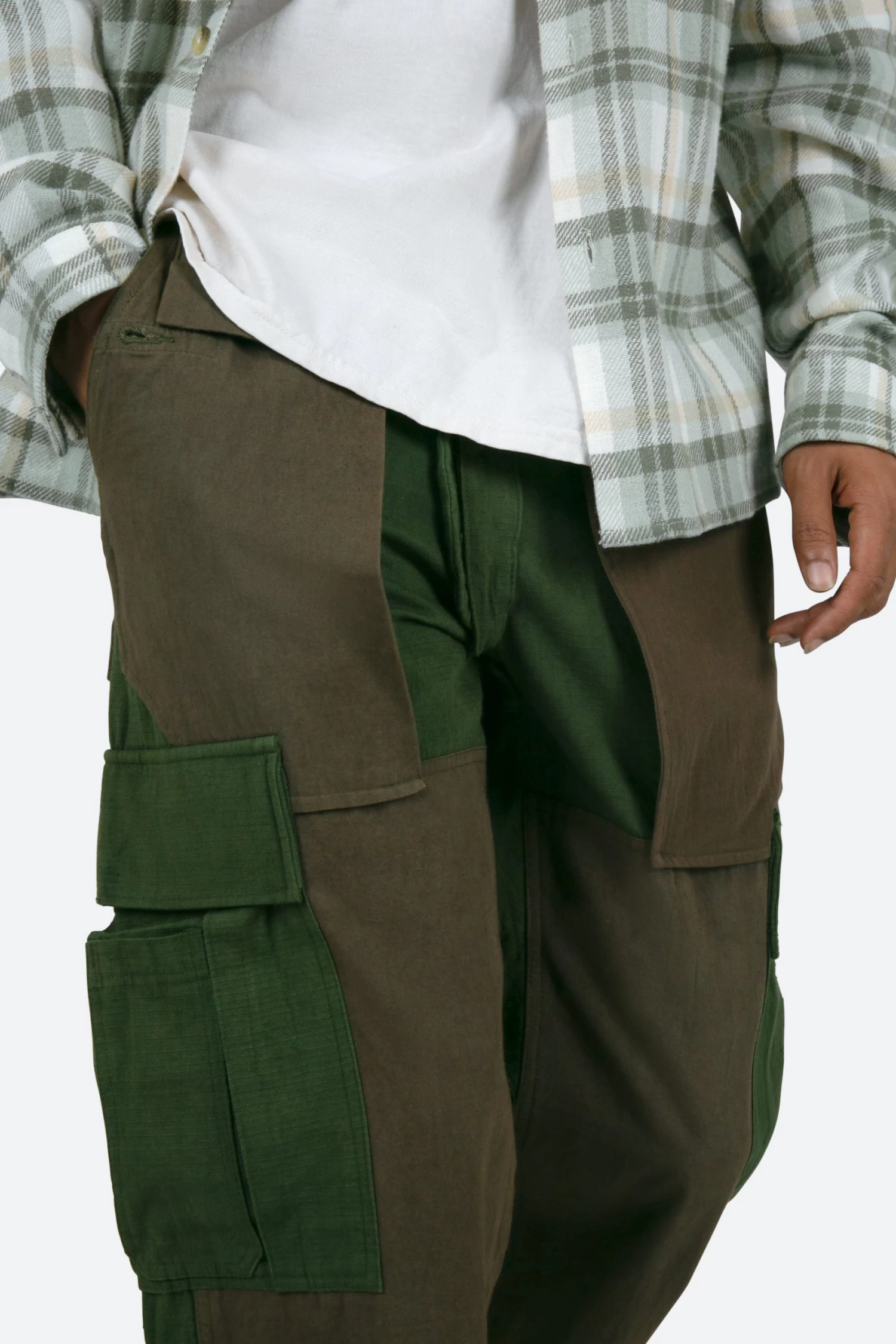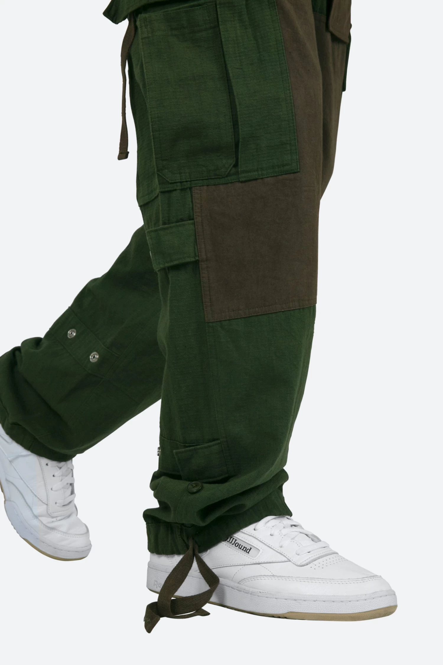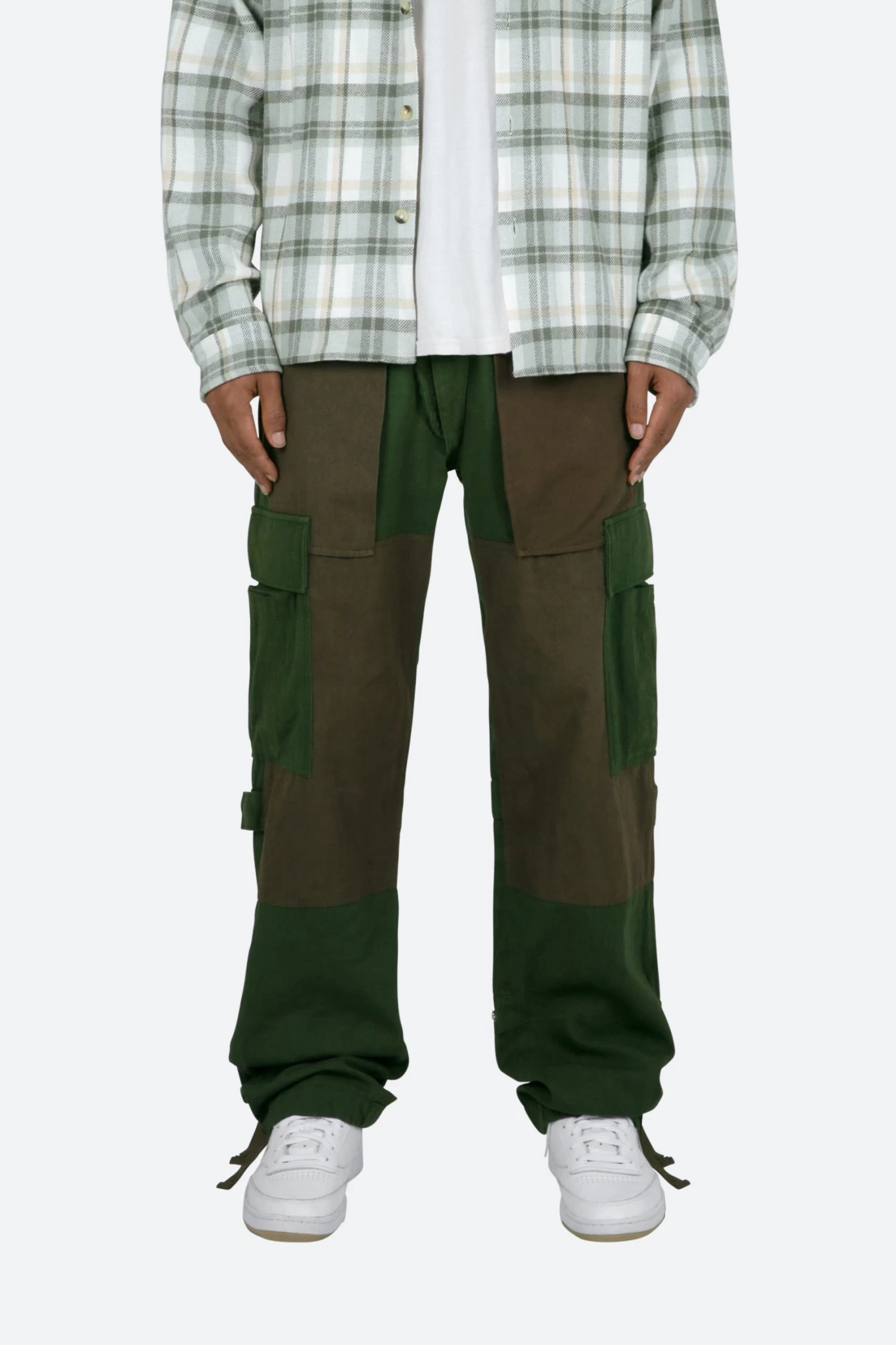 the Paneled Cargo Pants are designed with a relaxed fit throughout with cargo pockets at the side seam in contrasting colors, patch pockets at the hip, straps at the outside of the leg opening, and finishing off with a vintage wash.