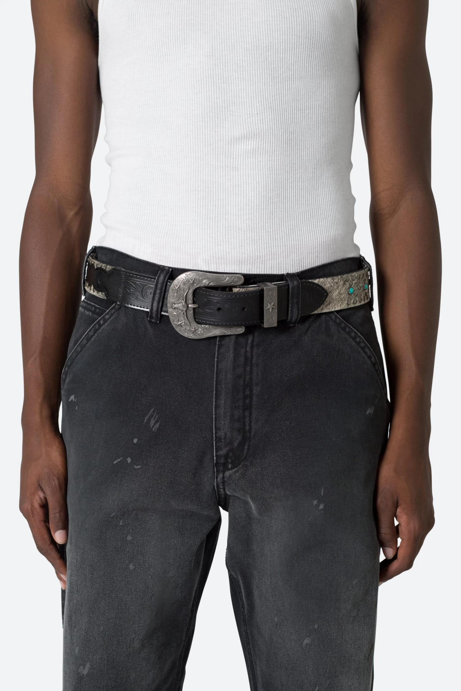 The Patterned Turquoise Studded Belt is made from natural leather and features intricate Western design motifs on the metal buckle, end tip and loop, with stud and turquoise embellishment throughout.