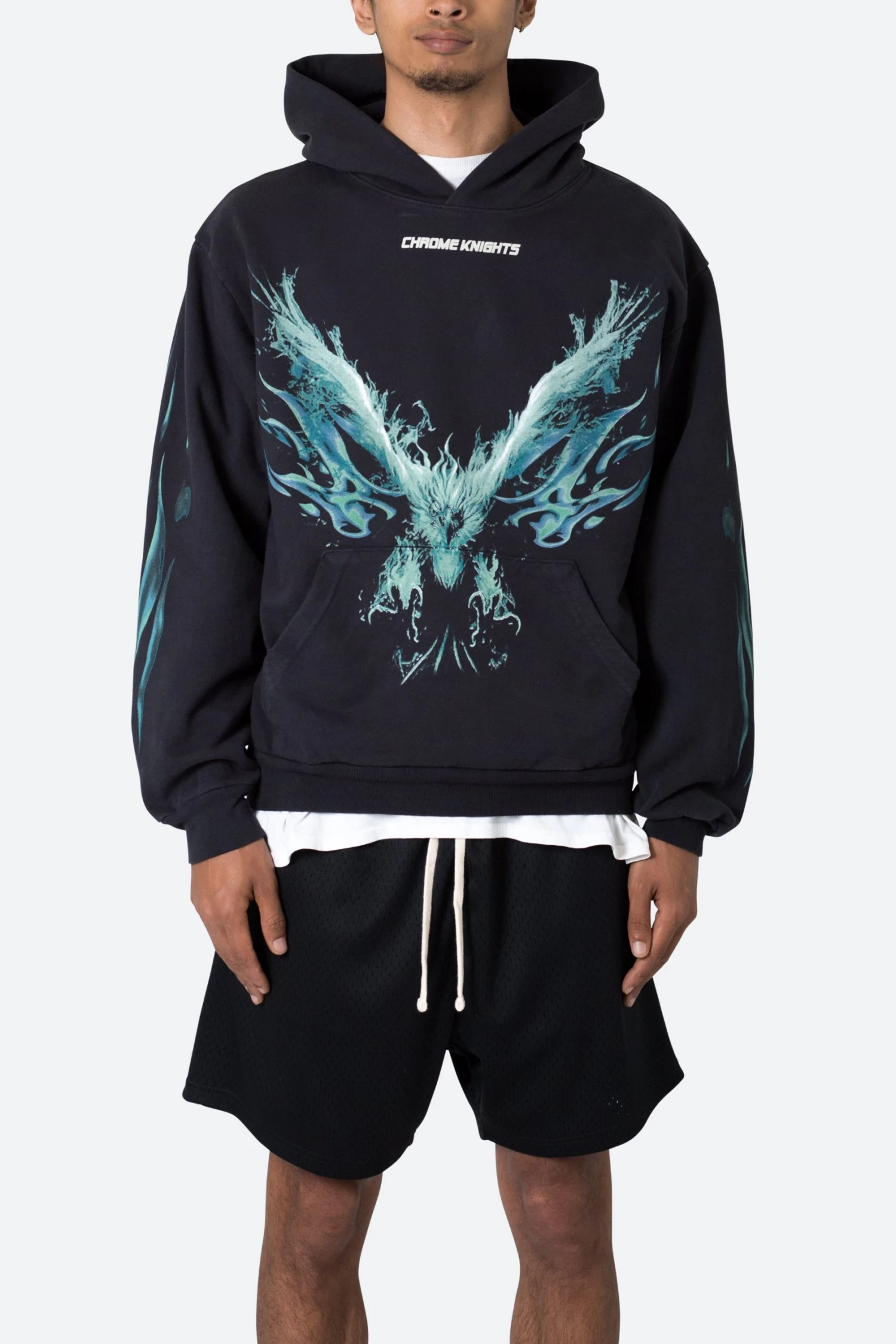 The Phoenix Hoodie features a standard fit, a front pouch pocket, and body matched ribbing at the waist, side seam, and wrists, finished with a multi color print on the chest and sleeves, all on a made in the USA blank.