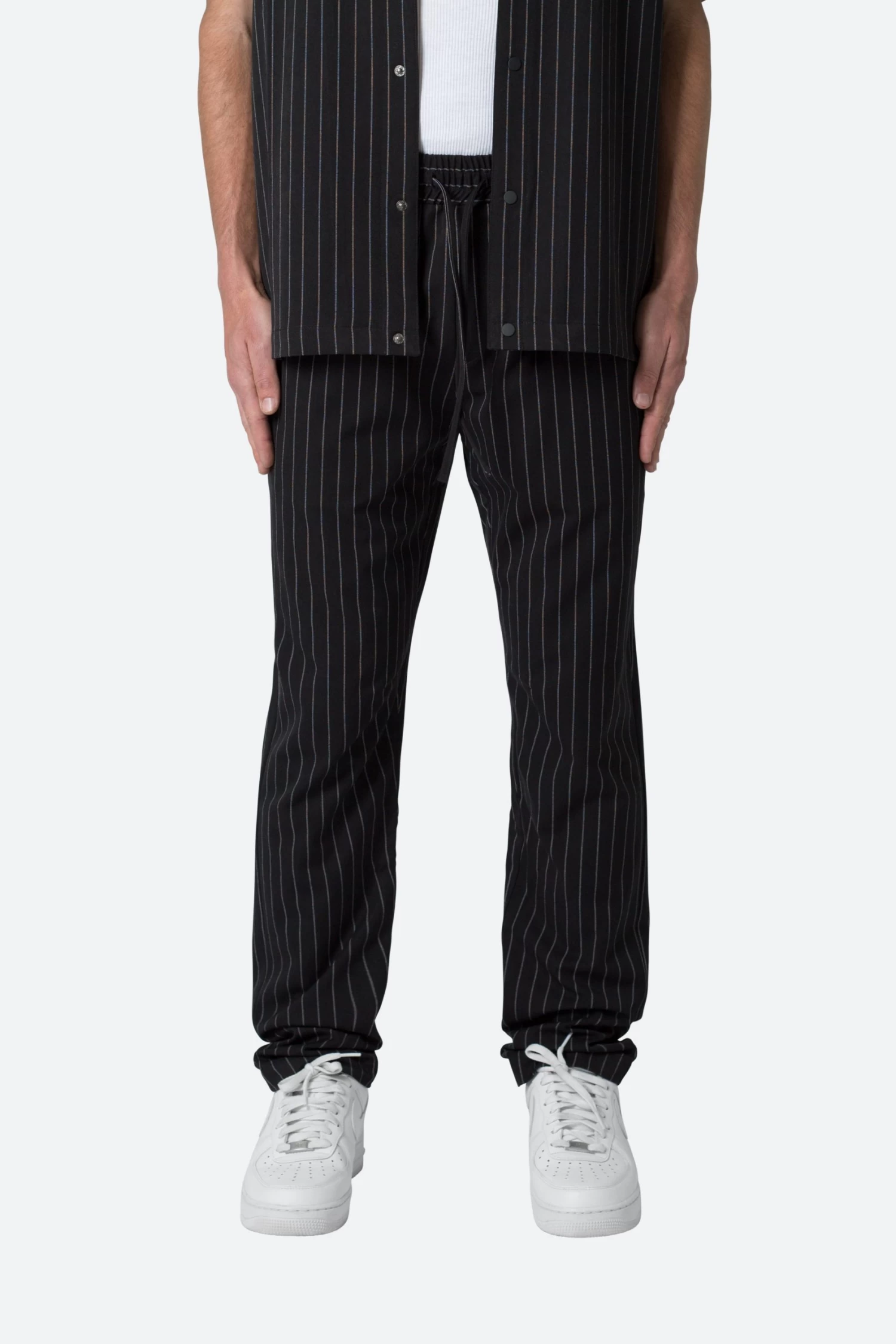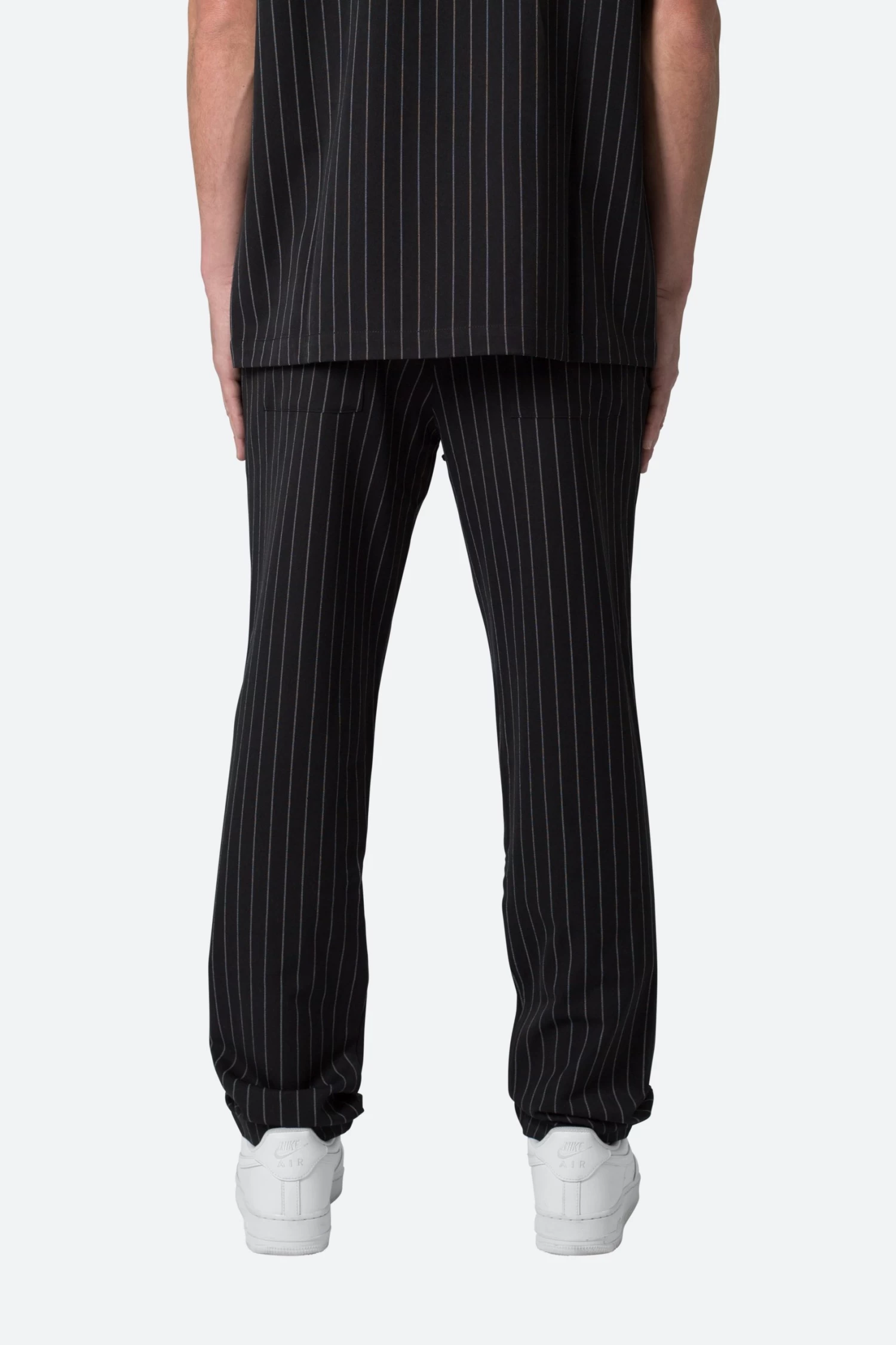 the Pinstripe Drawcord Pants are designed with a relaxed fit throughout, featuring classic trouser details, constructed from a custom developed fabric, and finished with a welt pockets.